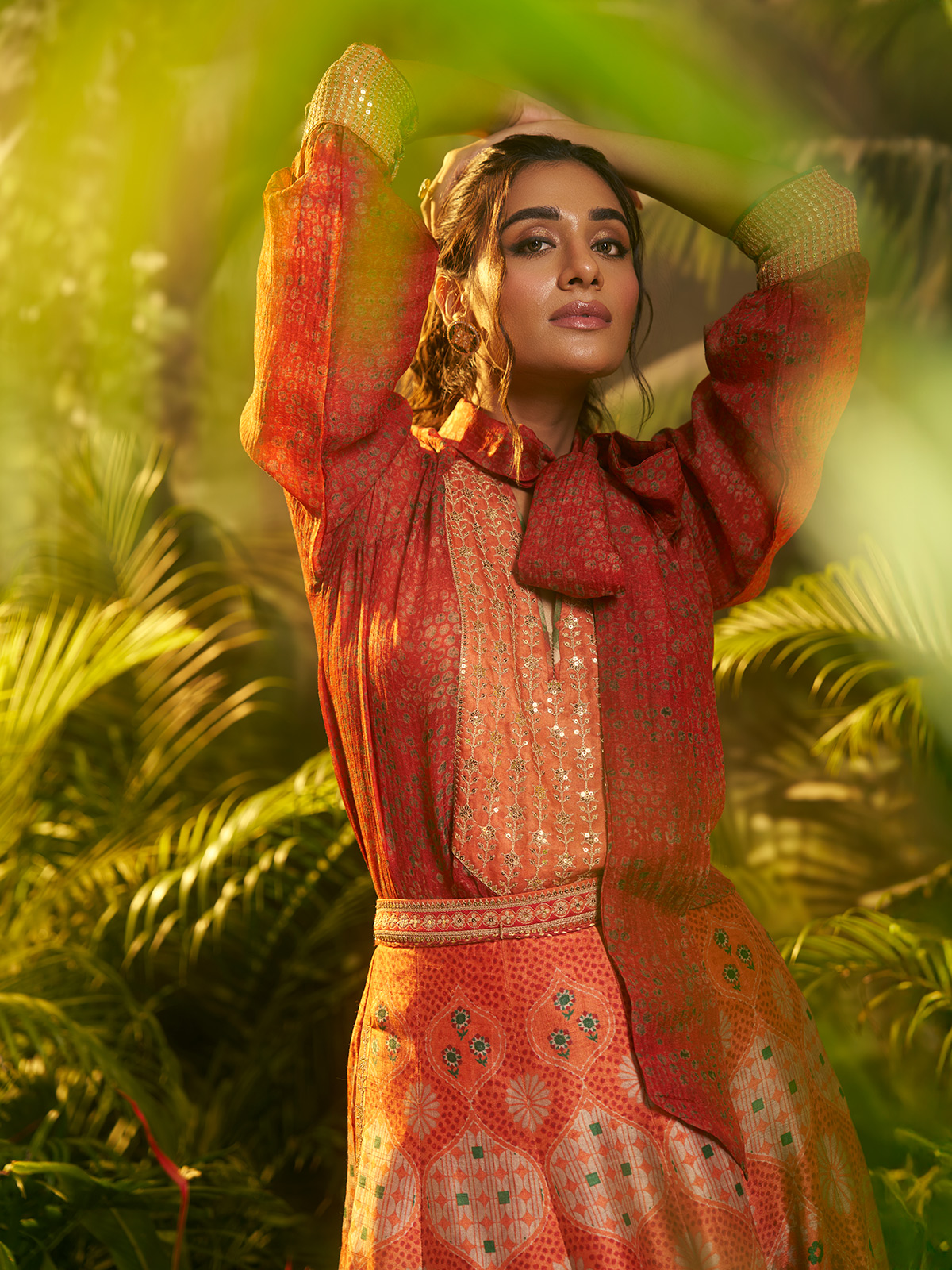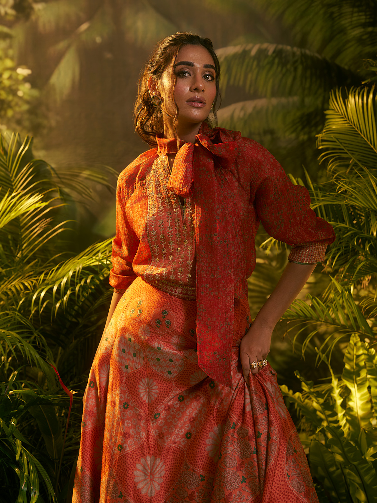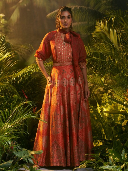 Radiant brilliance shines in this red silk lehenga choli, crafted for bridal opulence. The printed fabric glows with resham and sequins, weaving traditional artistry into every detail. A V-neckline with quarter-sleeved shirt-style choli enhances its charm, creating a majestic choice for wedding occasions filled with festivity and regal allure.