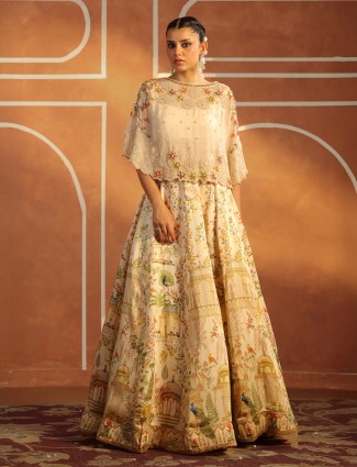 Gentle as dawn light, this cream silk printed lehenga choli radiates quiet elegance. Sequins and beads add a refined sparkle to its serene charm. A graceful choice for weddings, its understated design blends subtle beauty with festive poise.