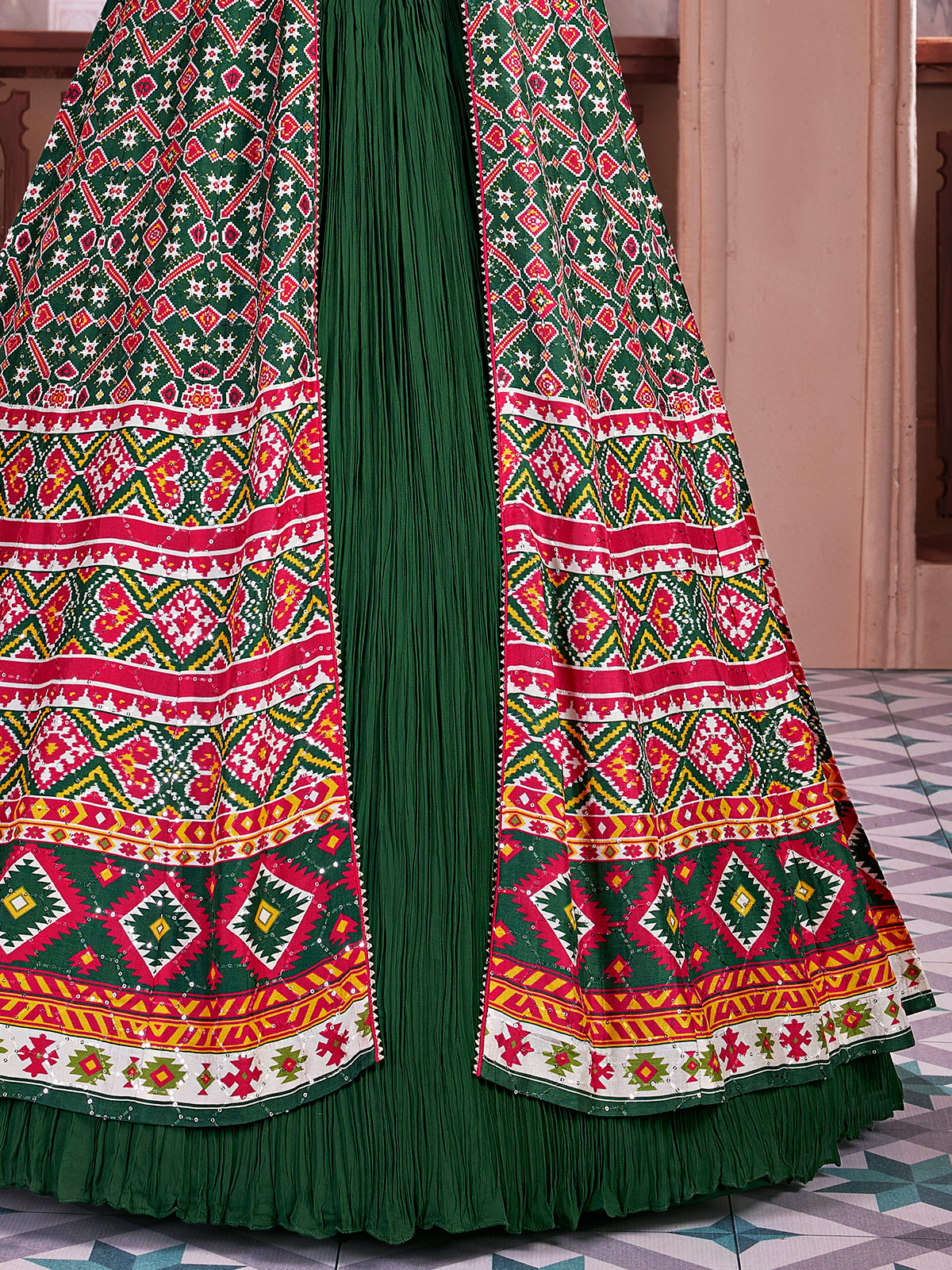Green Printed Silk Long Jacket Style Lehenga Ensemble