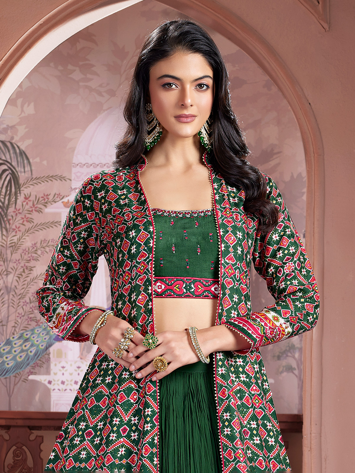 This green printed silk lehenga choli stands out with a designer long jacket enriched with embroidery, thread, sequins, diamond accents and gota work. Blending modern flair with traditional elegance, it creates a striking look perfect for weddings, receptions and stylish sangeet celebrations.