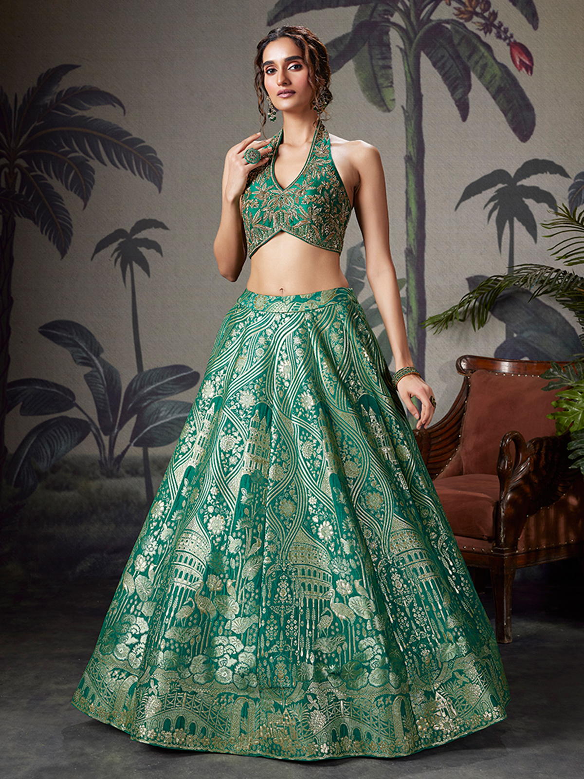 Celebrate vibrant moments in this lush green silk lehenga choli detailed with zari, cutdana, beads, sequins, and zardosi sparkles. The sleeveless blouse and flowing dupatta complete the lively, festive look, perfect for weddings and mehendi functions with joyful elegance.