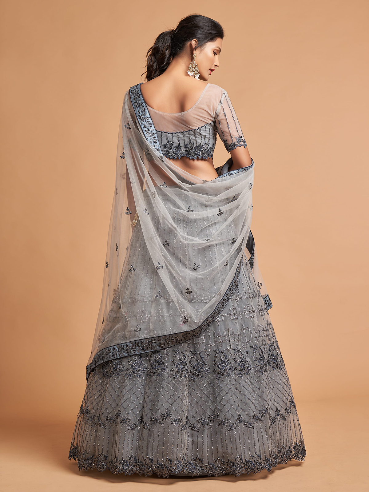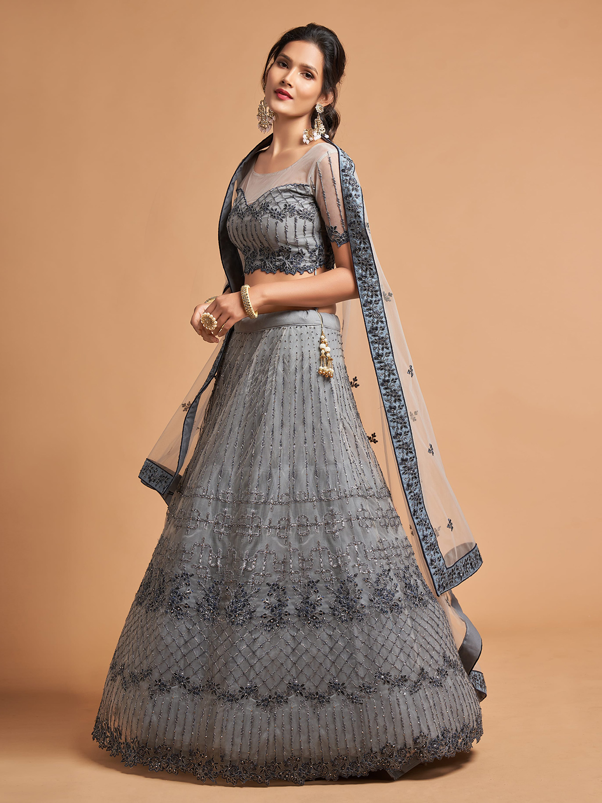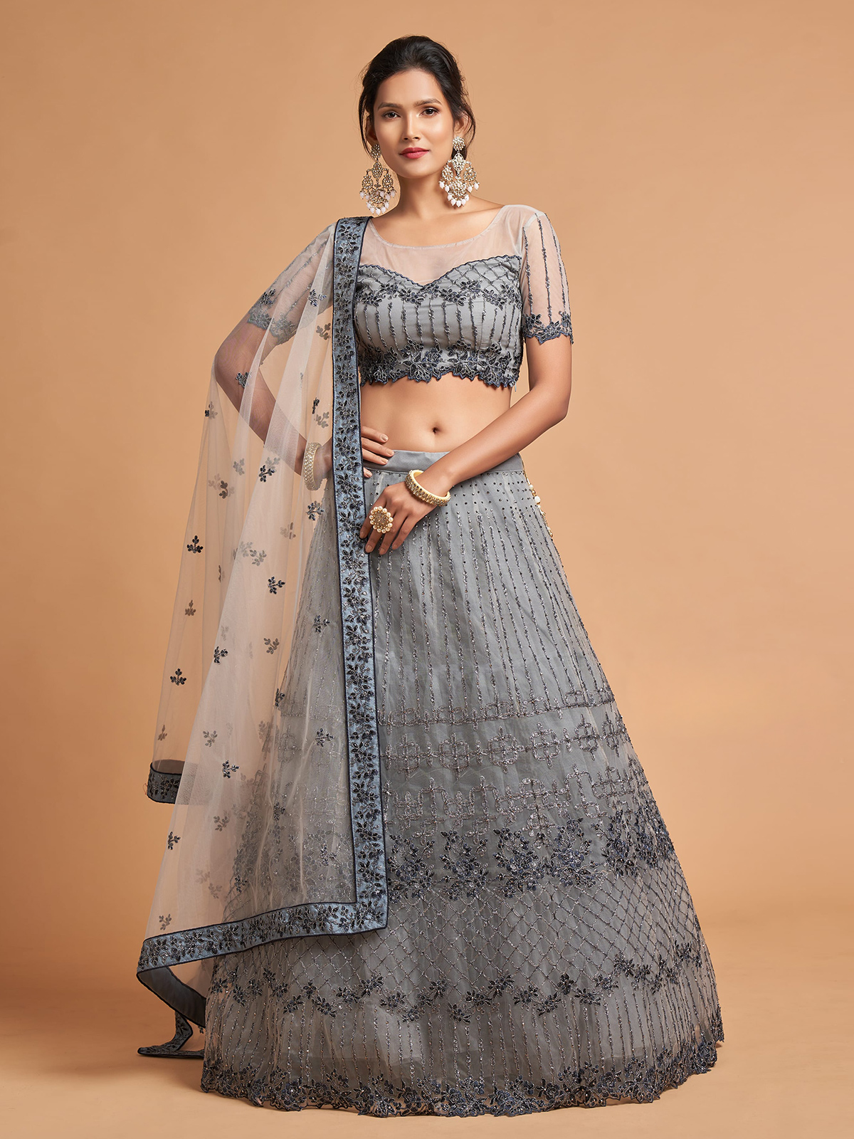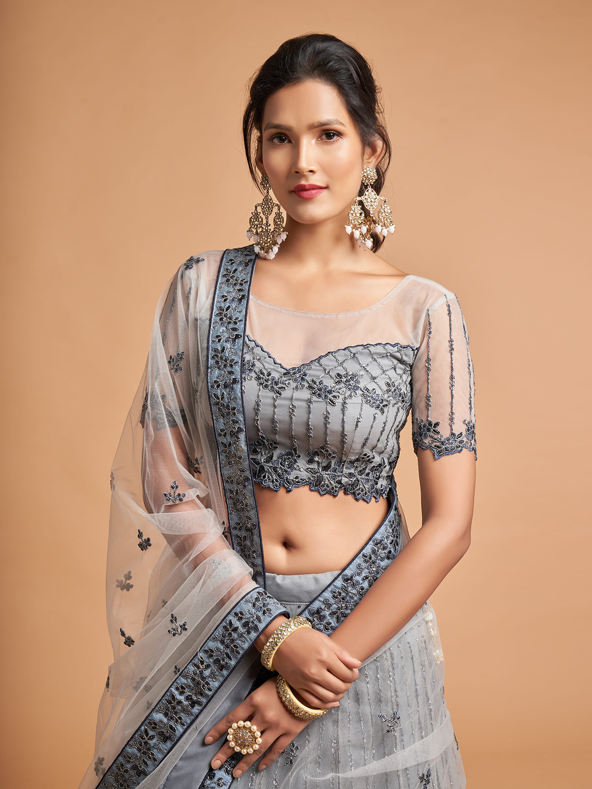 Exude understated glamour with this elegant grey net unstitched lehenga choli crafted for special celebrations. The design is beautifully enhanced with resham, thread, and sequin embroidery, adding texture and graceful shimmer. Paired with a coordinating net dupatta, it is perfect for weddings and reception gatherings.