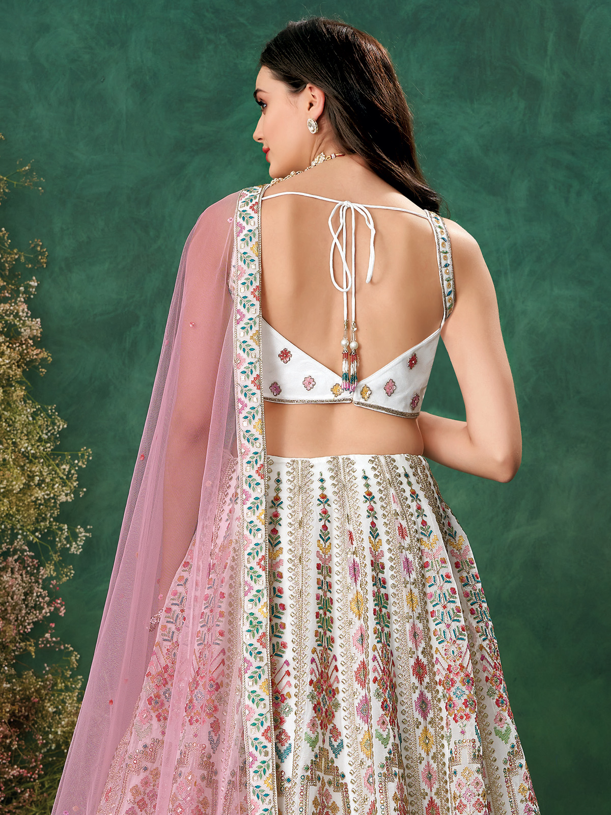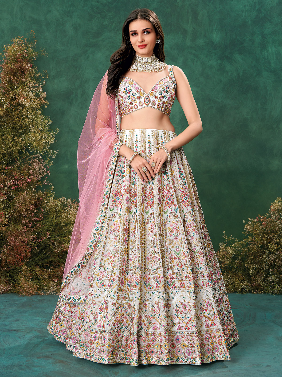 Intricately Embroidered White Georgette Bridal Lehenga