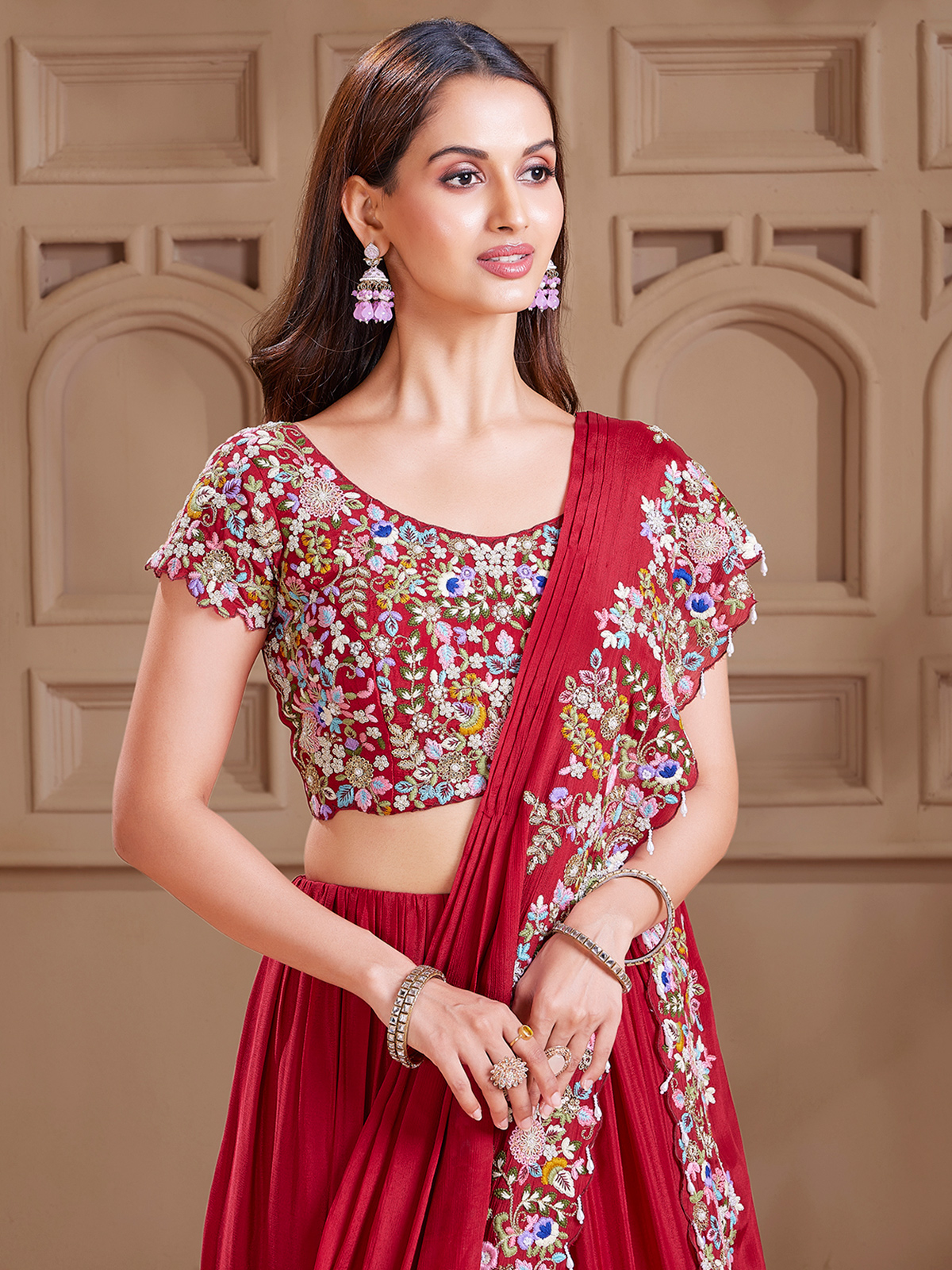 The purpose of this maroon silk lehenga choli is to maintain your fashionable appearance. It is a fashionable addition to any wardrobe because of the exquisite needlework, resham, sequins, beads, and pearls. includes a ready-made blouse and an attached dupatta.