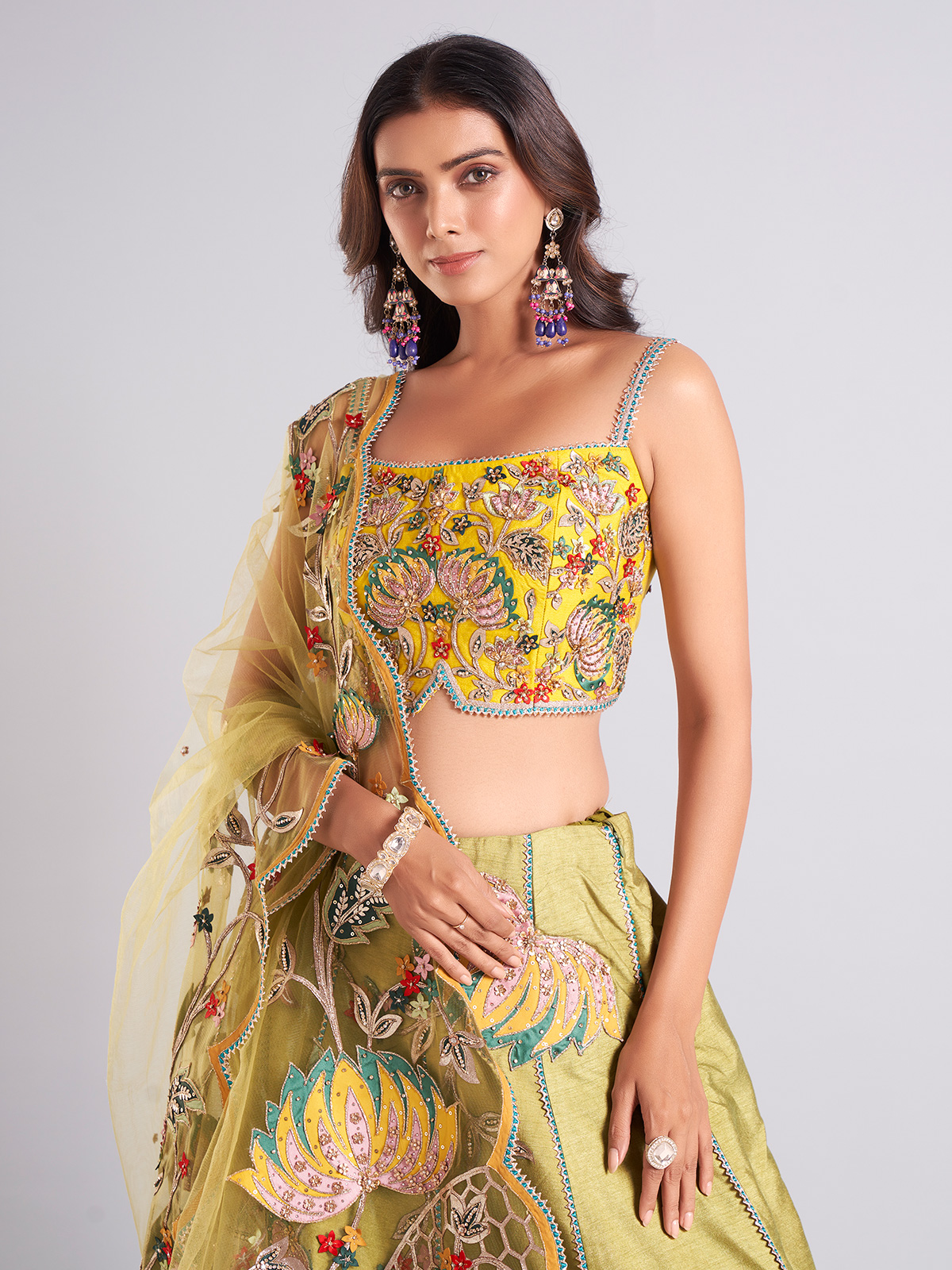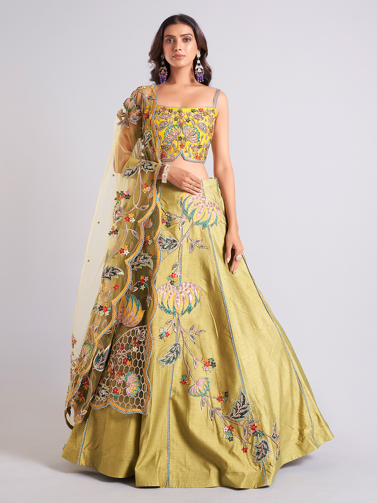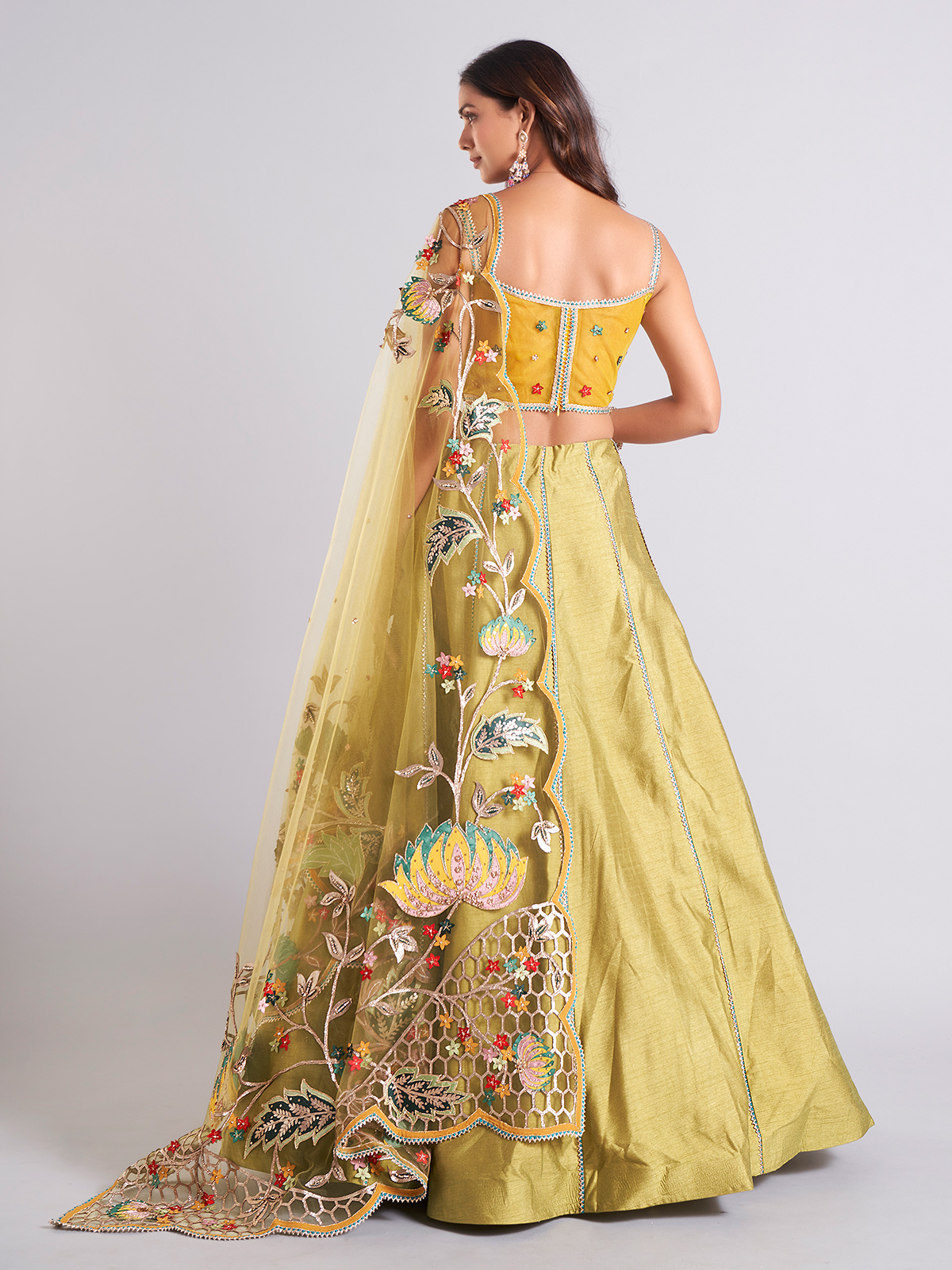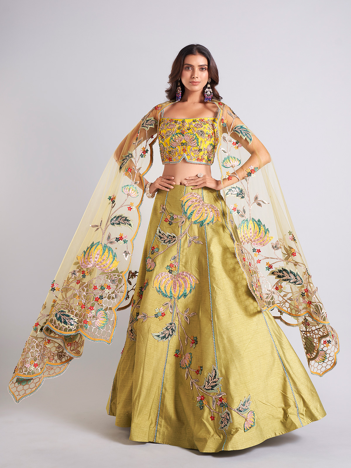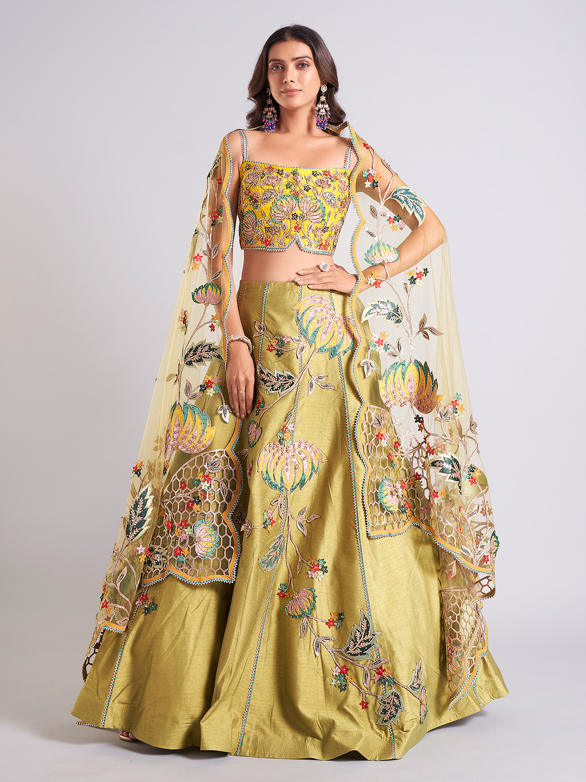 Specially crafted for weddings, this olive raw silk lehenga choli is embellished with cutdana, stones, sequins, thread, gota, and resham work. It comes with a beautiful dupatta, making it the perfect bridal ensemble.
