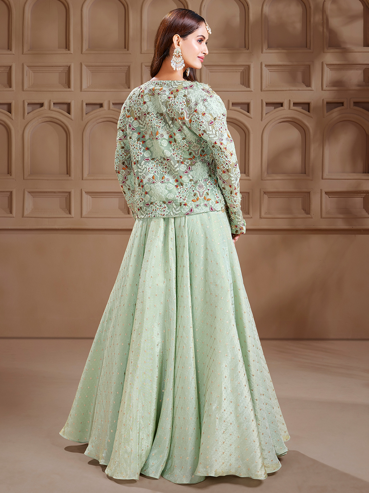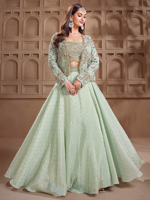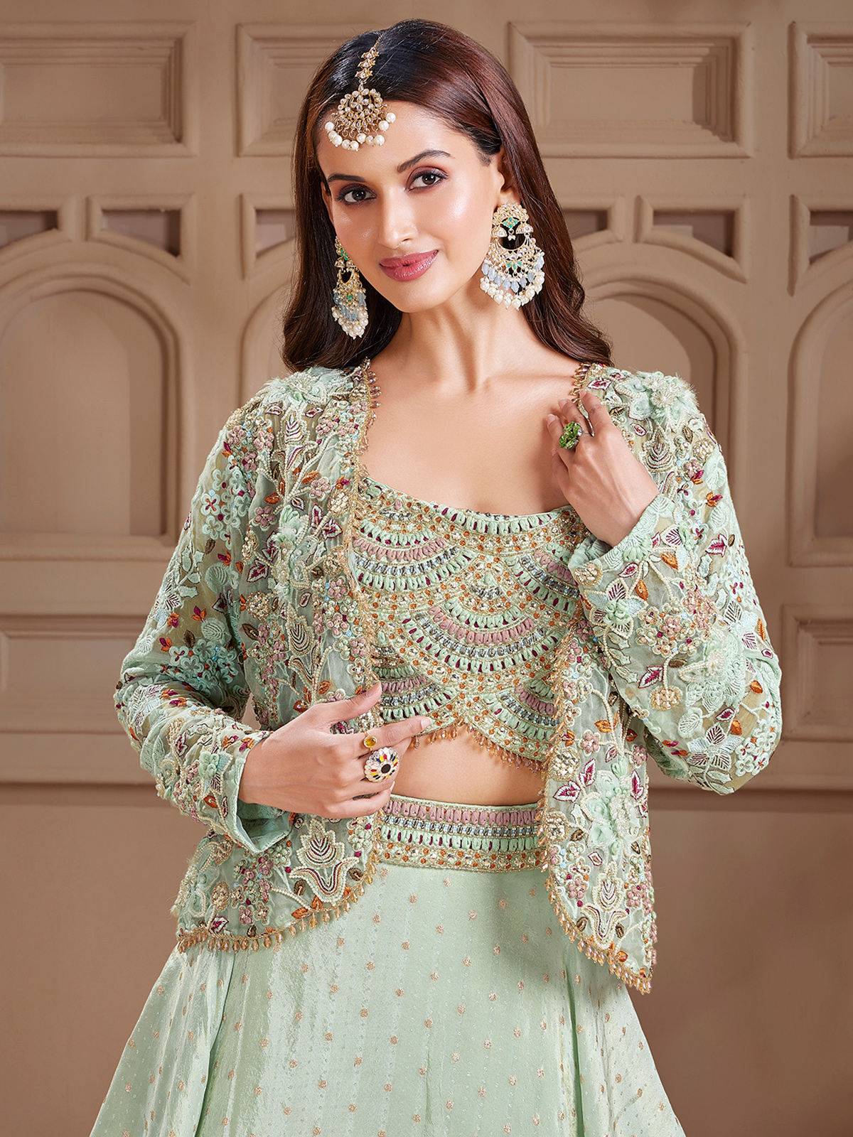 There is a subtle air of elegance and coziness about this pista green jacket-style georgette lehenga choli. adorned for sheer elegance with embroidery, resham, thread, sequins, beads, and pearls.