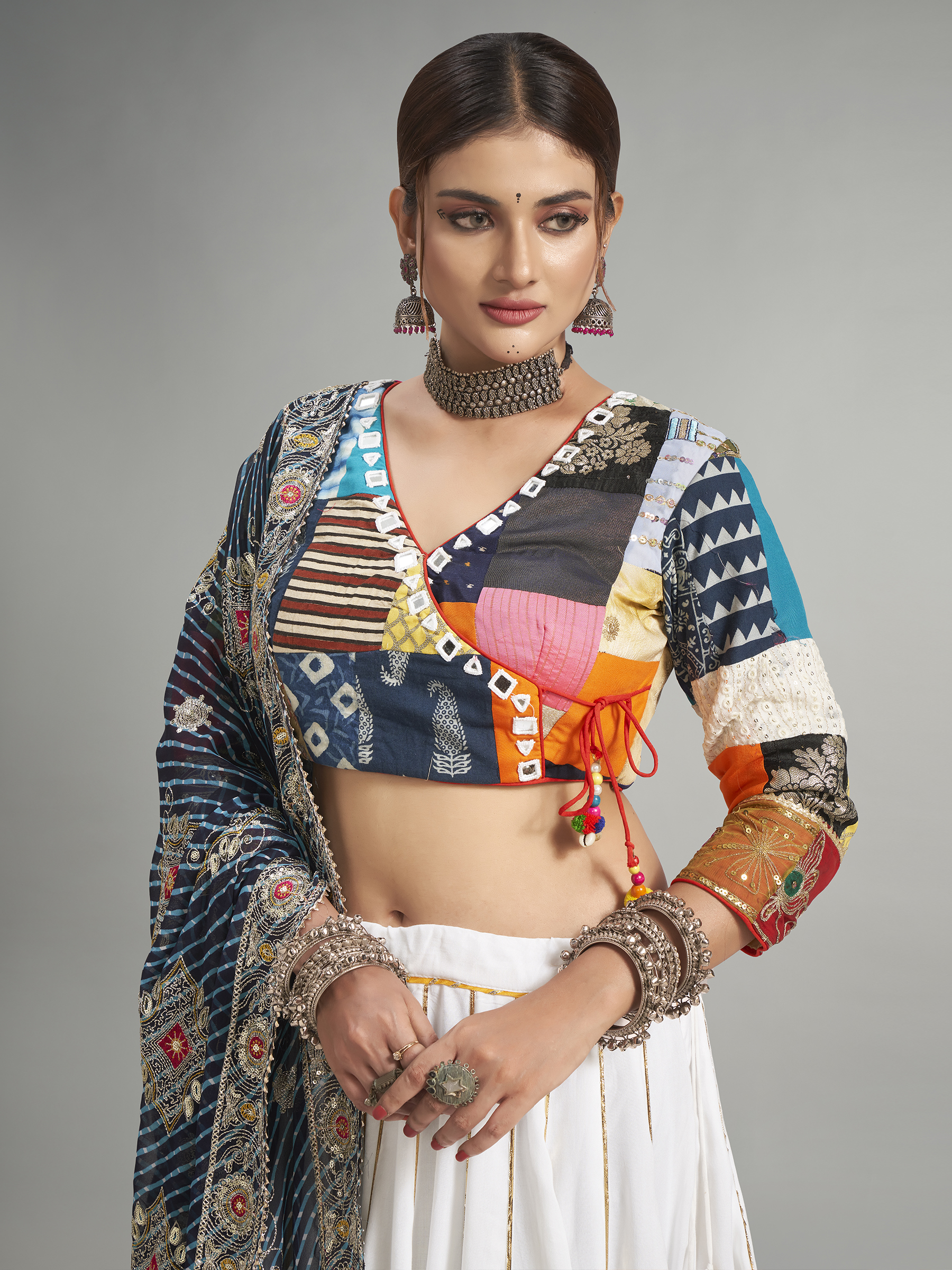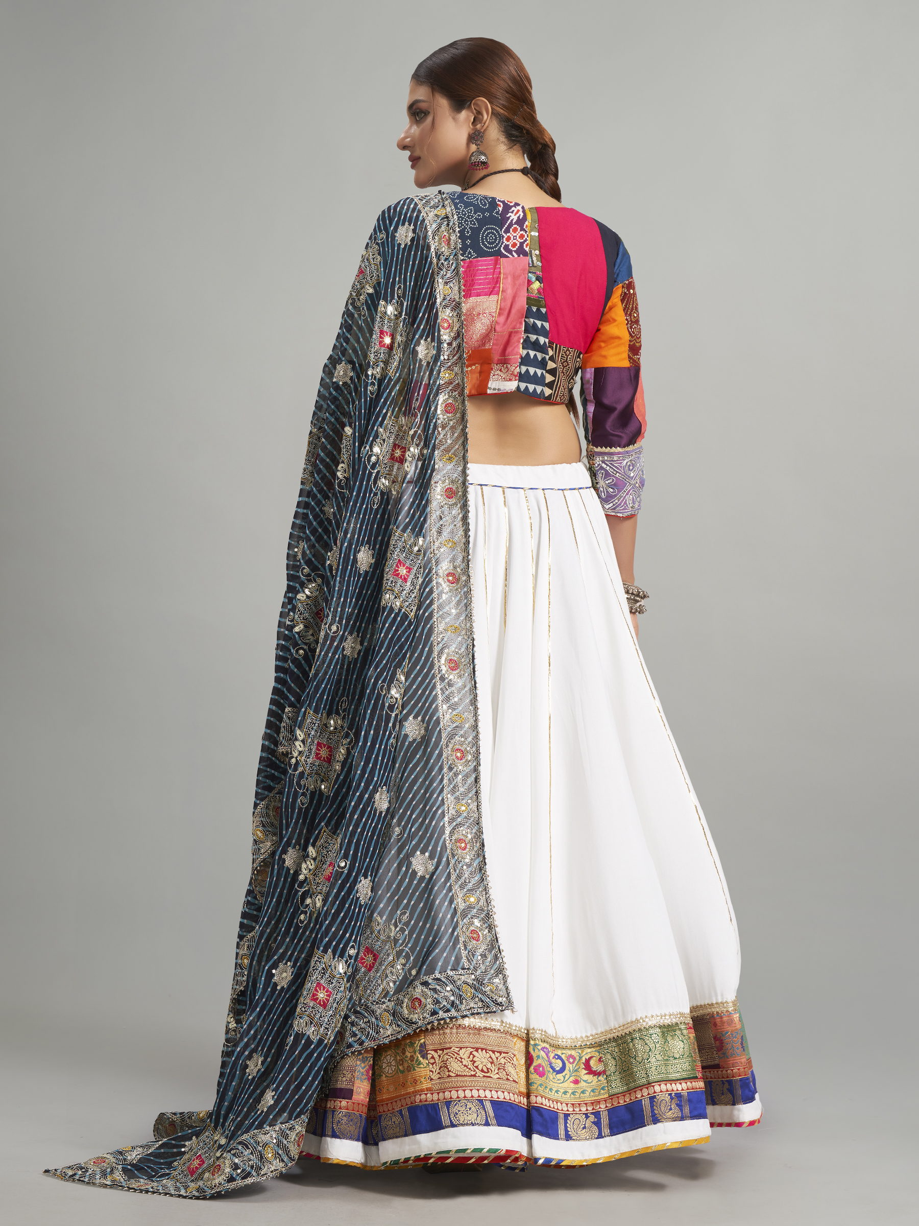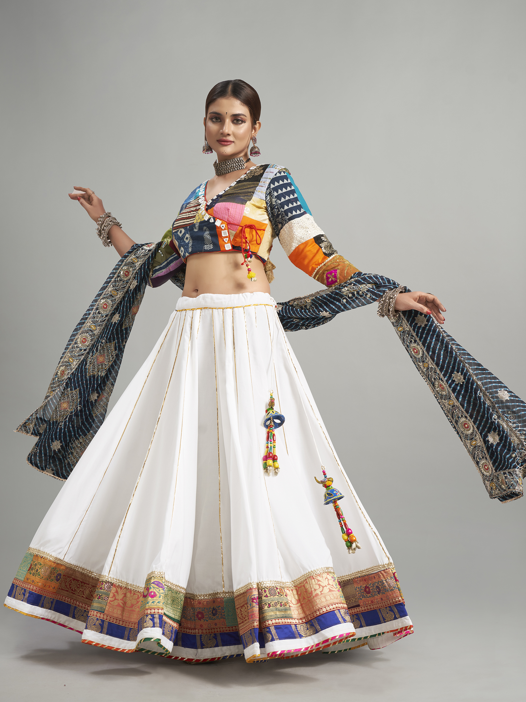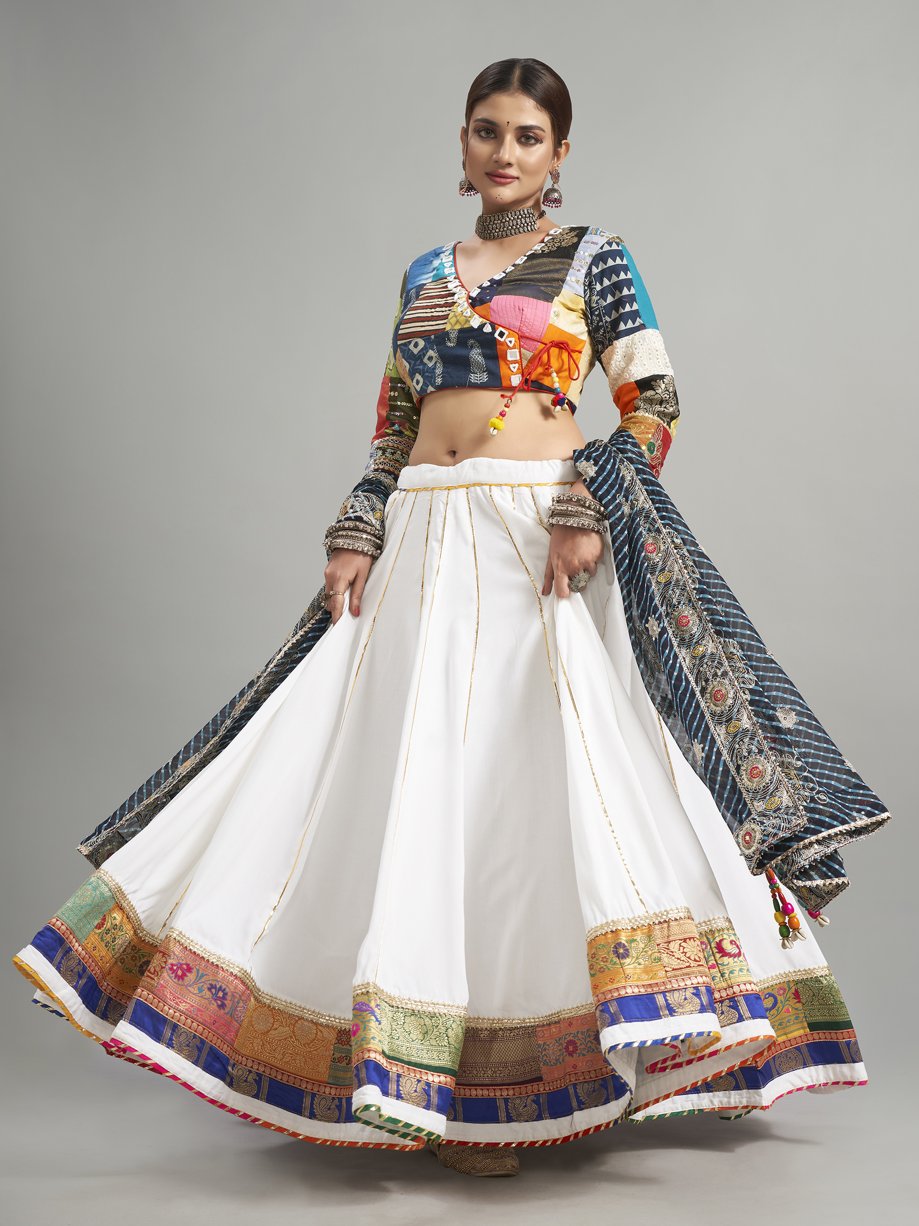 This white cotton silk chaniya choli adorned with sequins, mirror, gota, and resham work detailing makes it a perfect choice for the festive season. The choli has a V-neck and quarter sleeves, offering both comfort and style. Comes with a dupatta. Note that the print and work may slightly vary from the image.