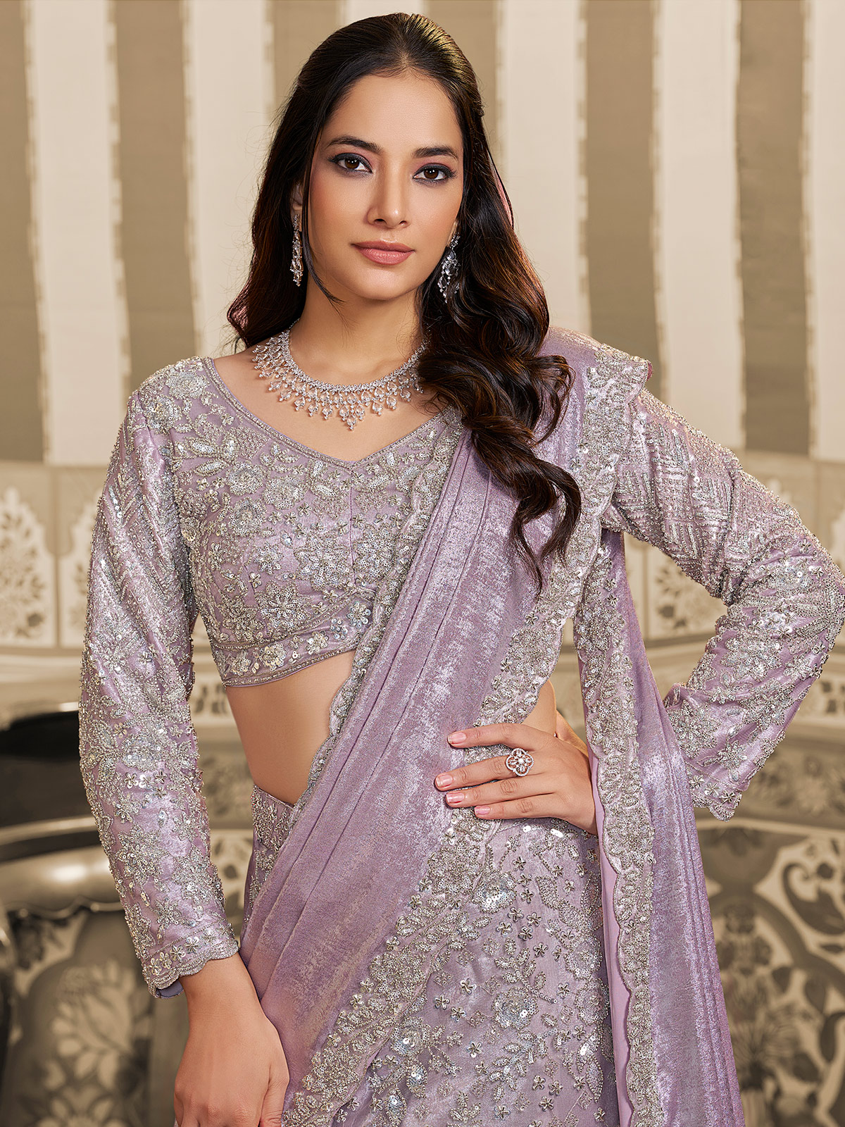 The featured lavender foil satin lehenga saree is a sophisticated fusion of traditional and contemporary styles. This lehenga saree is heavily embellished with intricate cutdana and sequins, creating a shimmering, high-glamour effect across the entire silhouette. It is paired with a coordinating long-sleeved and V neck blouse that mirrors the ornate detailing, while the draped pallu offers the elegant flow of a saree with the structured volume of a lehenga. Perfect for grand receptions.
