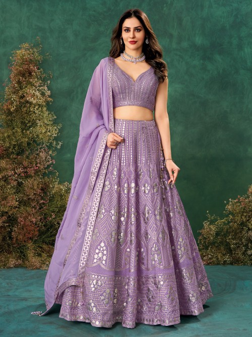 Look absolutely radiant in this purple organza lehenga choli, perfect for receptions and wedding functions. Accented with intricate thread, gota patti, and stone embellishments, this ensemble sparkles with grace. The cholis sweetheart neckline and sleeveless design add modern sophistication, while the matching dupatta brings the look together.