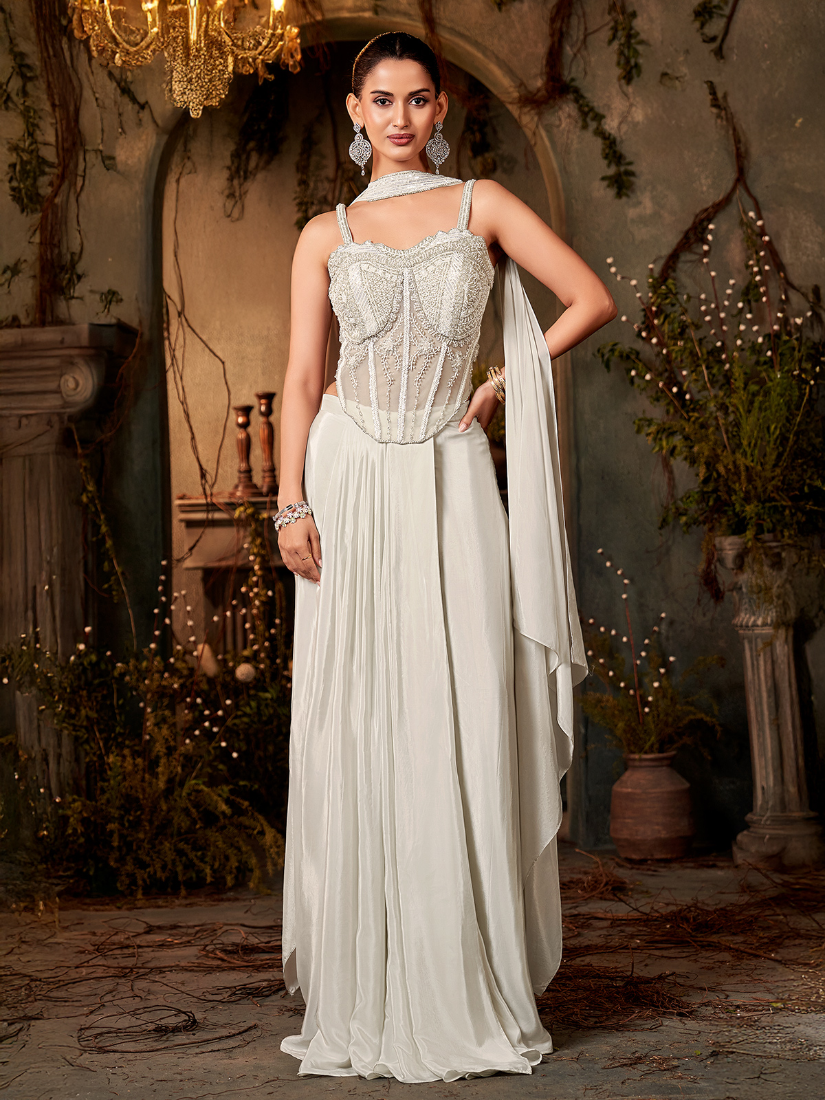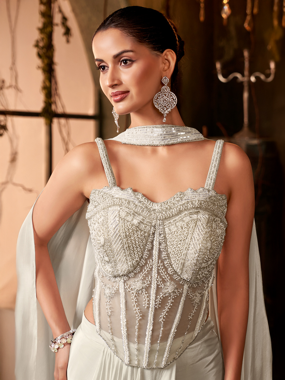 Radiating subtle sophistication, this light grey crepe silk lehenga choli is designed for graceful festive wear. Adorned with finely detailed beads, sequins, and cutdana work, it offers a soft shimmer with elegant texture. The sleeveless silhouette enhances its sleek appeal. Perfect for weddings, receptions, and sangeet celebrations, it is complemented with a stylish choker dupatta for elevated charm.