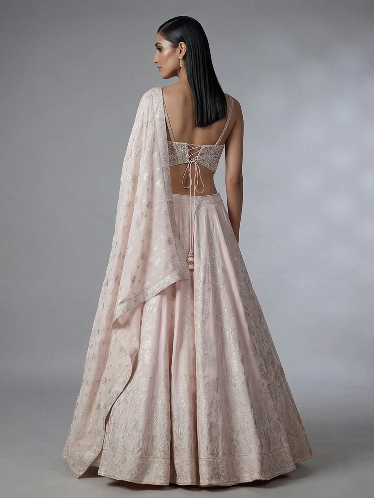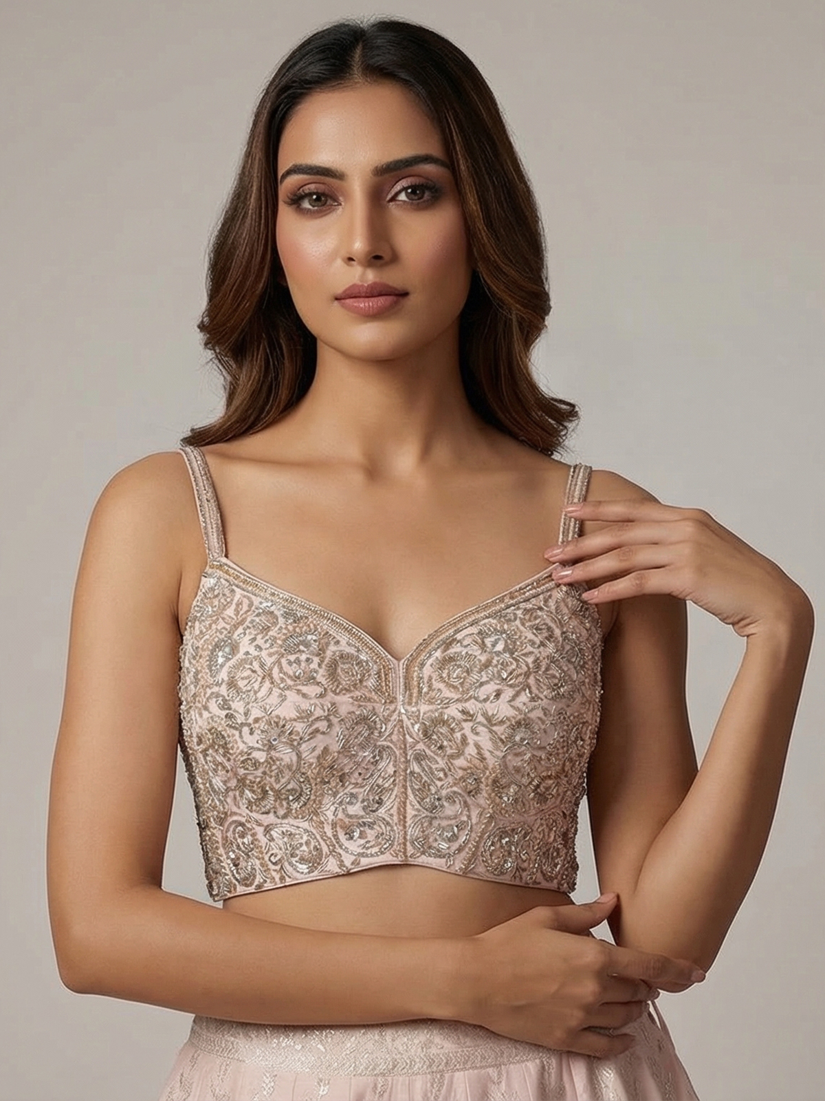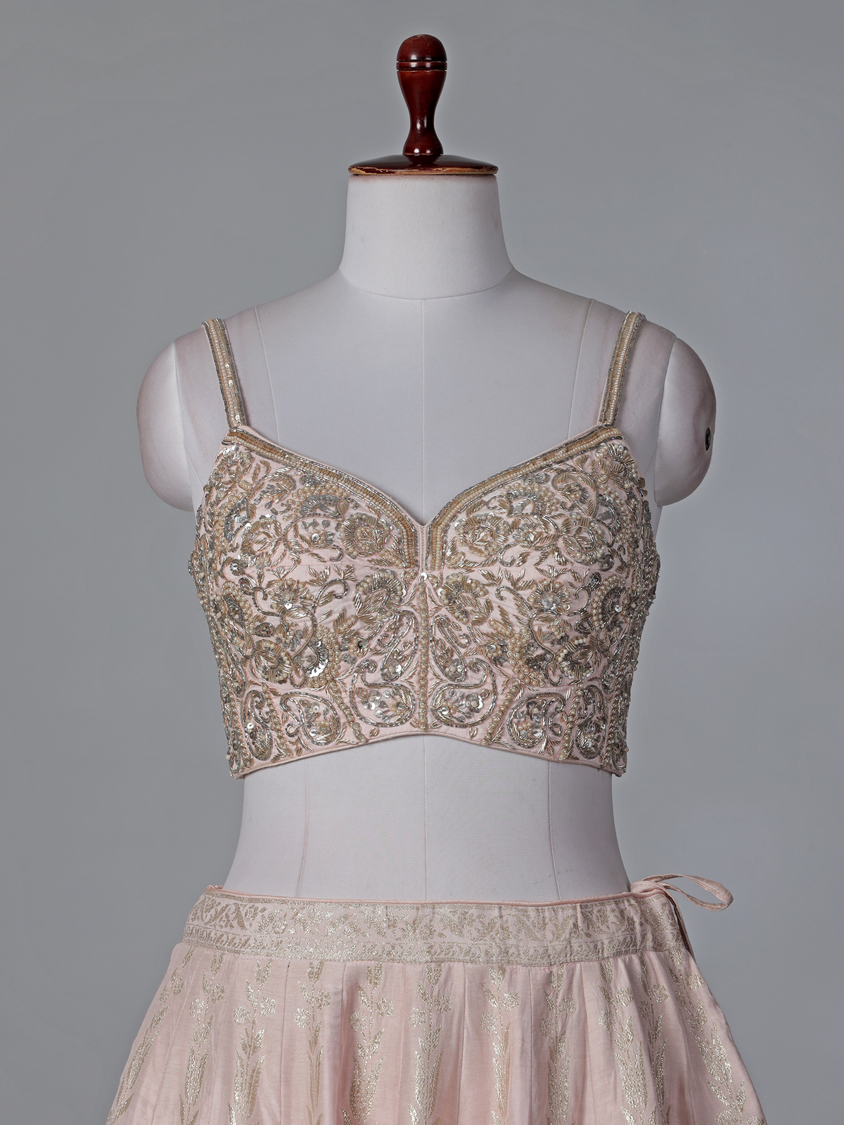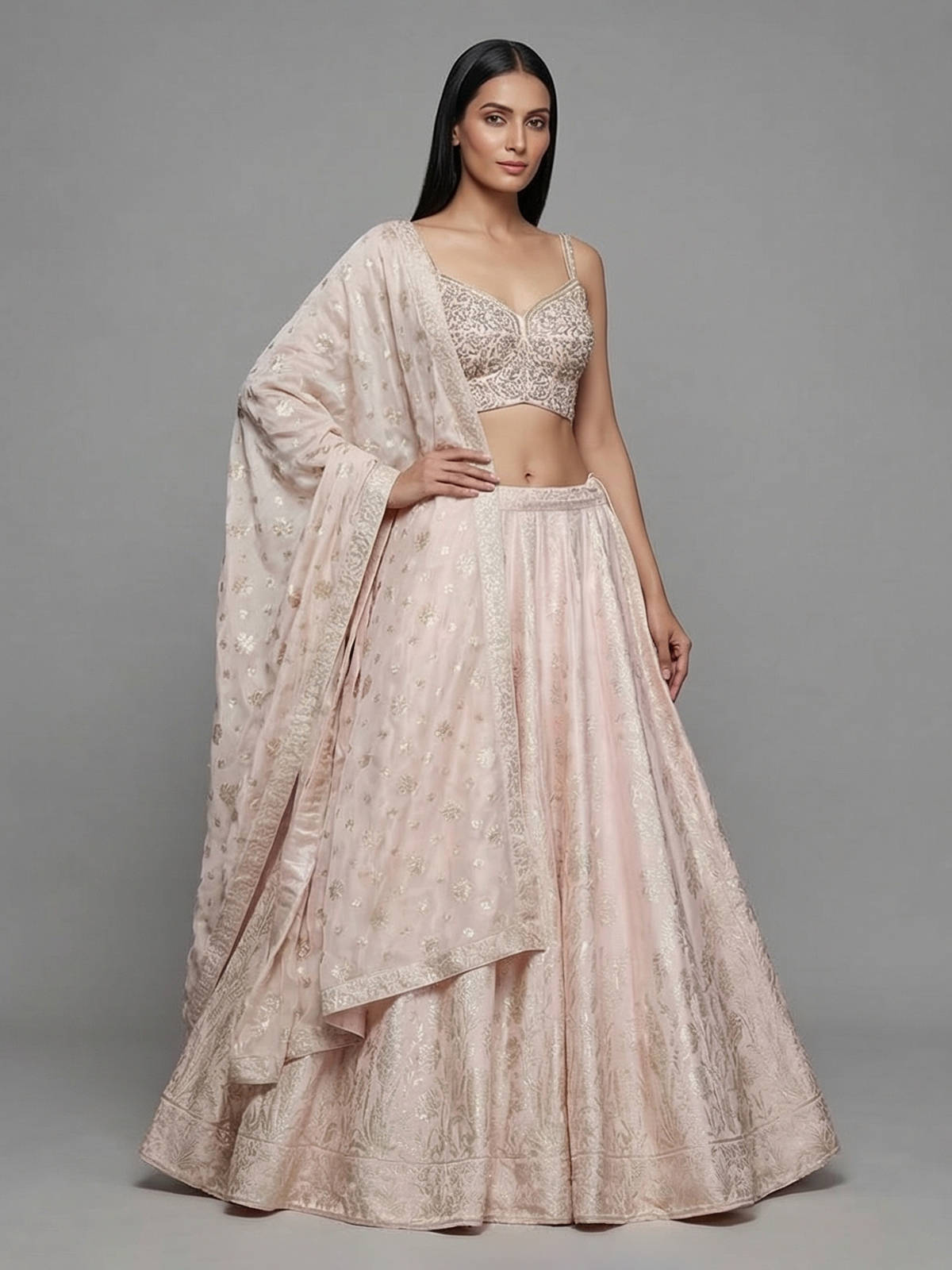 Celebrate elegant charm in this captivating light peach silk lehenga choli crafted for festive occasions. Enriched with beads, sequins, zari, cutdana, and zardosi embroidery, it showcases a luxurious finish. Designed with a sleeveless sweetheart blouse and paired with a dupatta, it is perfect for weddings, sangeet ceremonies, and grand receptions.