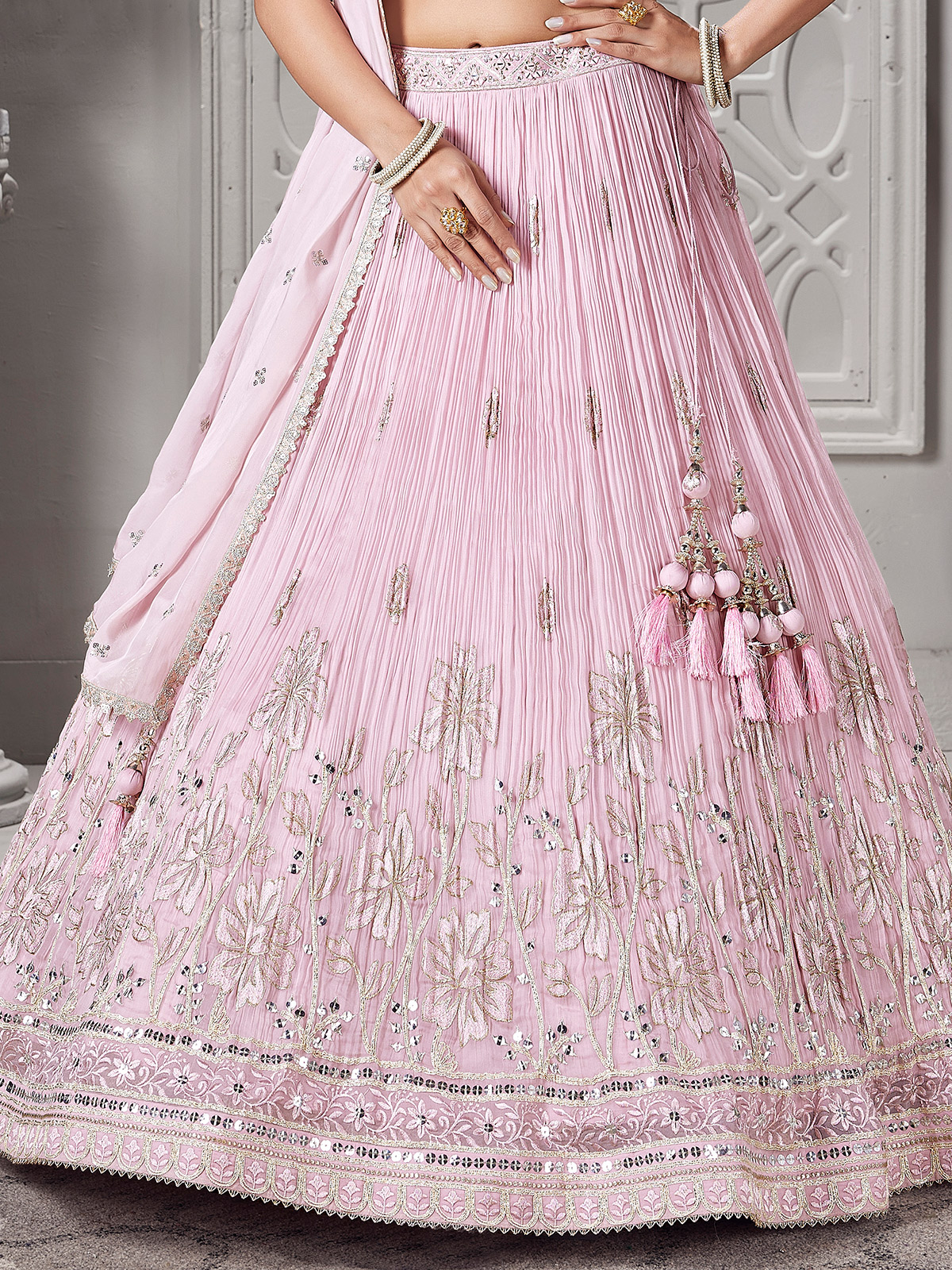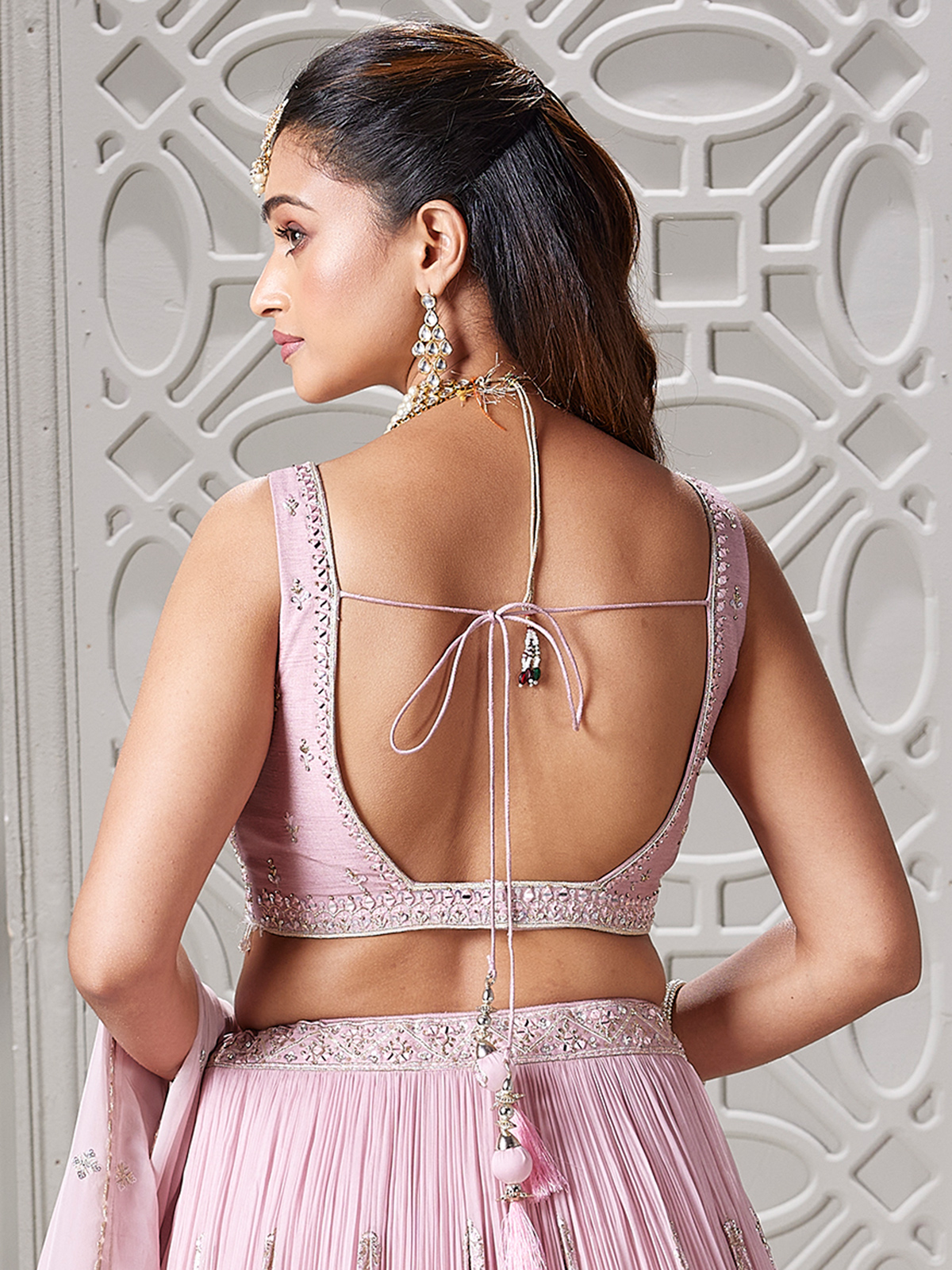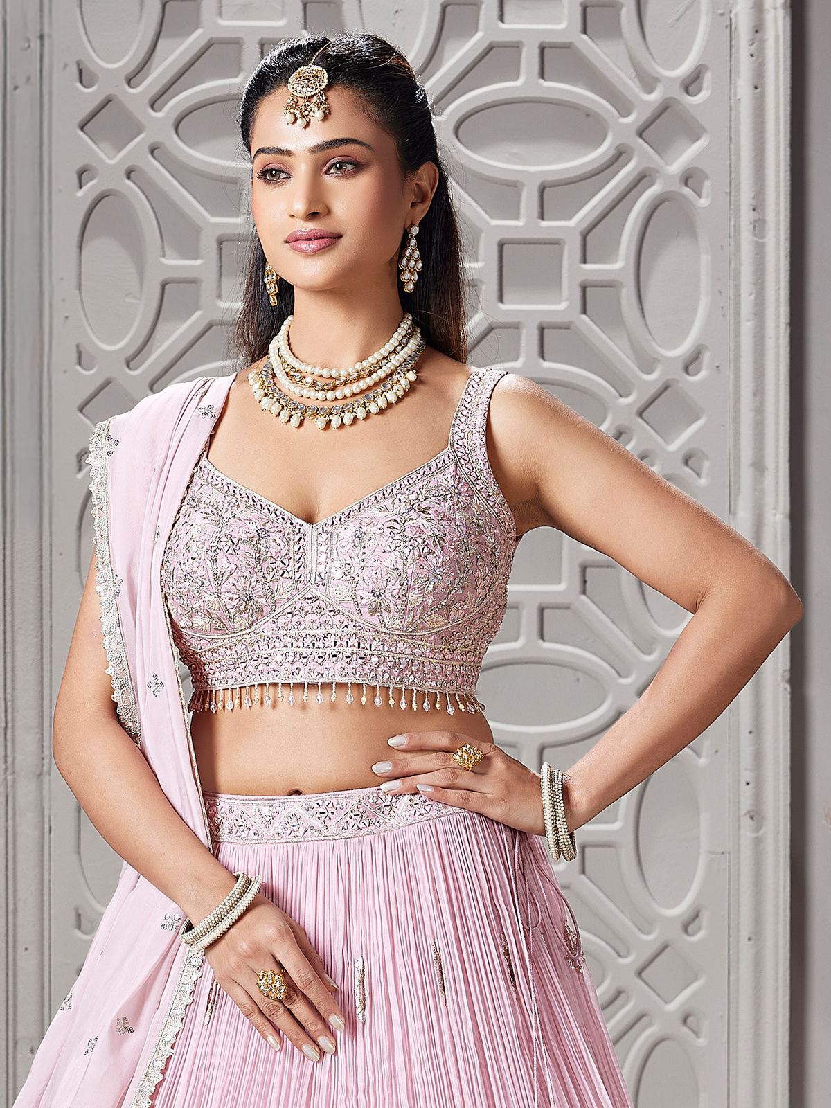 Crafted in soft light pink silk, this lehenga choli is adorned with embroidery, sequins, aabla, cutdana, zardosi, and diamond embellishments. Designed with a sweetheart neckline and sleeveless silhouette, it comes with a dupatta, perfect for wedding ceremonies and receptions.
