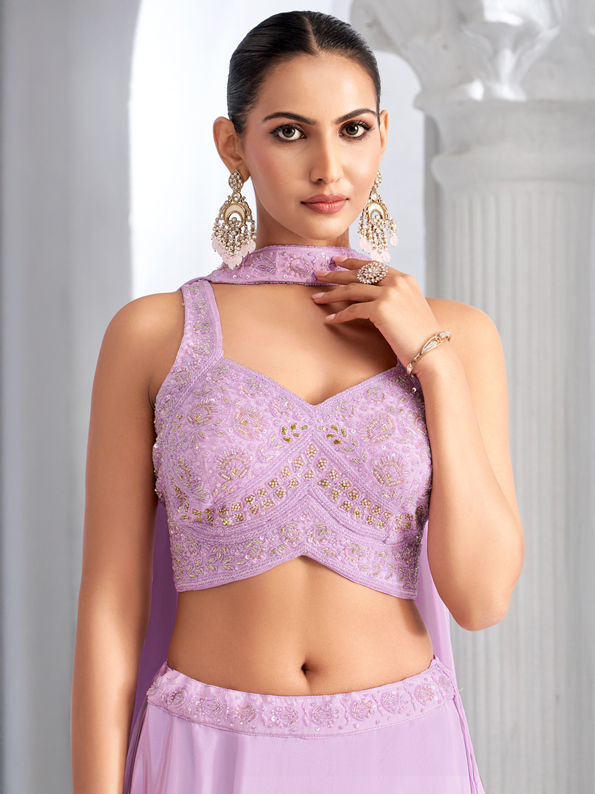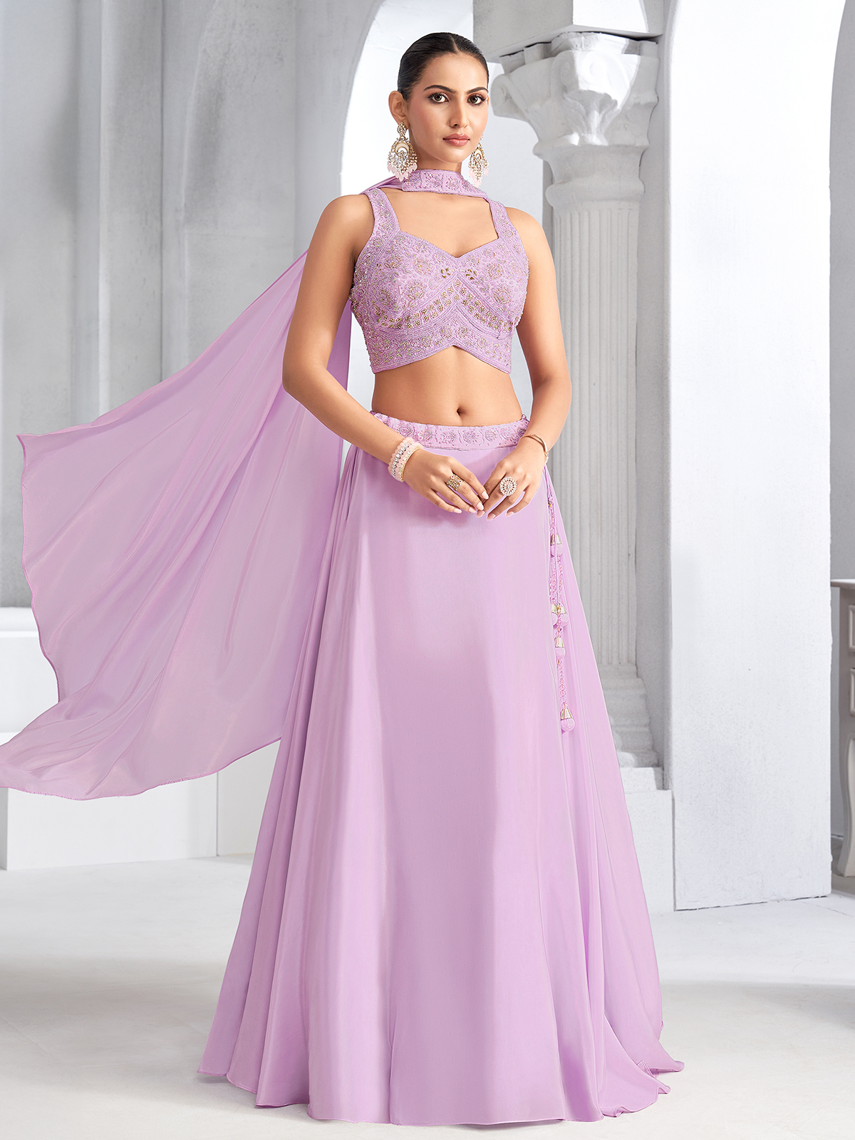 Delicate and dreamy, this light purple crepe silk lehenga choli brings soft festive charm with intricate embellishments. Designed with beads, sequins, and cutdana work, it offers a graceful shimmer and textured beauty. The sweetheart neckline and sleeveless style enhance its elegance. Ideal for weddings, receptions, and sangeet occasions, it is styled with a choker dupatta for a modern twist.