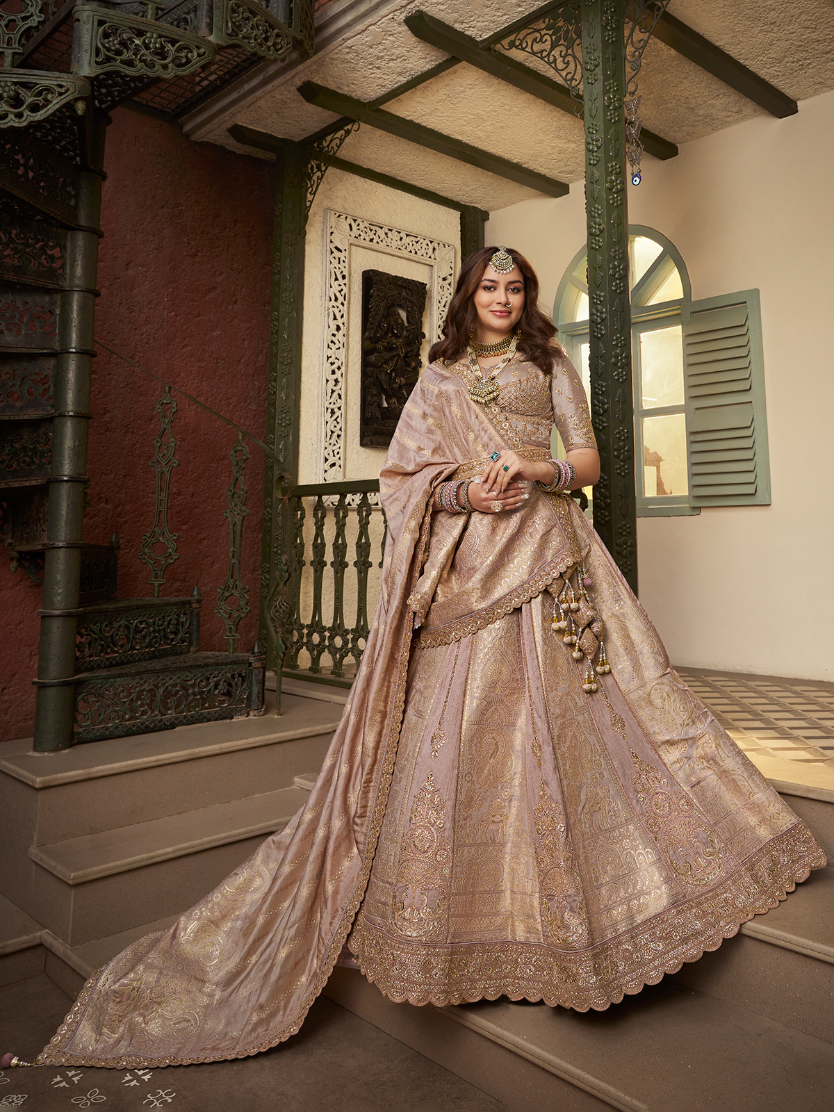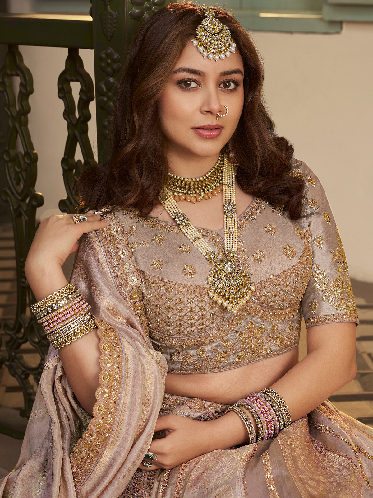 This light purple banarasi silk outfit features rich embroidery, shimmering sequins, sparkling swarovski stones and detailed zari weaving work. It includes lehenga, blouse, dupatta and matching belt. The lehenga choli is unstitched for customized stitching and perfect fitting. Ideal for wedding, reception and bridesmaid occasions. Clutch (purse) not included.