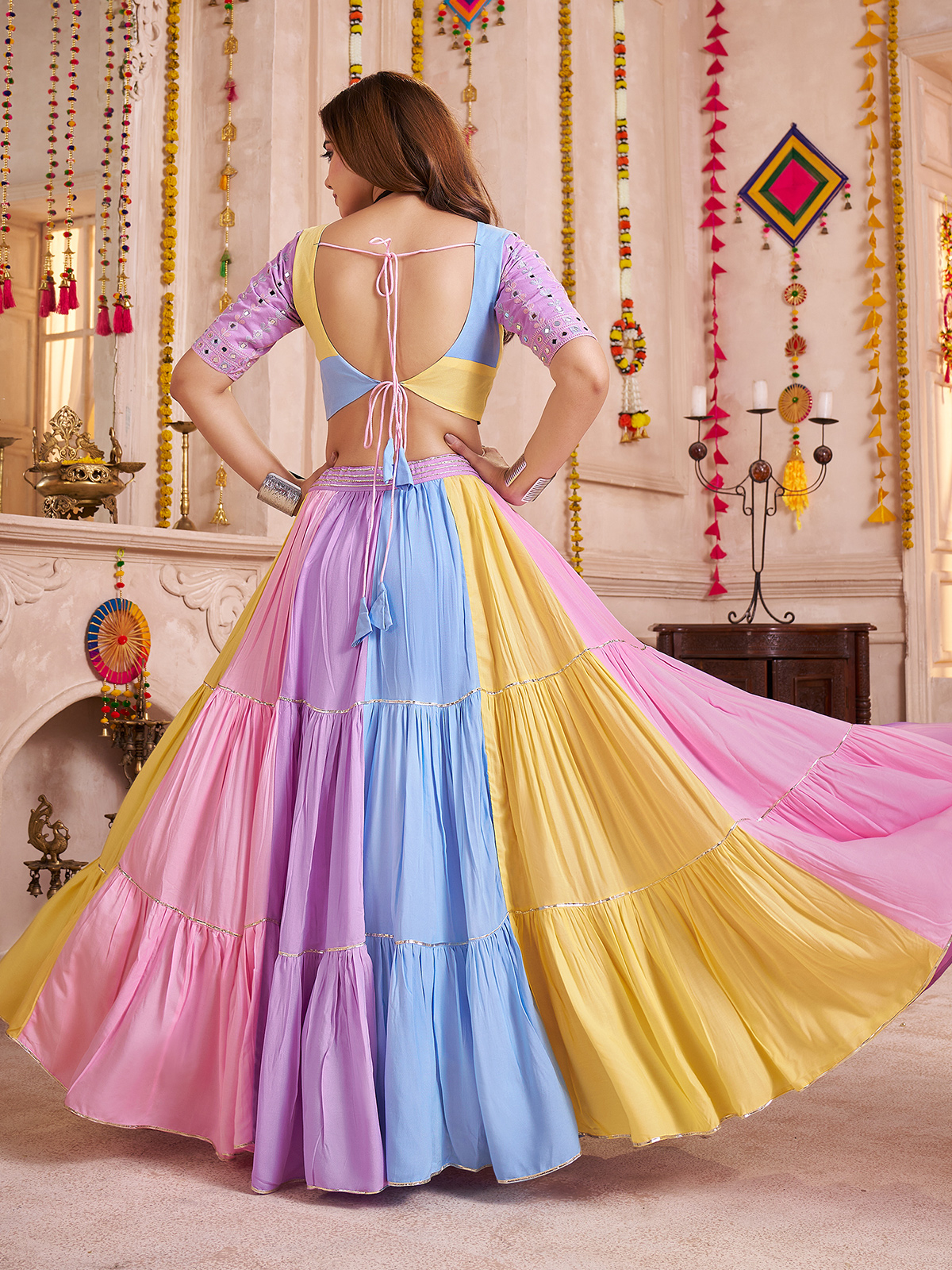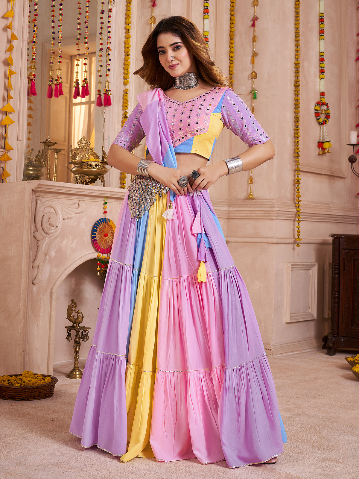 Step into navratri radiance with this light purple viscose cotton chaniya choli, crafted with mirror and thread embroidery. Paired with a dupatta and ready-made blouse, its V-neckline and elbow sleeves create a refined, graceful and beautiful festive outfit that brings charm to your celebrations.