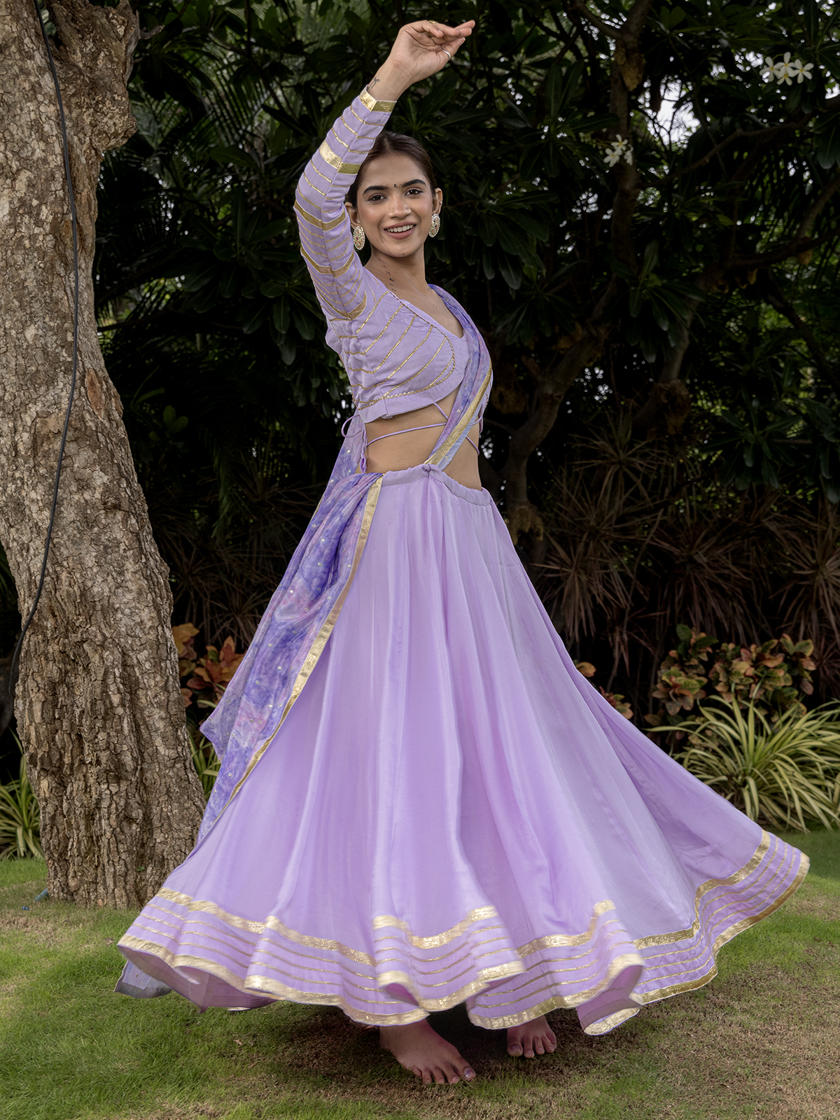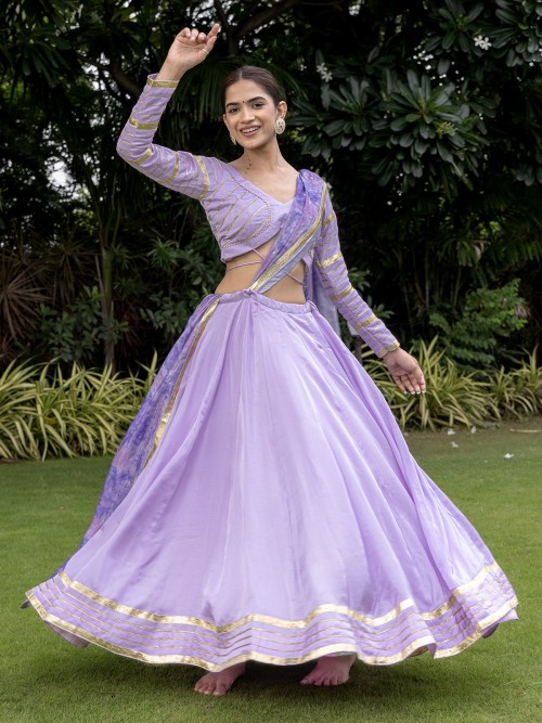Radiate festive allure in this light purple silk lehenga choli, styled with a chic V-neckline and full sleeves. Paired with a matching purple dupatta, it is highlighted with elegant gota patti work, offering a graceful and celebratory look for Navratri gatherings and garba nights.