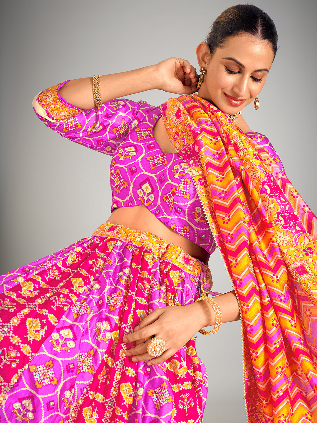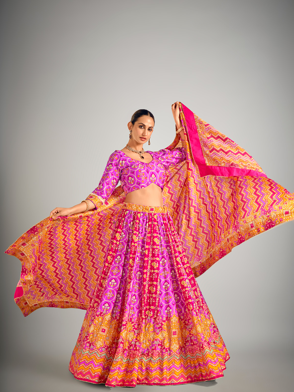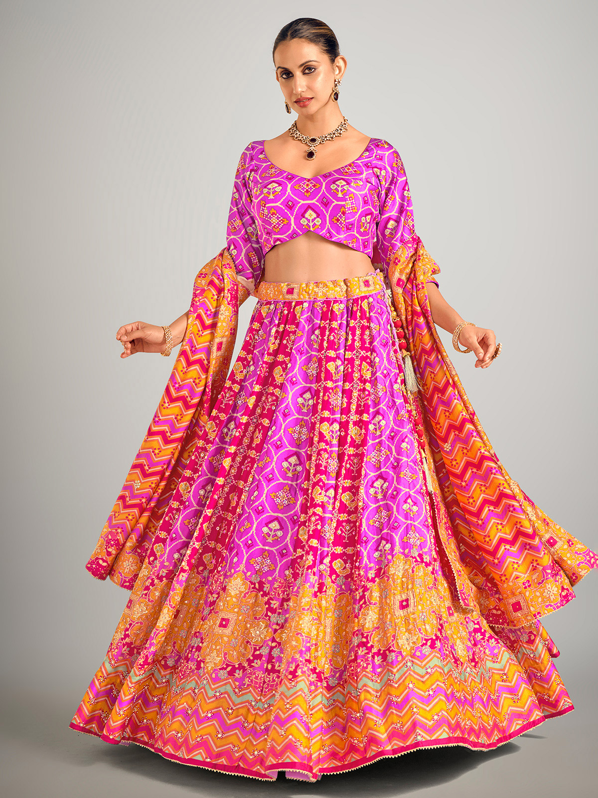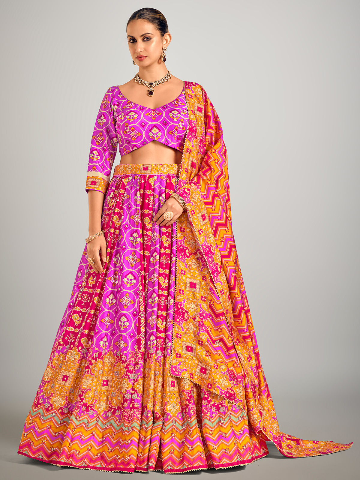 Light Purple Printed Sweetheart Neck Silk Lehenga Choli