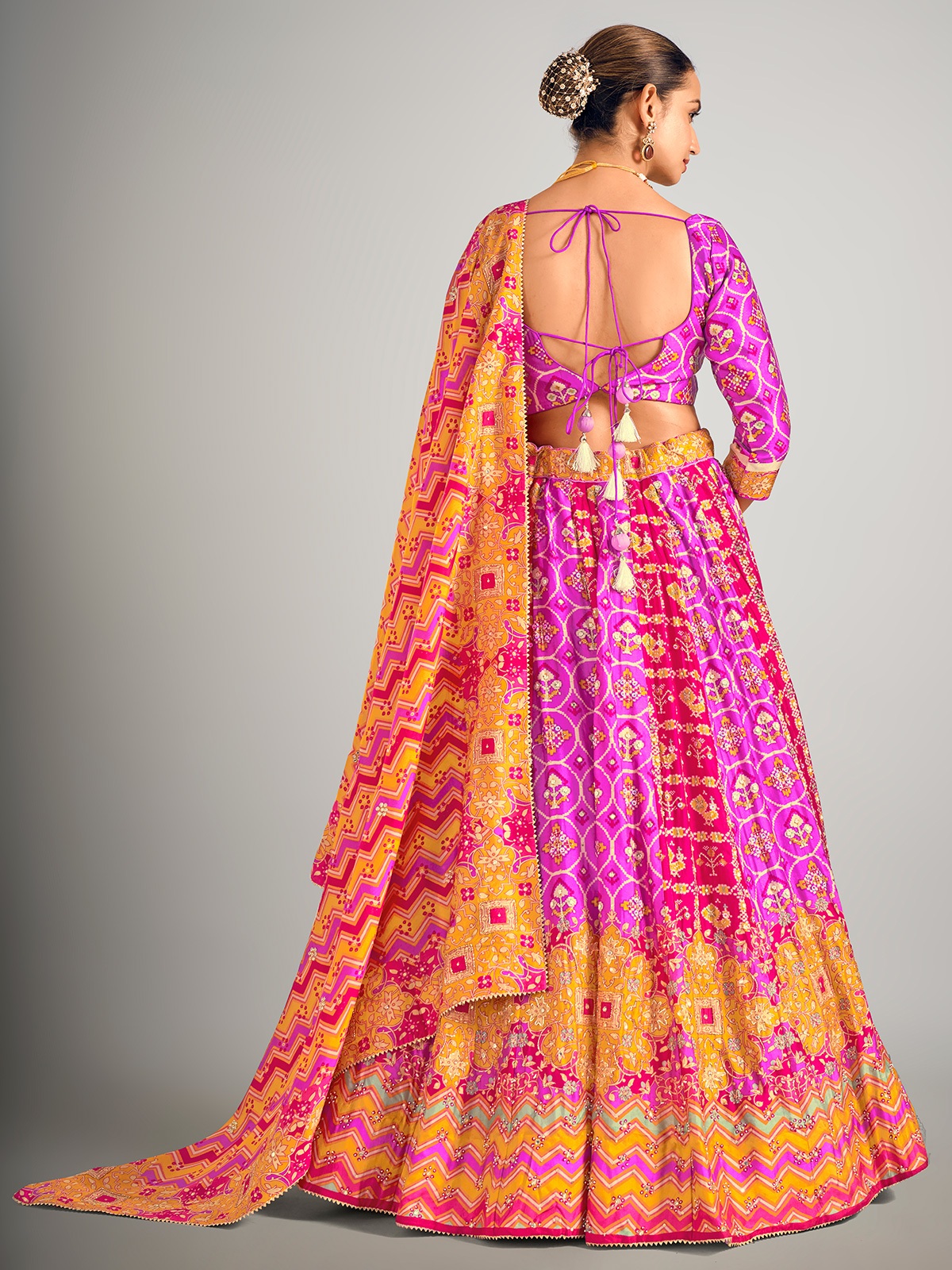 A lehenga choli with a light purple design is the ideal combination of style and personality. It is perfect for traditional events because it is made of silk and embellished with gota work, zardosi, and beads. The choli comes with a dupatta and has a sweetheart neck and quarter sleeves.