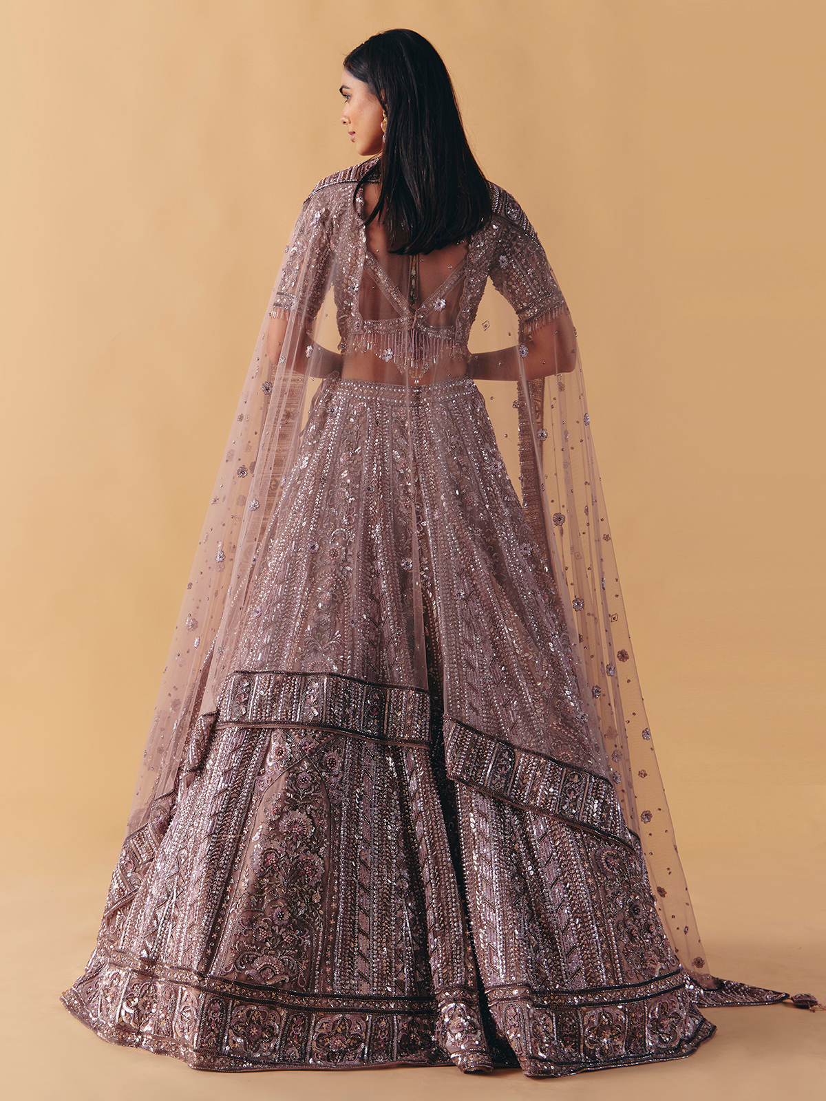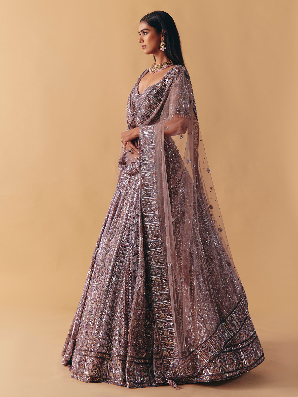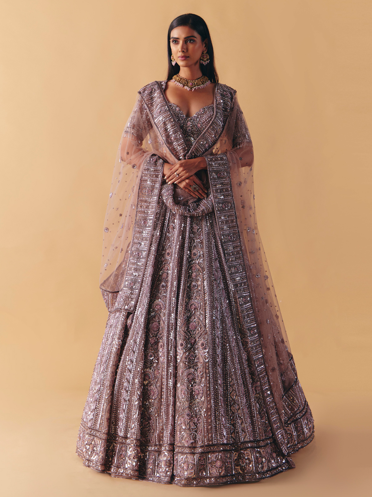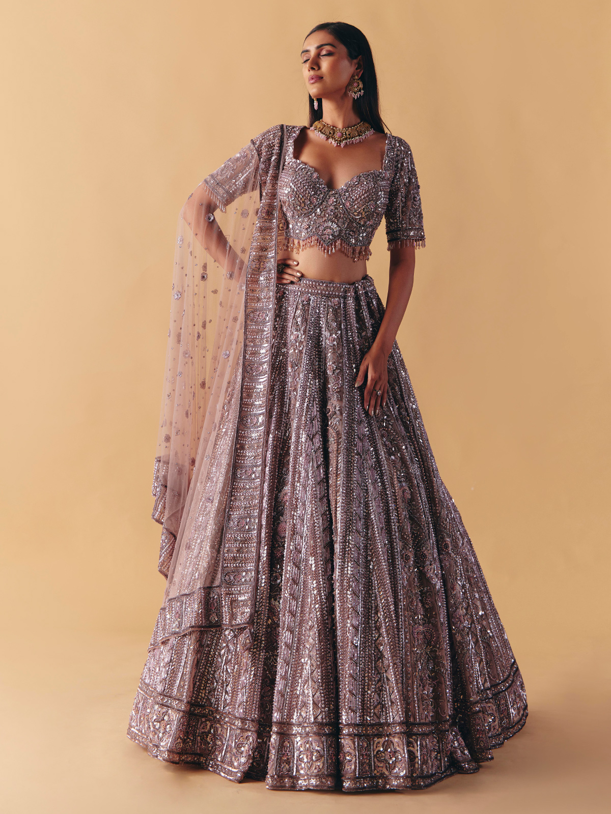 A lilac purple net lehenga crafted with pearls, diamonds, sequins, beads, and cutdana detailing. Styled with full sleeves and a sweetheart neckline, paired with a dupatta, it makes a fairytale choice for receptions, weddings, and bridal events.