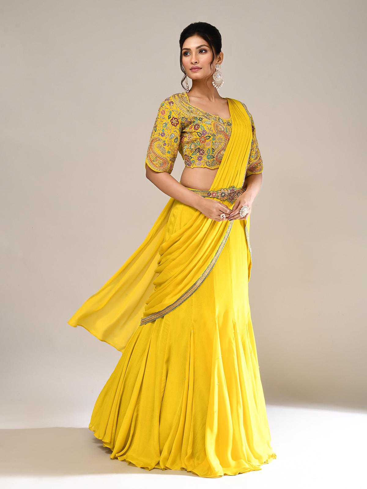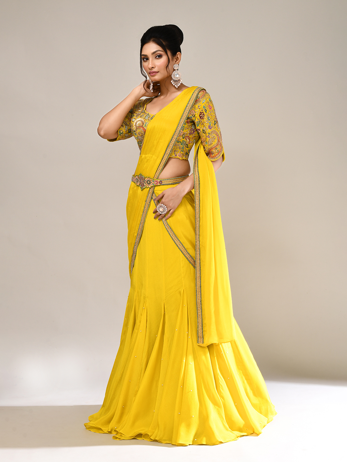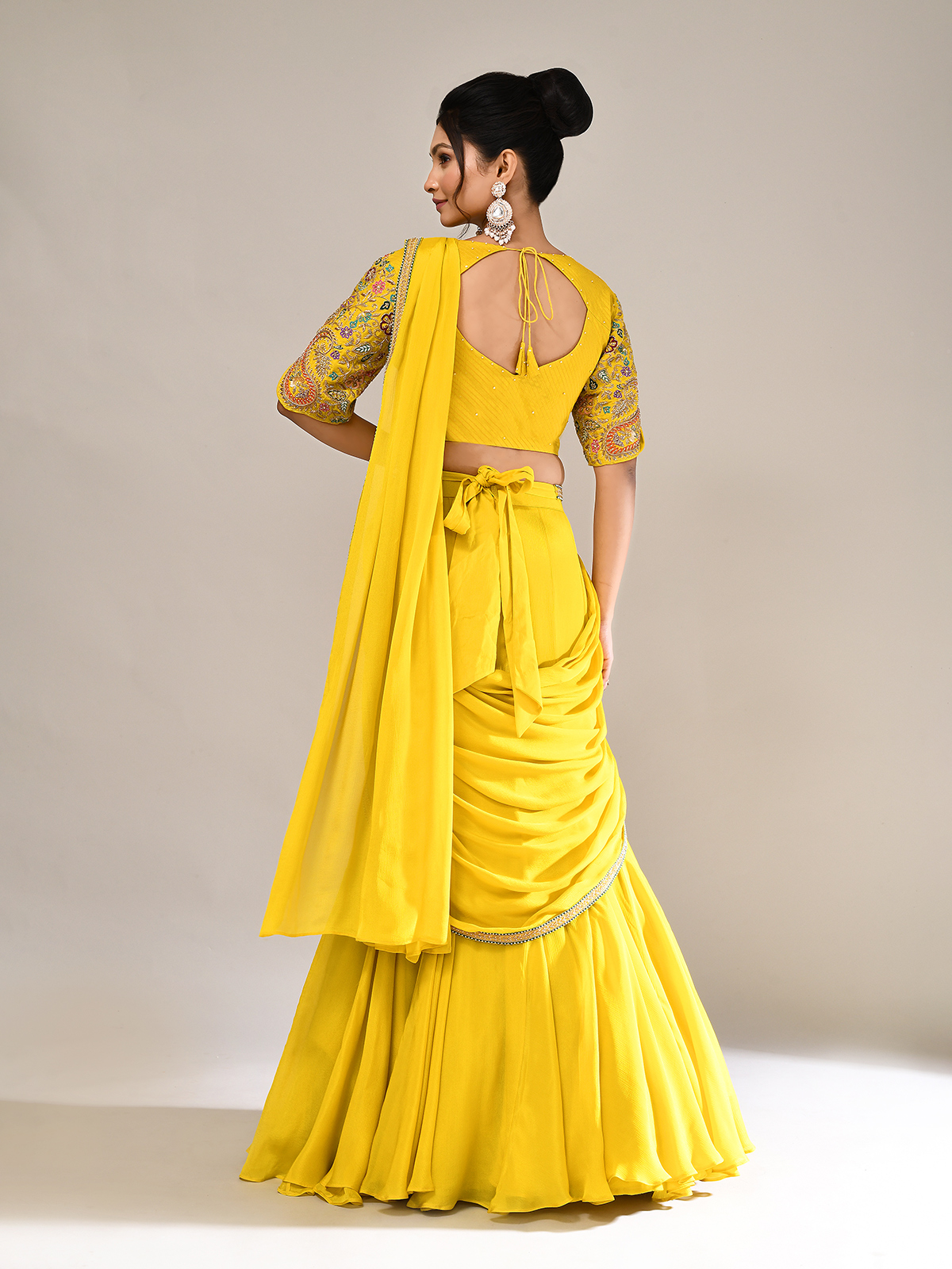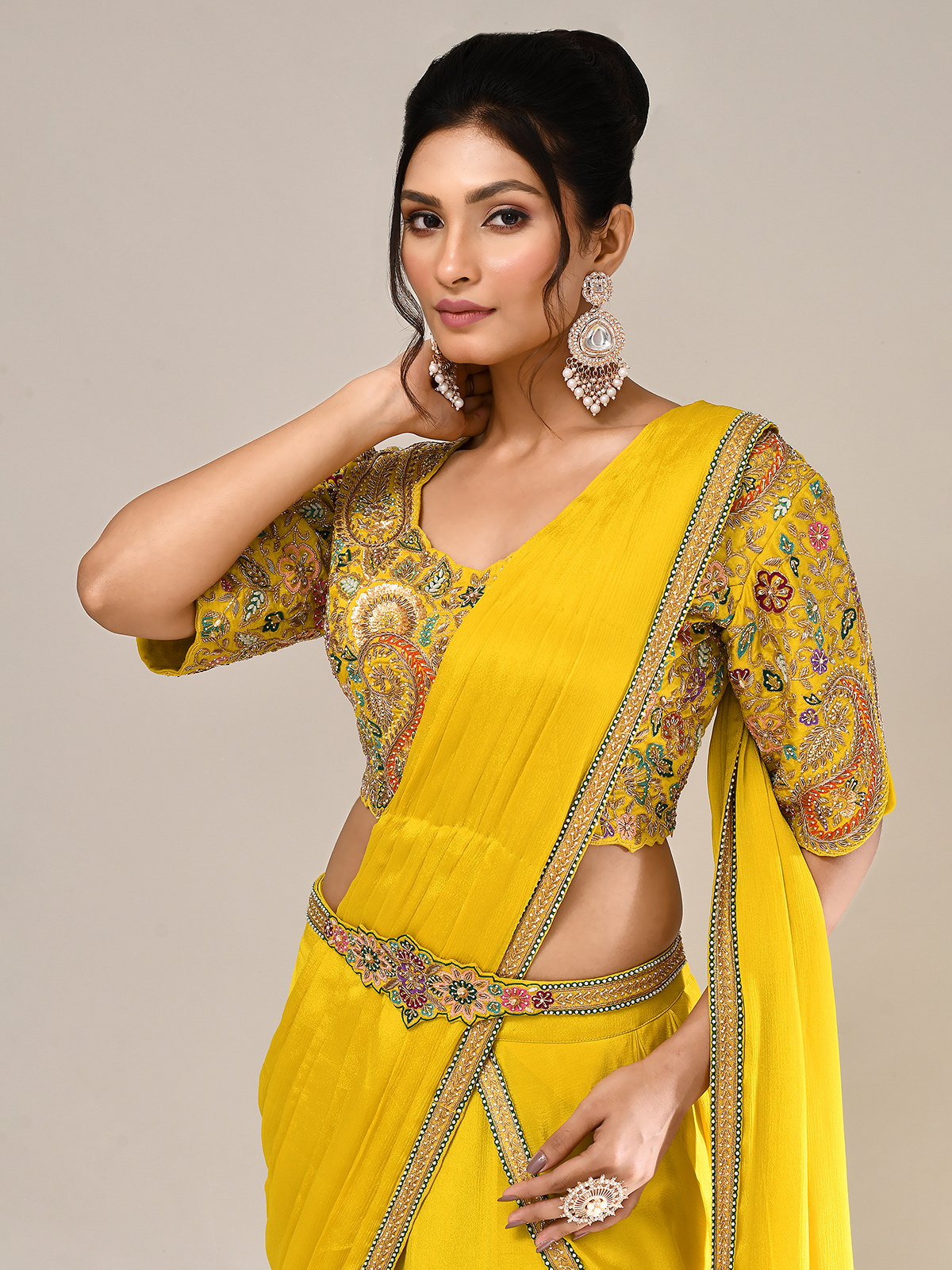 Infuse cheer into celebrations with this lime yellow chiffon silk lehenga choli, crafted for haldi and wedding occasions. Detailed with sequins, beads, cutdana, zardosi, and thread, it features elbow sleeves and an attached dupatta. A radiant designer piece that glows with vibrant festive beauty.