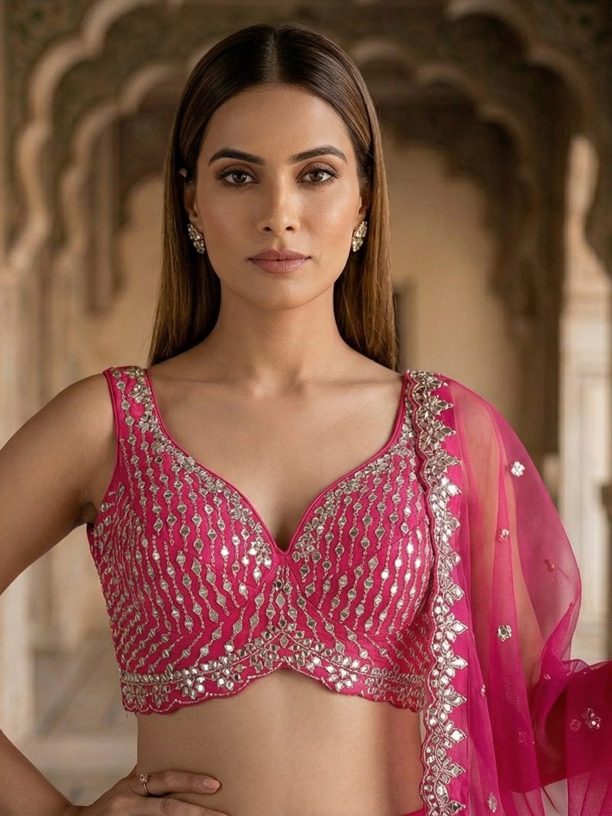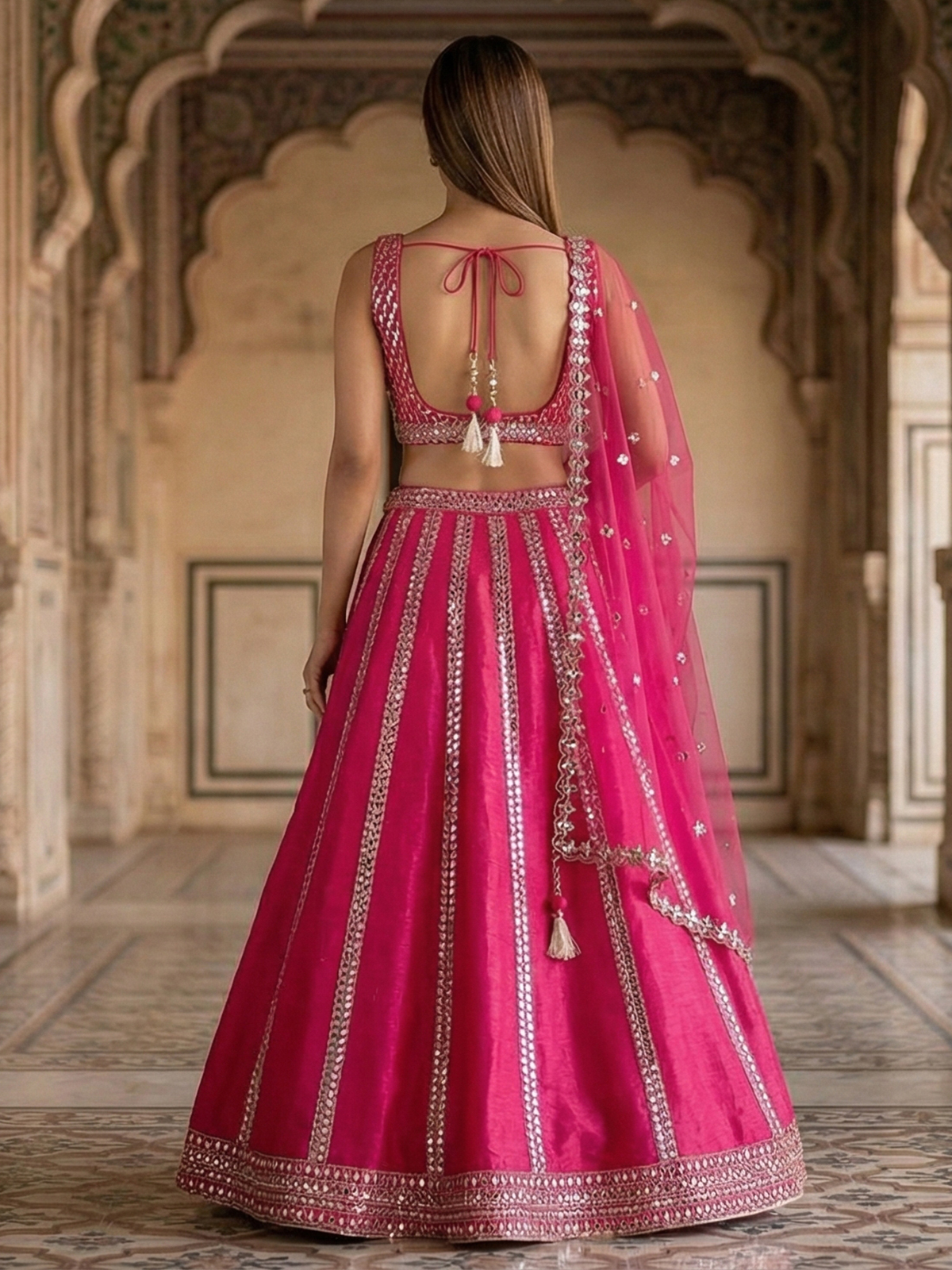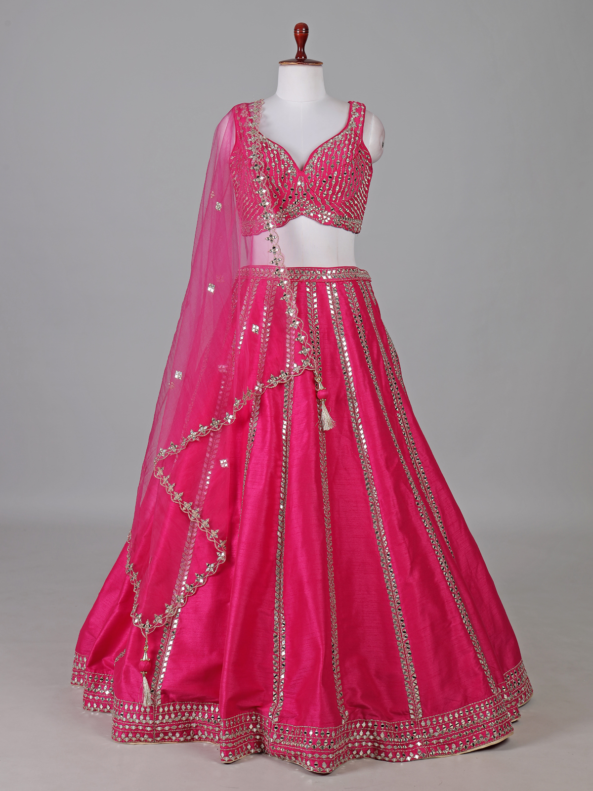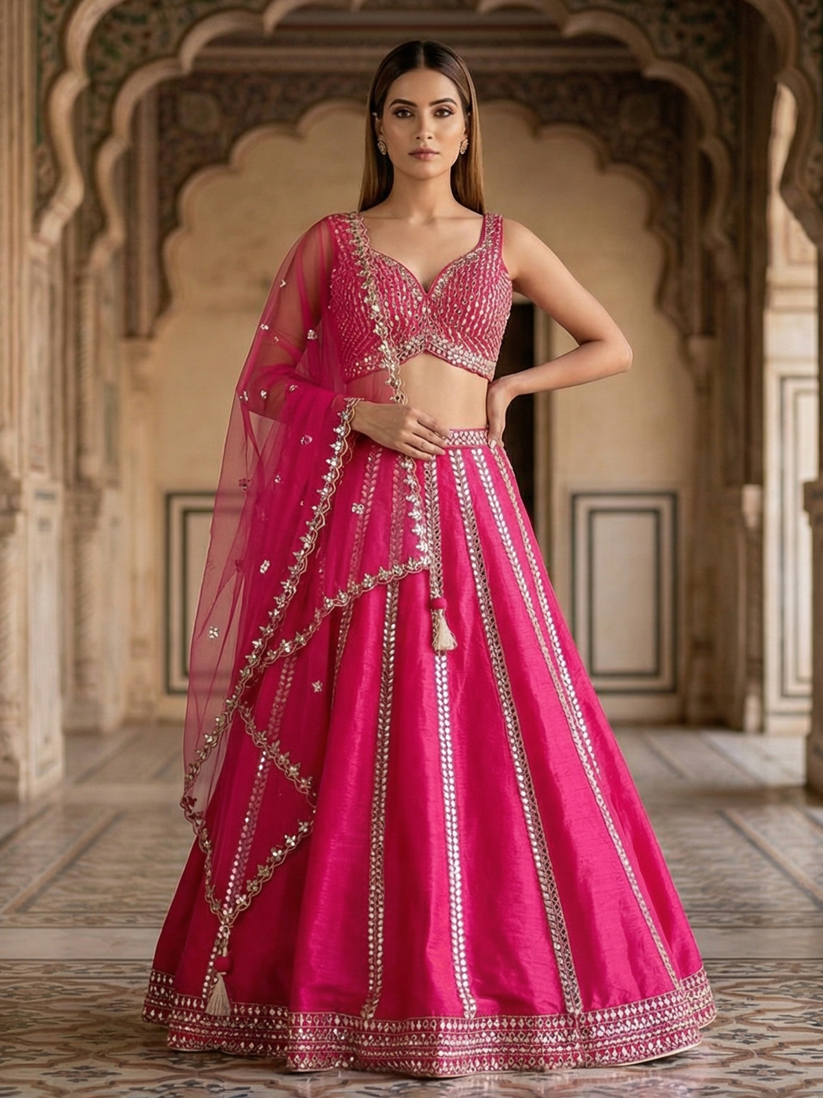 Bold magenta enrich this raw silk lehenga choli designed for striking elegance. Adorned with aabla and resham detailing. It reflects vibrant traditional charm. The sweetheart neckline and sleeveless blouse enhance its modern grace. Paired with a dupatta. This ensemble is perfect for weddings, receptions and festive celebrations.