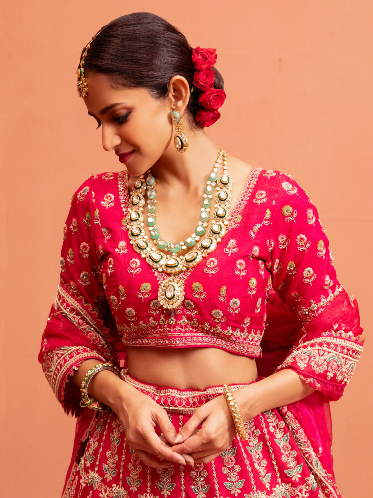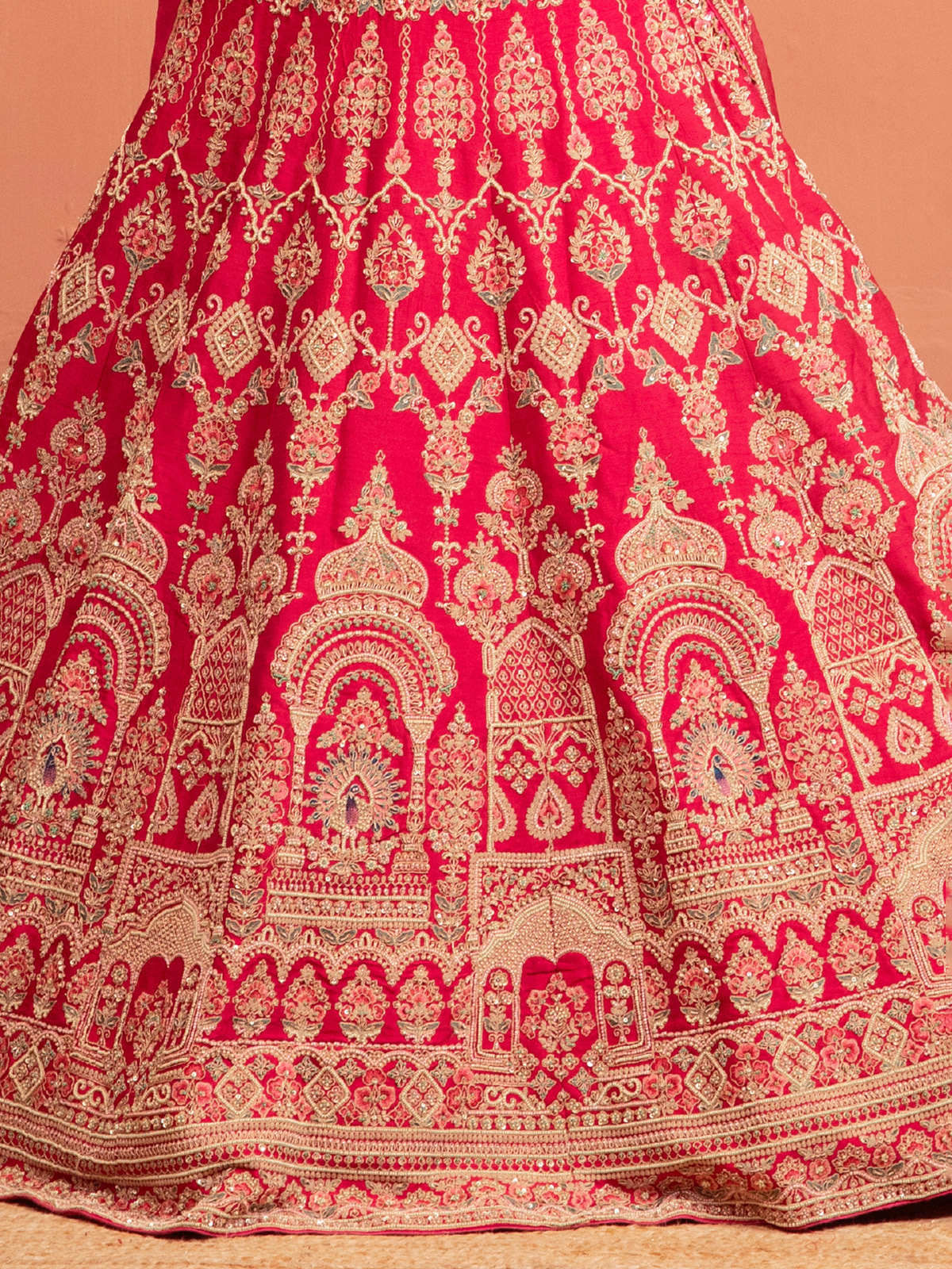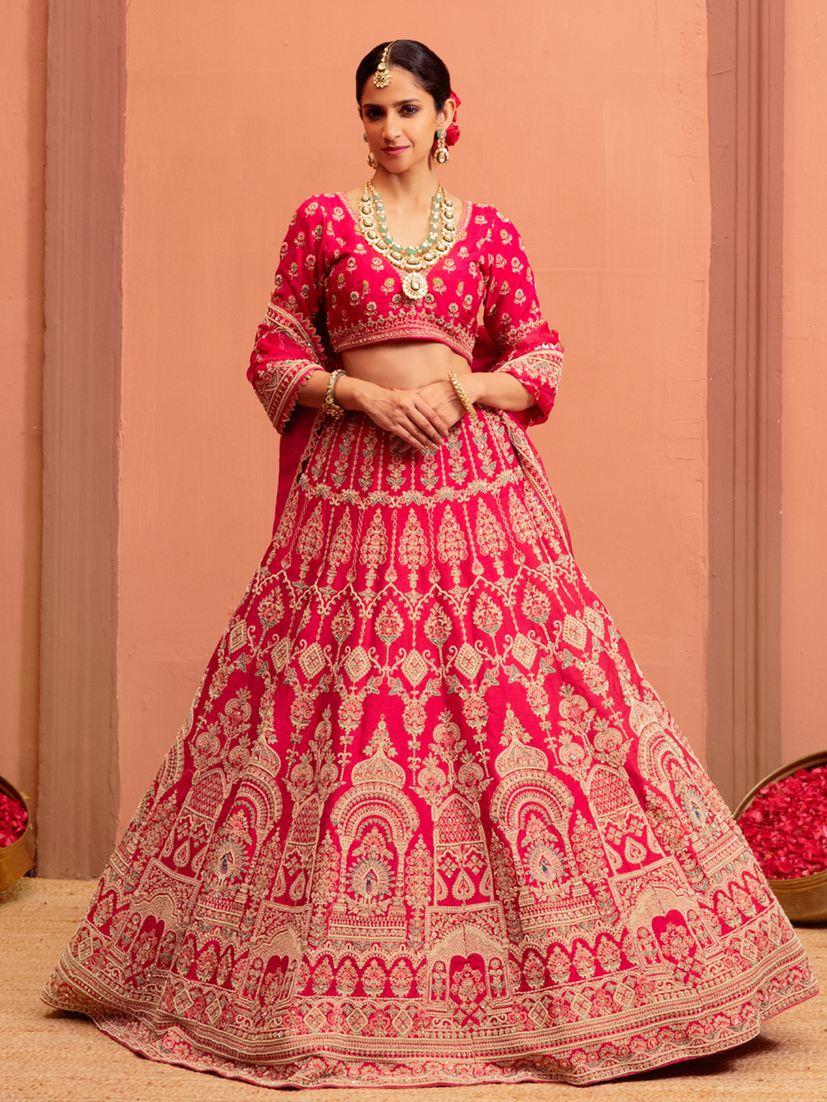 Grace your special day in this magenta raw silk lehenga choli, highlighted with zardosi, zari, sequins, thread, beads, and cutdana accents. Paired with an elegant elbow sleeve blouse, it is an exquisite ensemble perfect for bridal moments and grand wedding festivities.