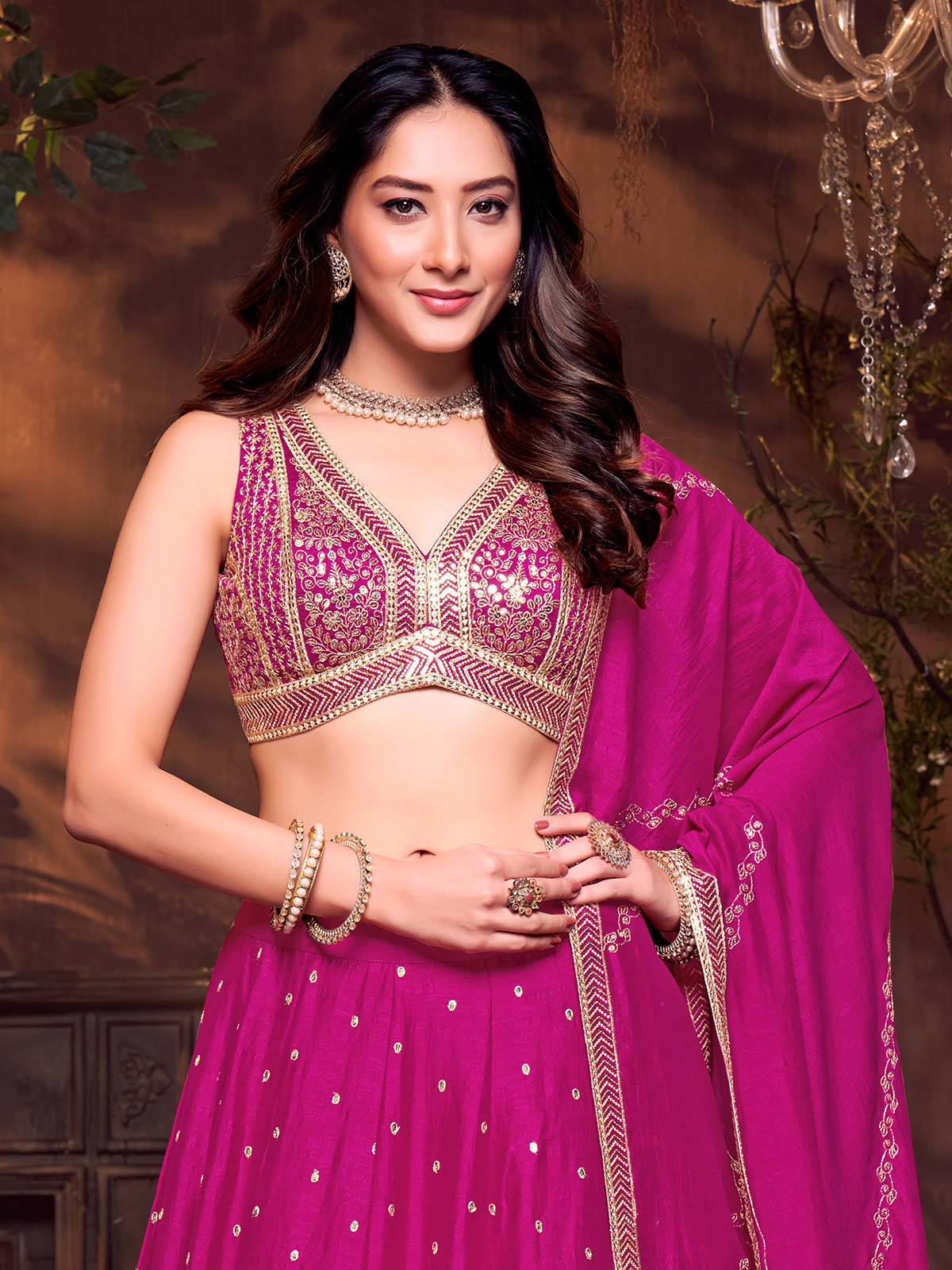 A charming magenta silk lehenga choli embellished with fine embroidery and sequins. Designed with a sweetheart neckline and sleeveless silhouette, it comes with a matching dupatta. A lovely choice for wedding and reception gatherings with its graceful feminine appeal.