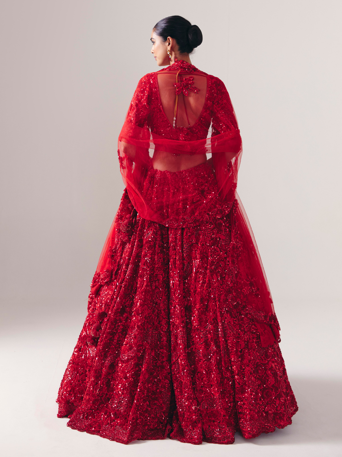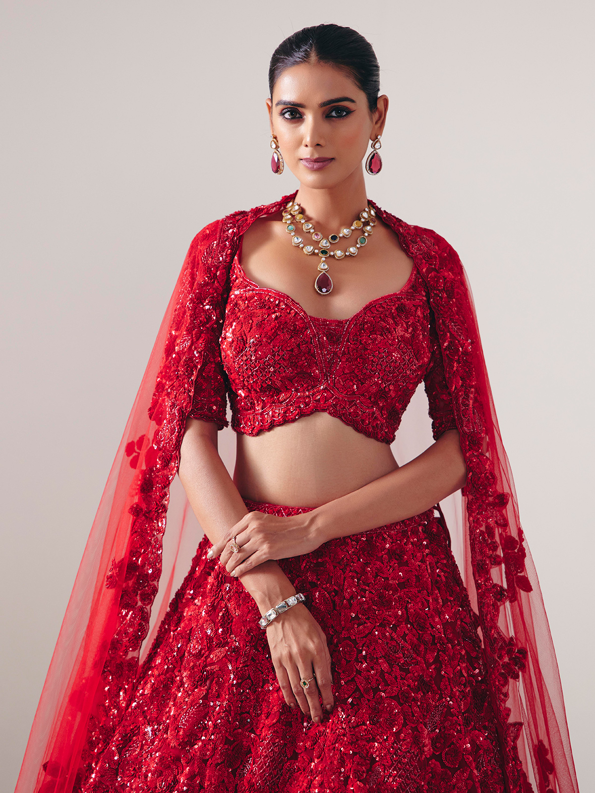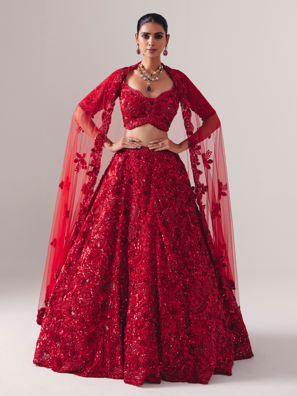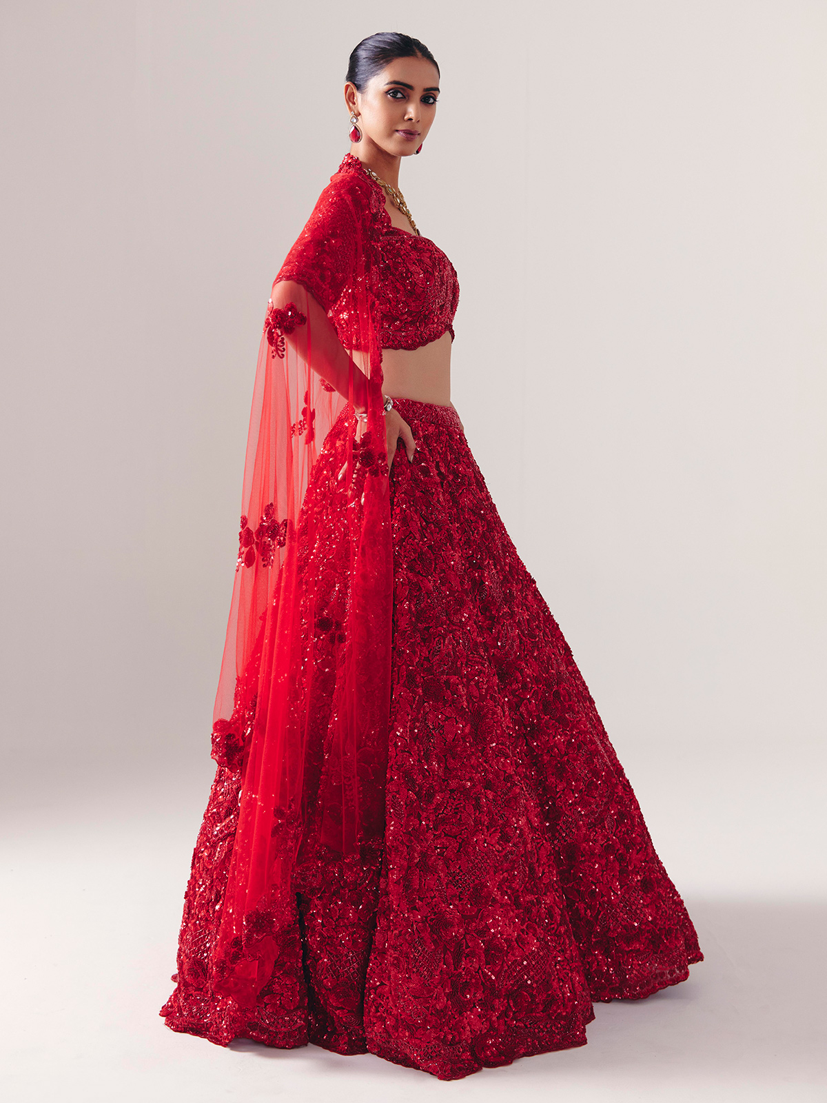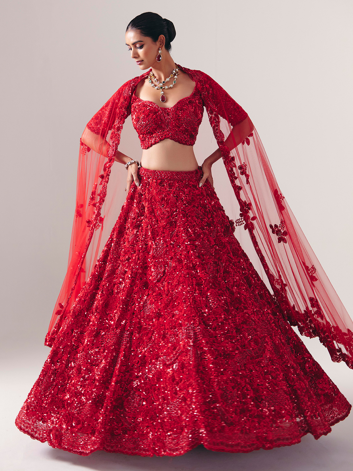 This maroon net lehenga shines with intricate cutdana and sequins work. Featuring a sweetheart neckline and elbow sleeves, it is paired with a dupatta for added grace. A striking pick for bridal celebrations, receptions, and weddings, balancing tradition with modern allure.