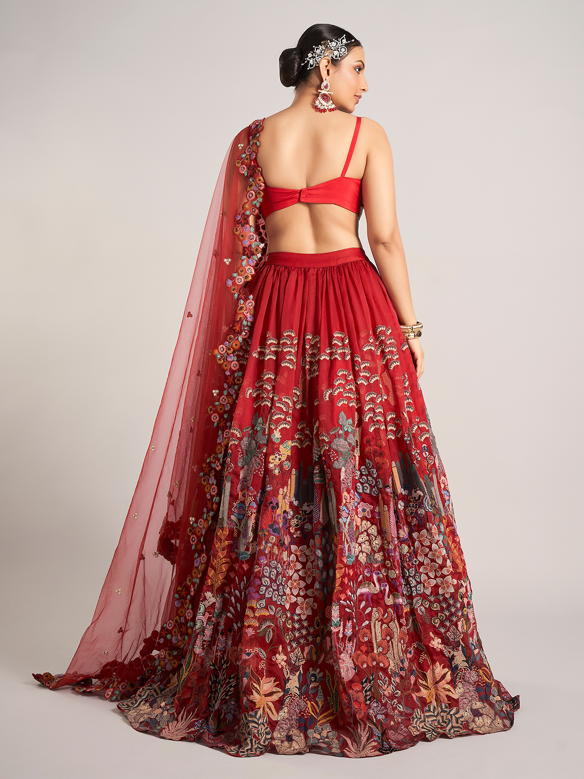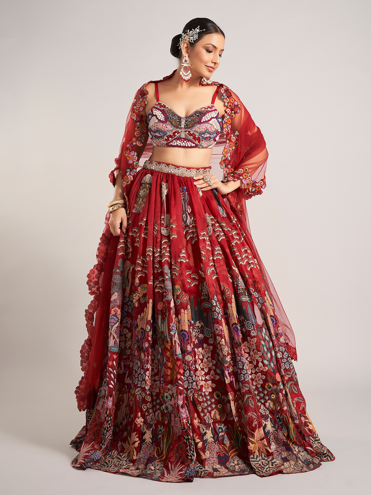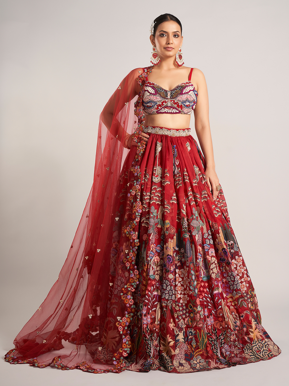 Turn heads in this maroon organza lehenga choli, embellished with pearls, thread, sequins, embroidery, zardosi, and beads. Styled with a round neckline, sleeveless cut, and dupatta, it exudes luxury for weddings and reception evenings.