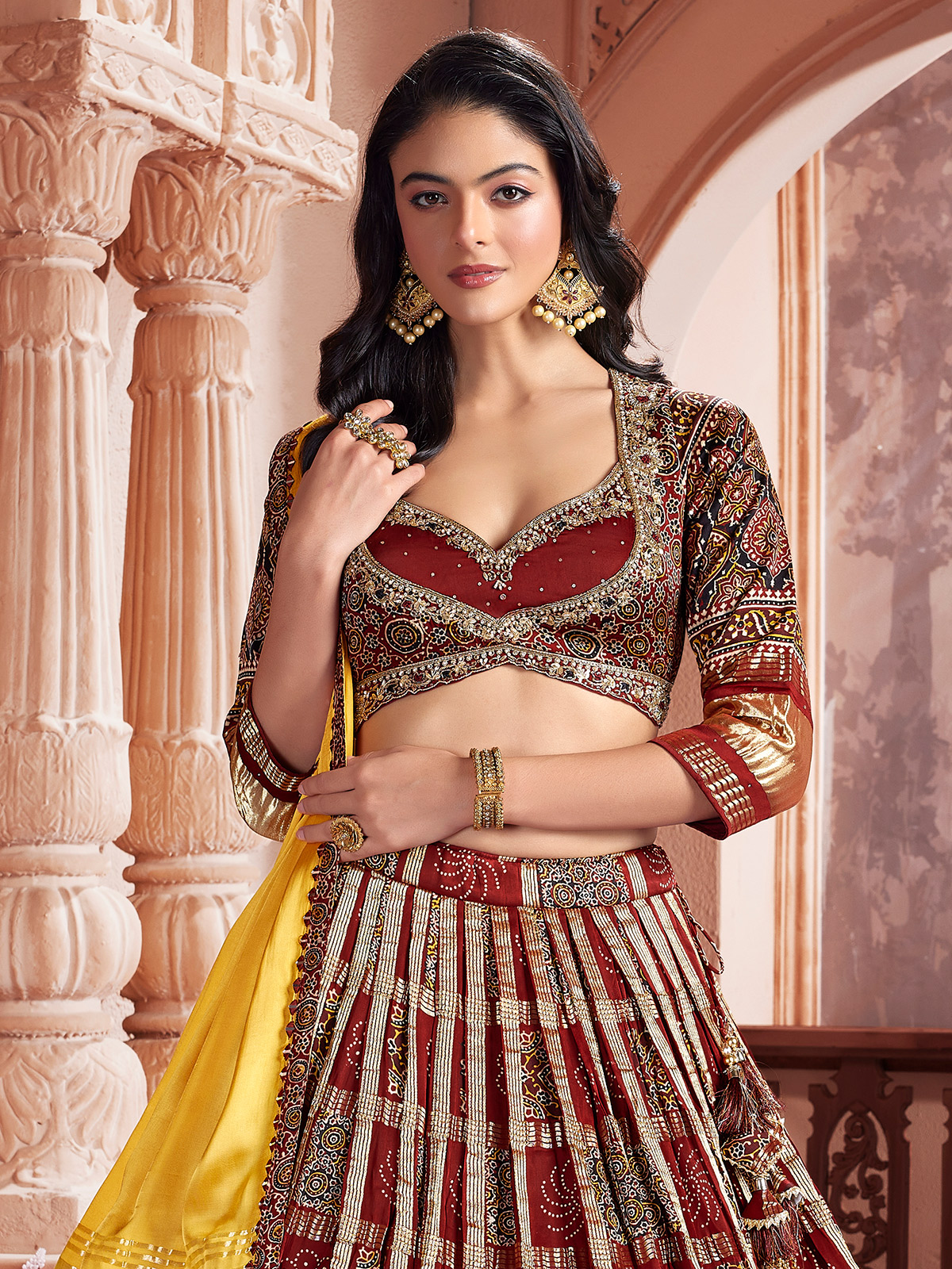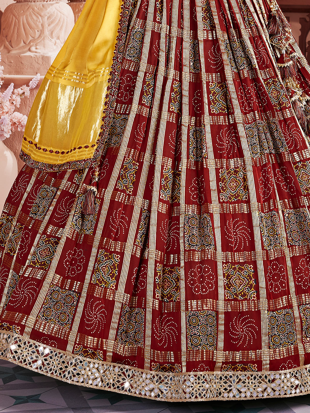 Maroon Printed Bandhej Silk Sweetheart Neck Lehenga Choli