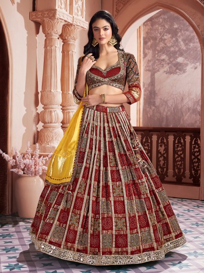 Blending print with craftsmanship, this maroon bandhej silk lehenga choli. Features intricate thread, cutdana, sequins, zardosi, diamond and mirror work. Styled with a sweetheart neckline and quarter sleeves. It is finished with a dupatta, making it a graceful pick for weddings, receptions and festive celebrations.