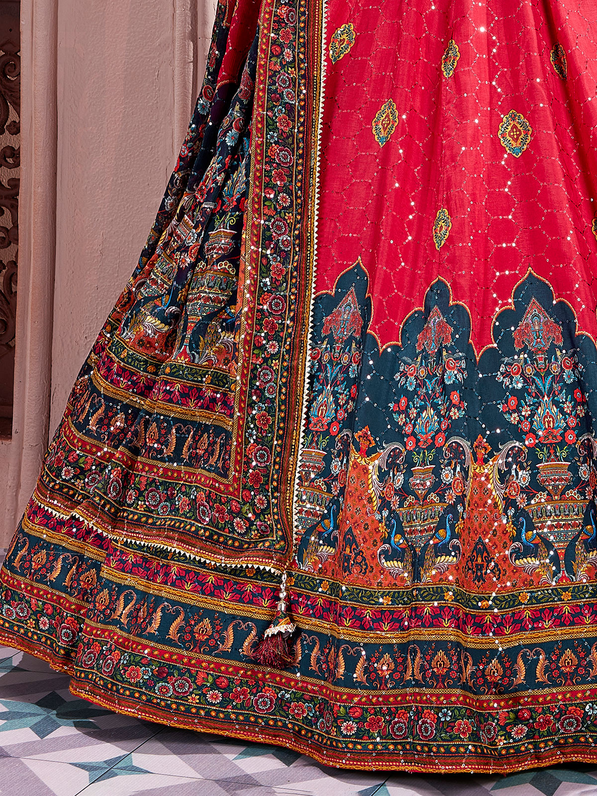 This maroon printed silk lehenga choli. Features refined thread work, sequins, cutdana, zardosi and diamond detailing. Styled with a sweetheart neckline and elbow sleeves, it flows beautifully with a dupatta, making it a timeless pick for weddings, receptions and traditional celebrations.