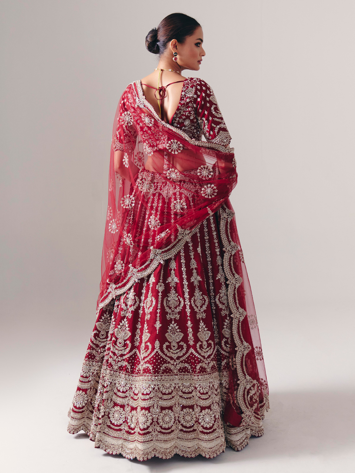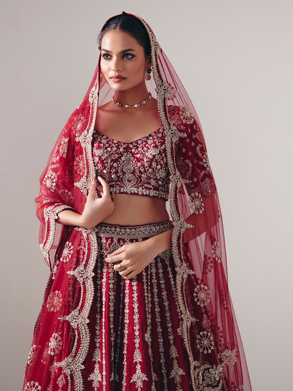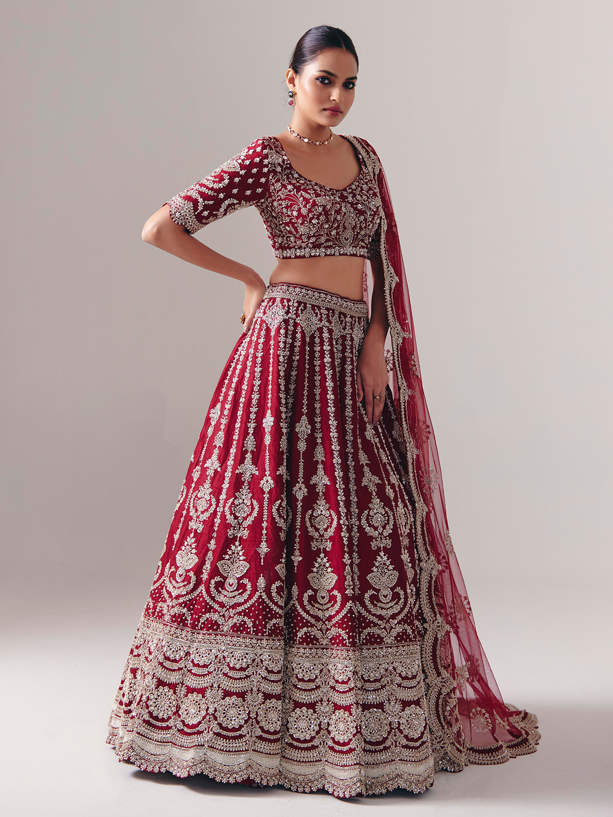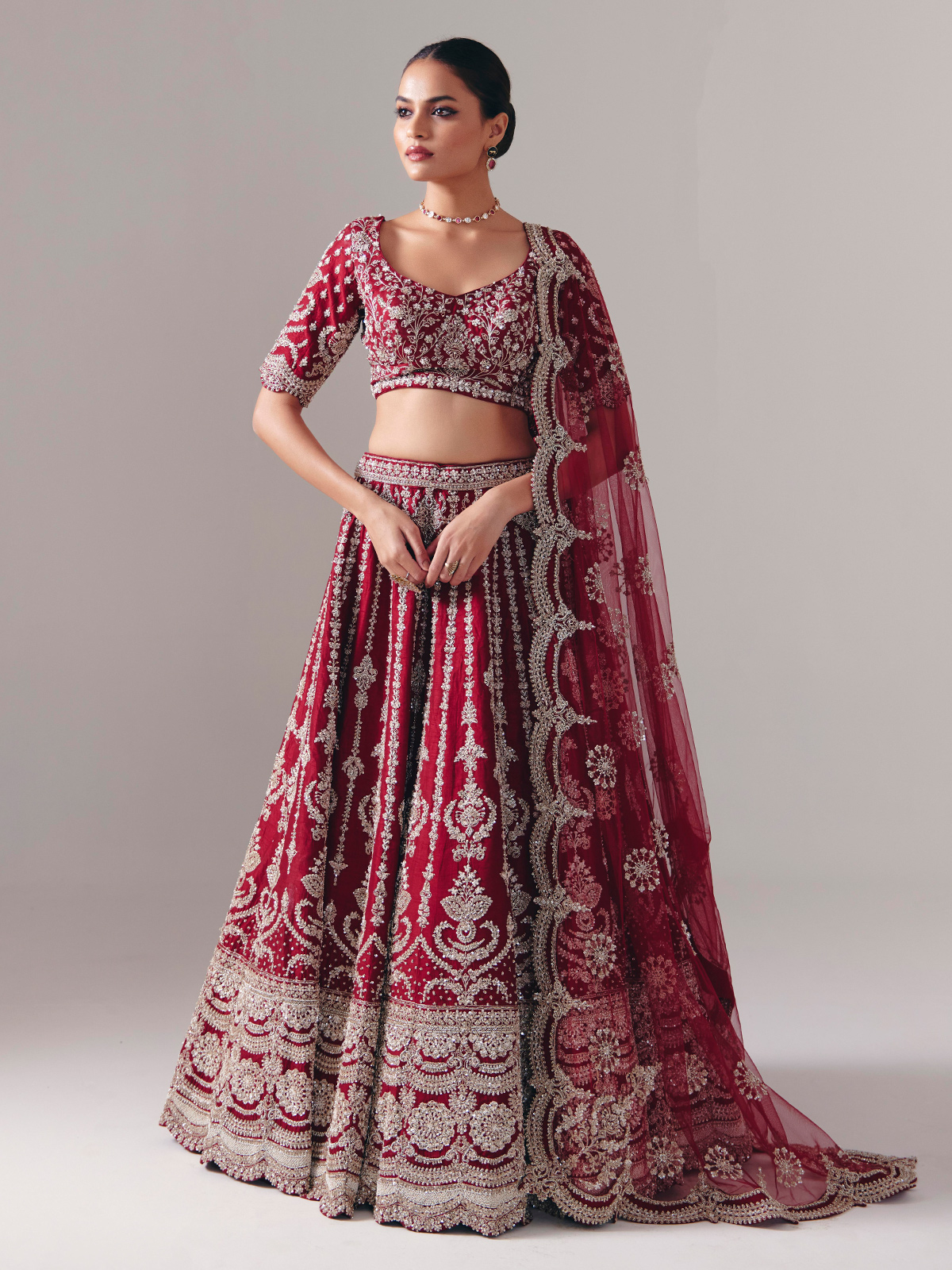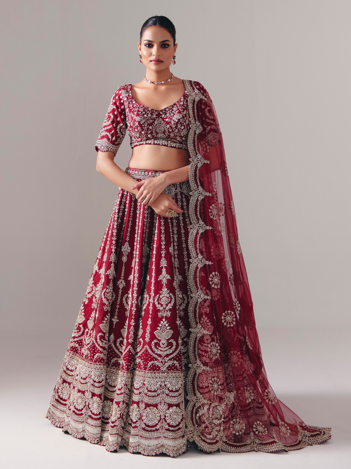 Rich maroon raw silk lehenga adorned with resham, sequins, beads, and zardosi craftsmanship. Styled with elbow sleeves and a sweetheart neckline, and paired with a dupatta, it is perfect for weddings, receptions, and bridal occasions, radiating timeless festive grandeur.