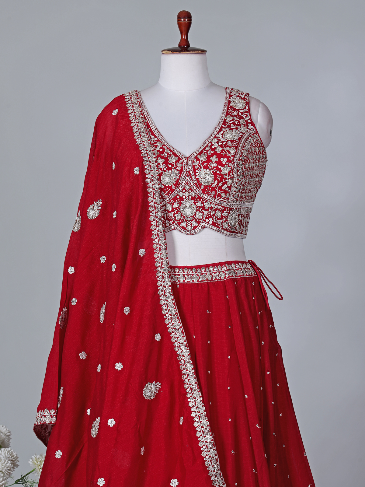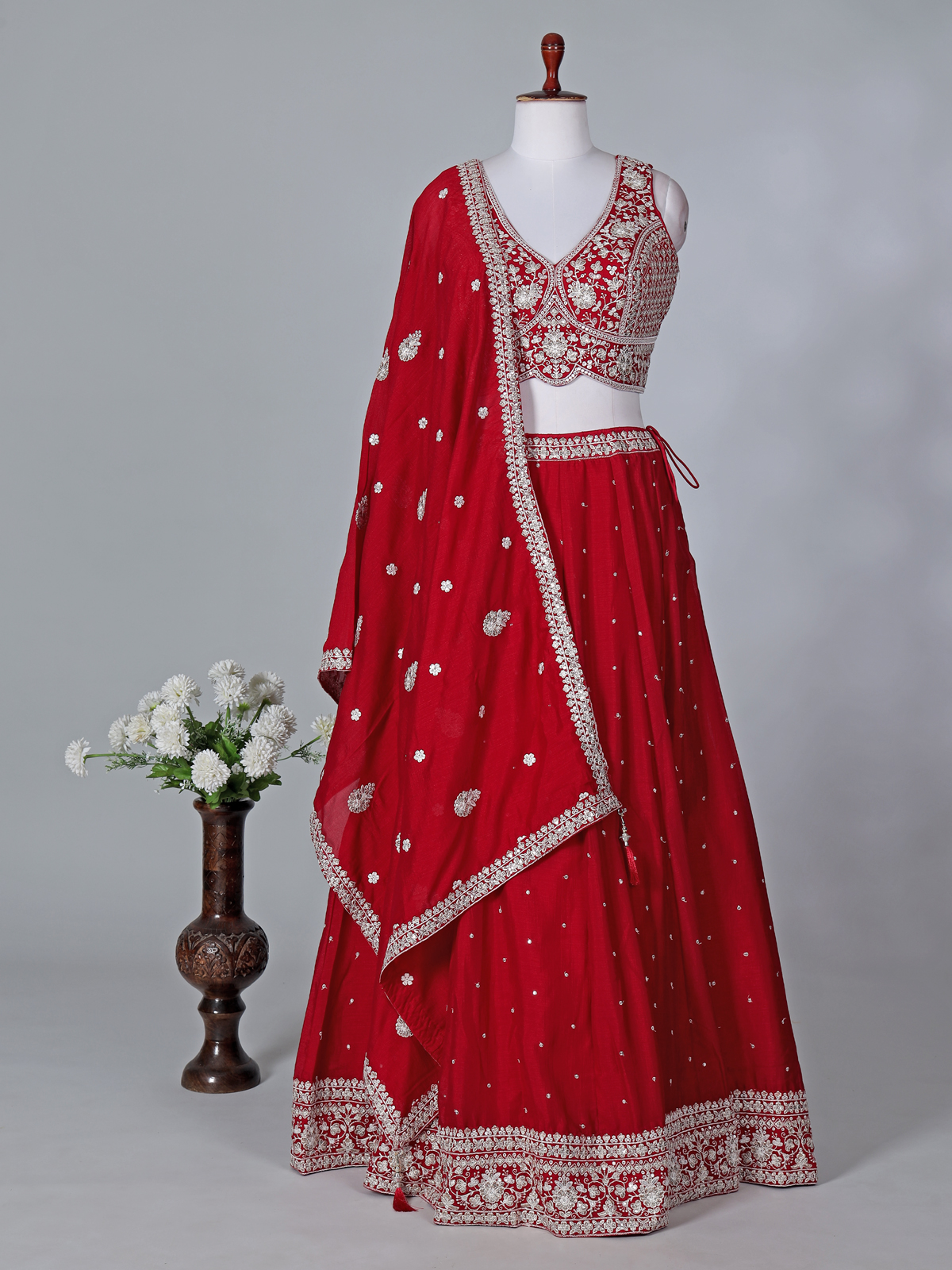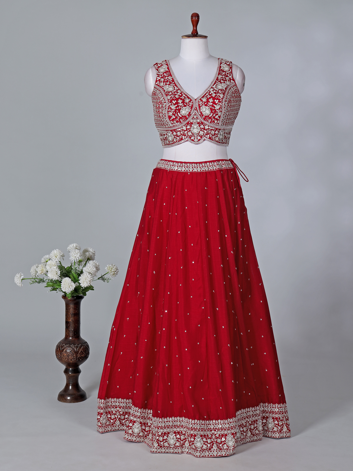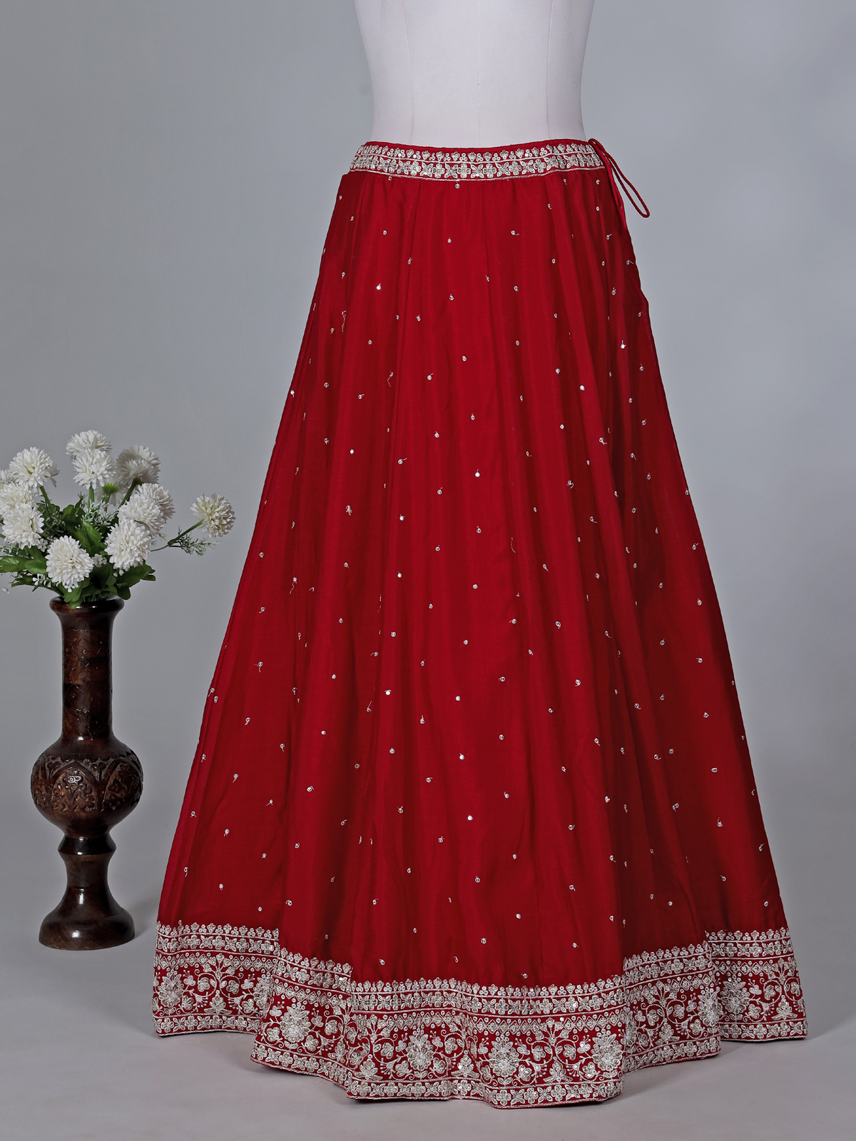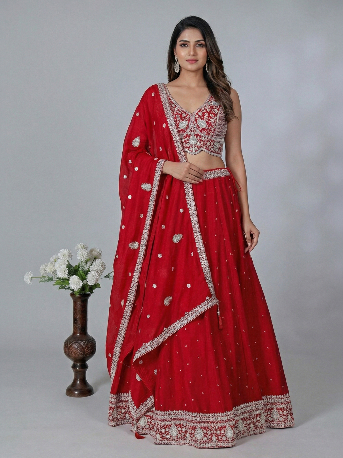 Rich and sophisticated, this maroon silk lehenga choli showcases elegant sequins, thread, and embroidery work for a royal festive finish. Featuring a sleeveless V-neck choli, it is paired with a beautifully flared lehenga and matching dupatta, making it an exquisite choice for weddings, sangeet celebrations, and reception occasions.