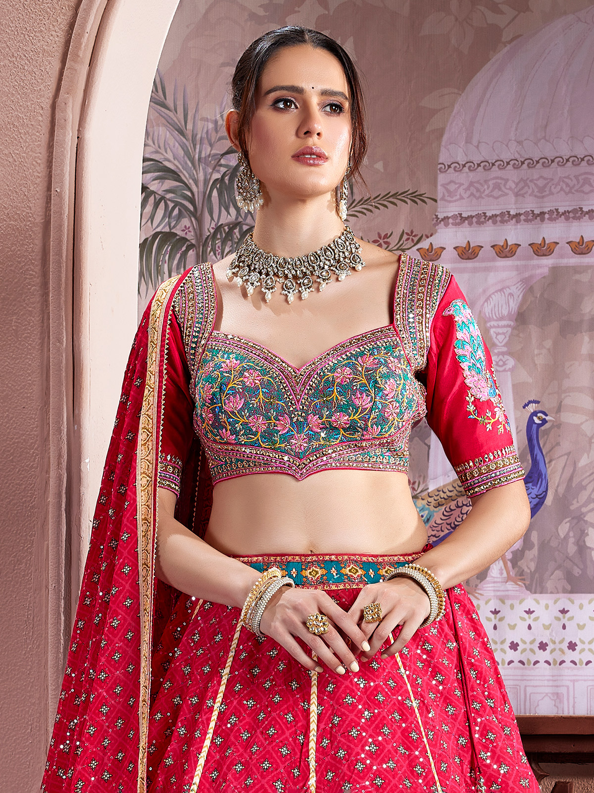 Draped in rich maroon silk lehenga choli. Features intricate thread embroidery layered with sequins, mirror, cutdana, zardosi and diamond detailing. Styled with a sweetheart neckline and elbow sleeves, it flows effortlessly with a dupatta, making it a striking choice for weddings and receptions.