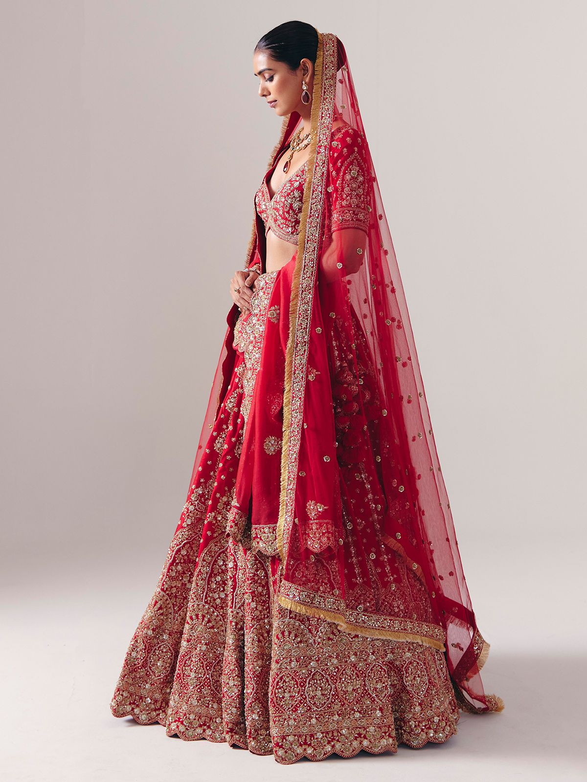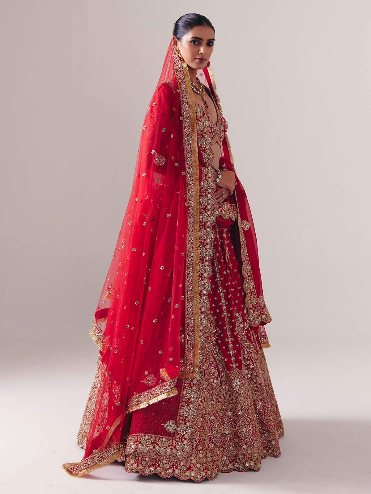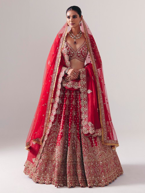 Crafted in maroon silk, this lehenga gleams with resham, beads, zardosi, cutdana, sequins, and diamond accents. Featuring a sweetheart neckline and half sleeves, it includes a dupatta. A fine choice for bridal ceremonies and weddings, blending traditional artistry with royal elegance.