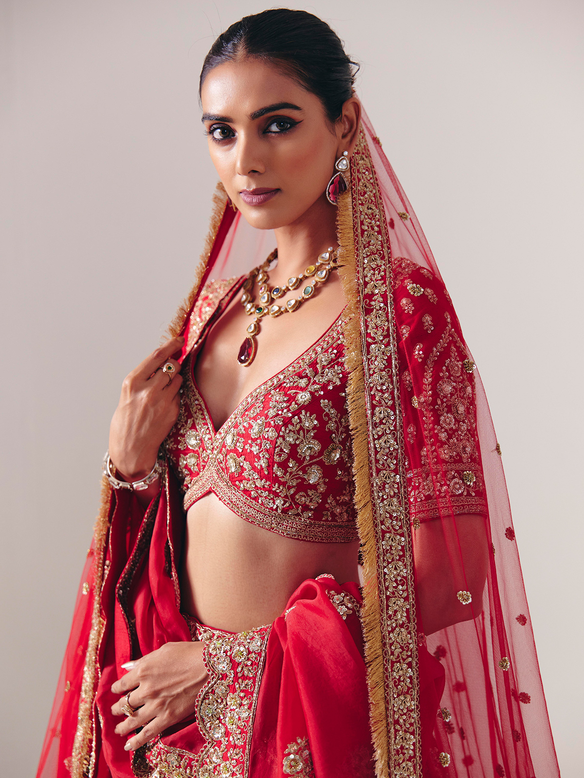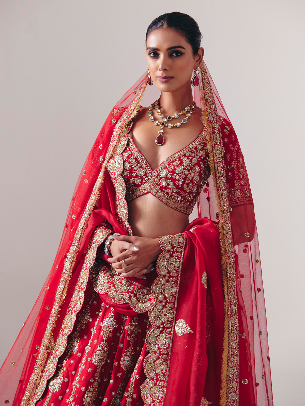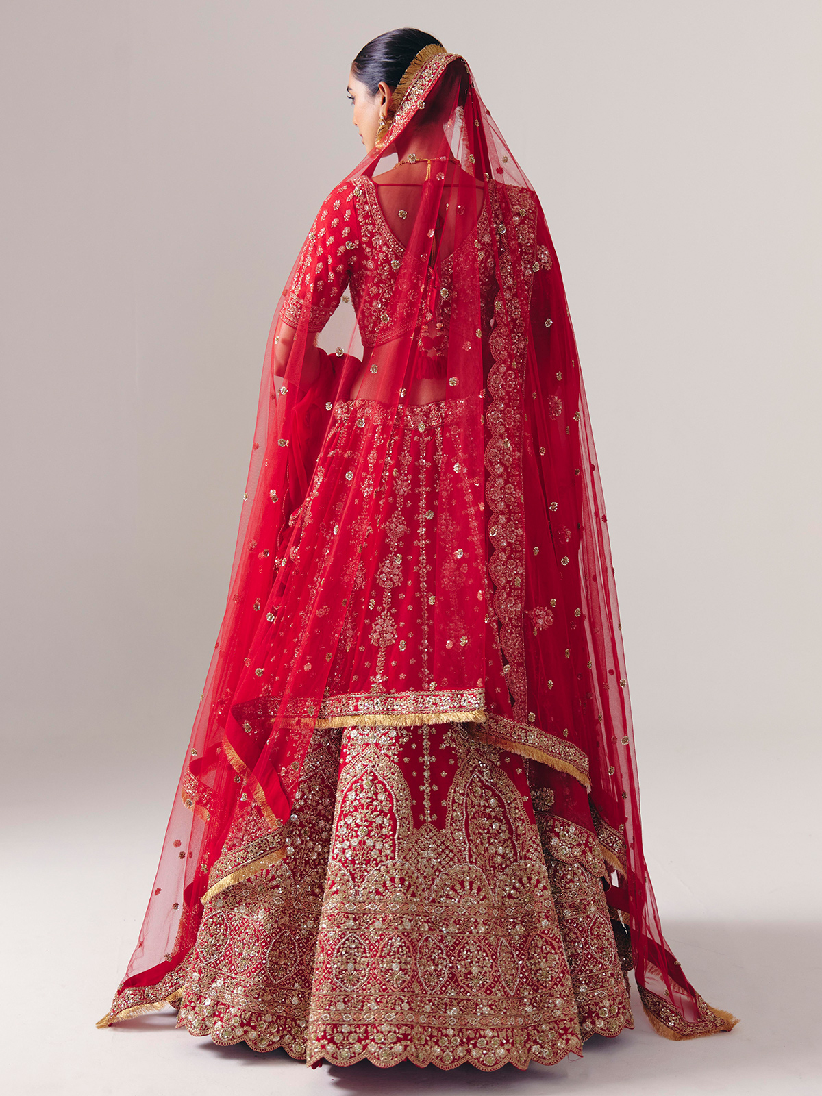 Crafted in maroon silk, this lehenga gleams with resham, beads, zardosi, cutdana, sequins, and diamond accents. Featuring a sweetheart neckline and half sleeves, it includes a dupatta. A fine choice for bridal ceremonies and weddings, blending traditional artistry with royal elegance.