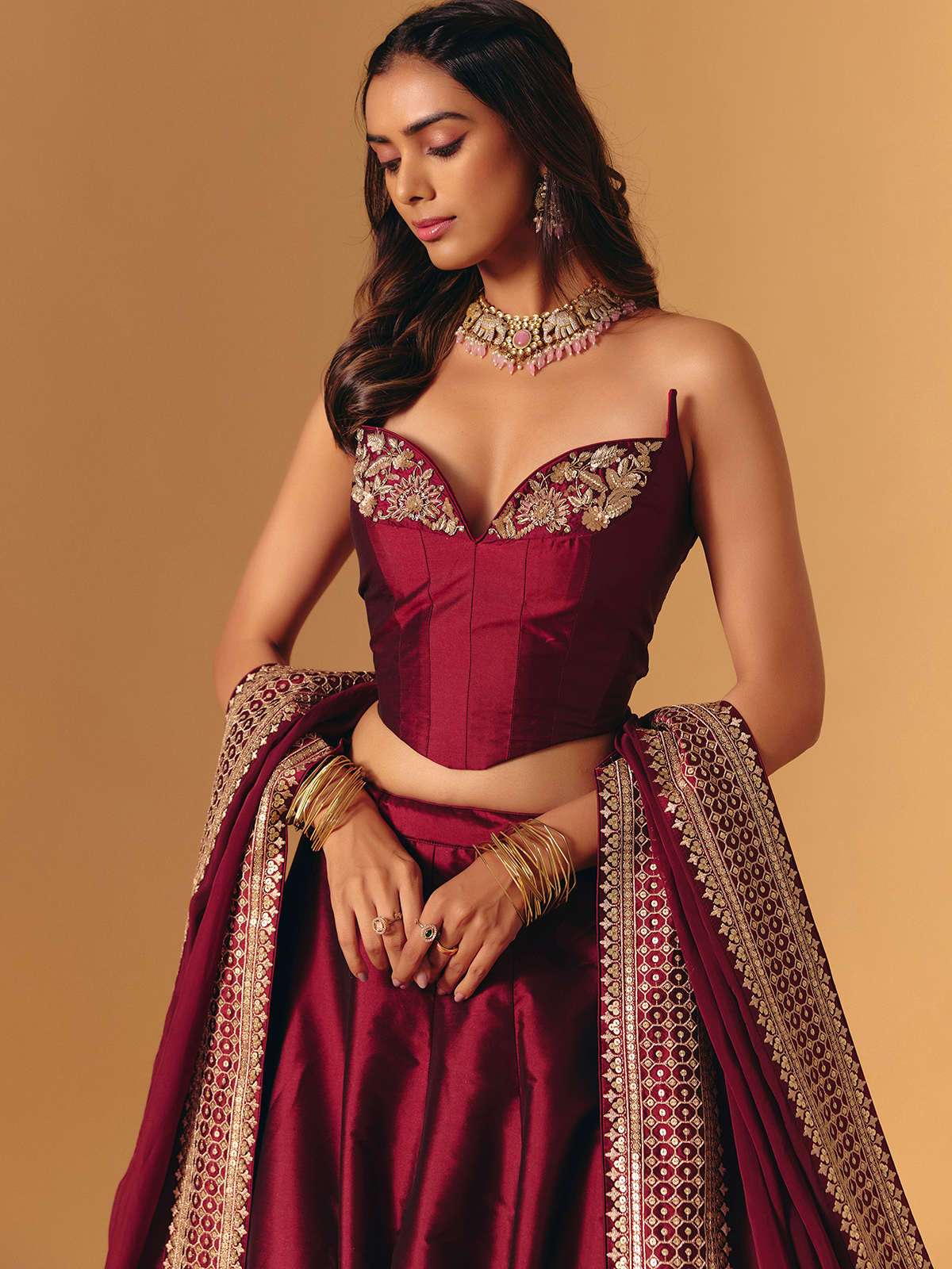 Make a royal statement in maroon silk embellished with embroidery, resham, diamond, sequins and zardosi work. The sweetheart sleeveless blouse and dupatta complement grand wedding and sangeet looks.