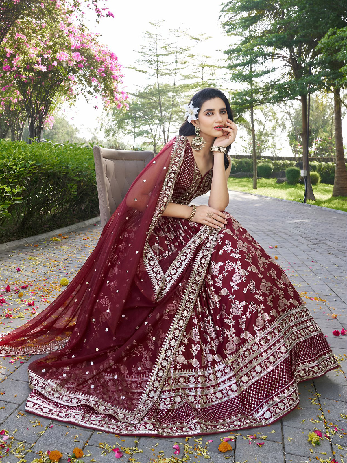 Regal unstitched lehenga choli designed in luxurious dola silk jacquard enriched with ornate zari and sequins craftsmanship. Styled alongside an elegant organza dupatta amplifying grandeur. Includes blouse fabric for bespoke tailoring. Perfect for wedding, reception, or sangeet gatherings, delivering majestic presence, traditional depth, and opulent celebratory expression.