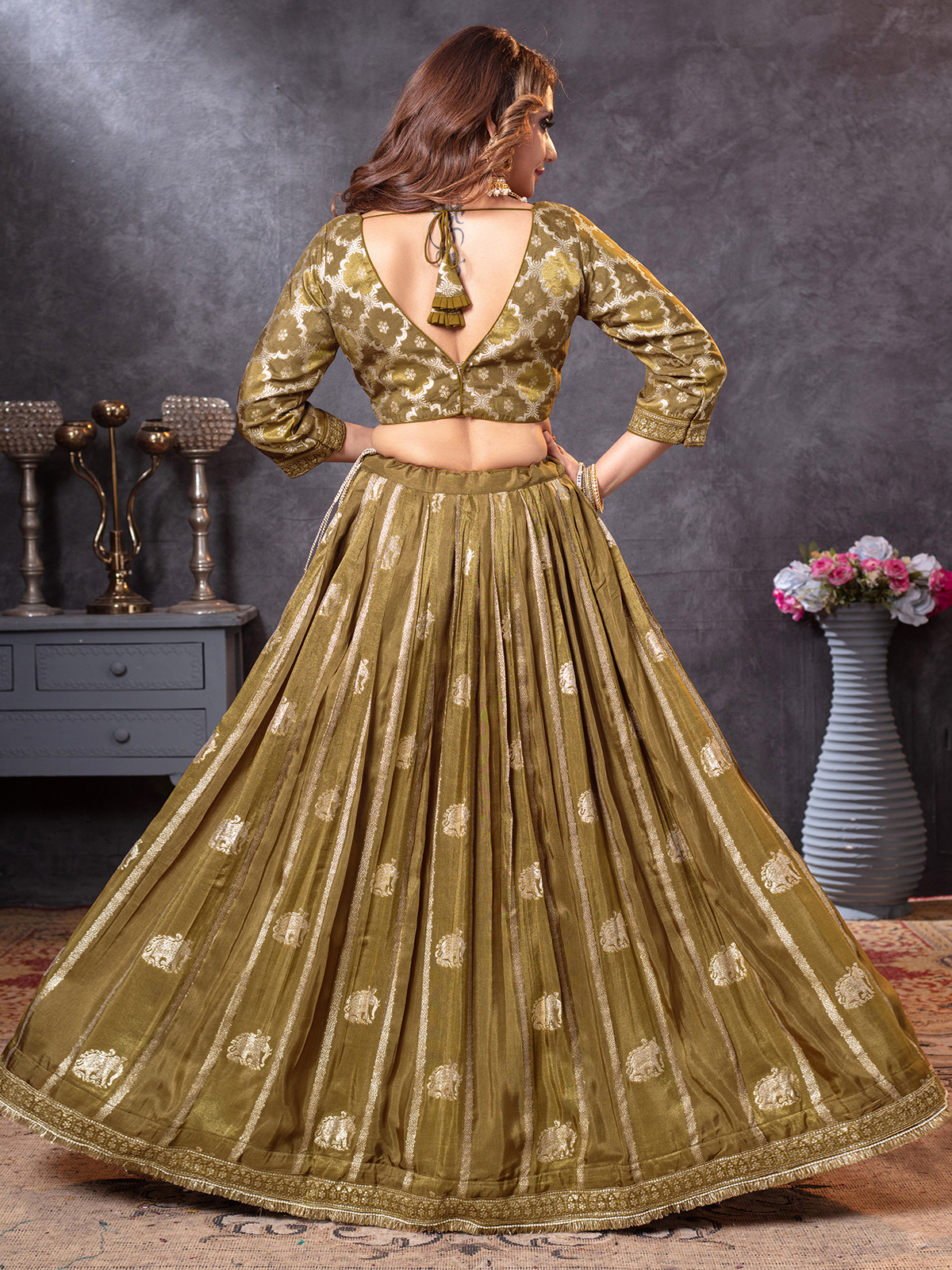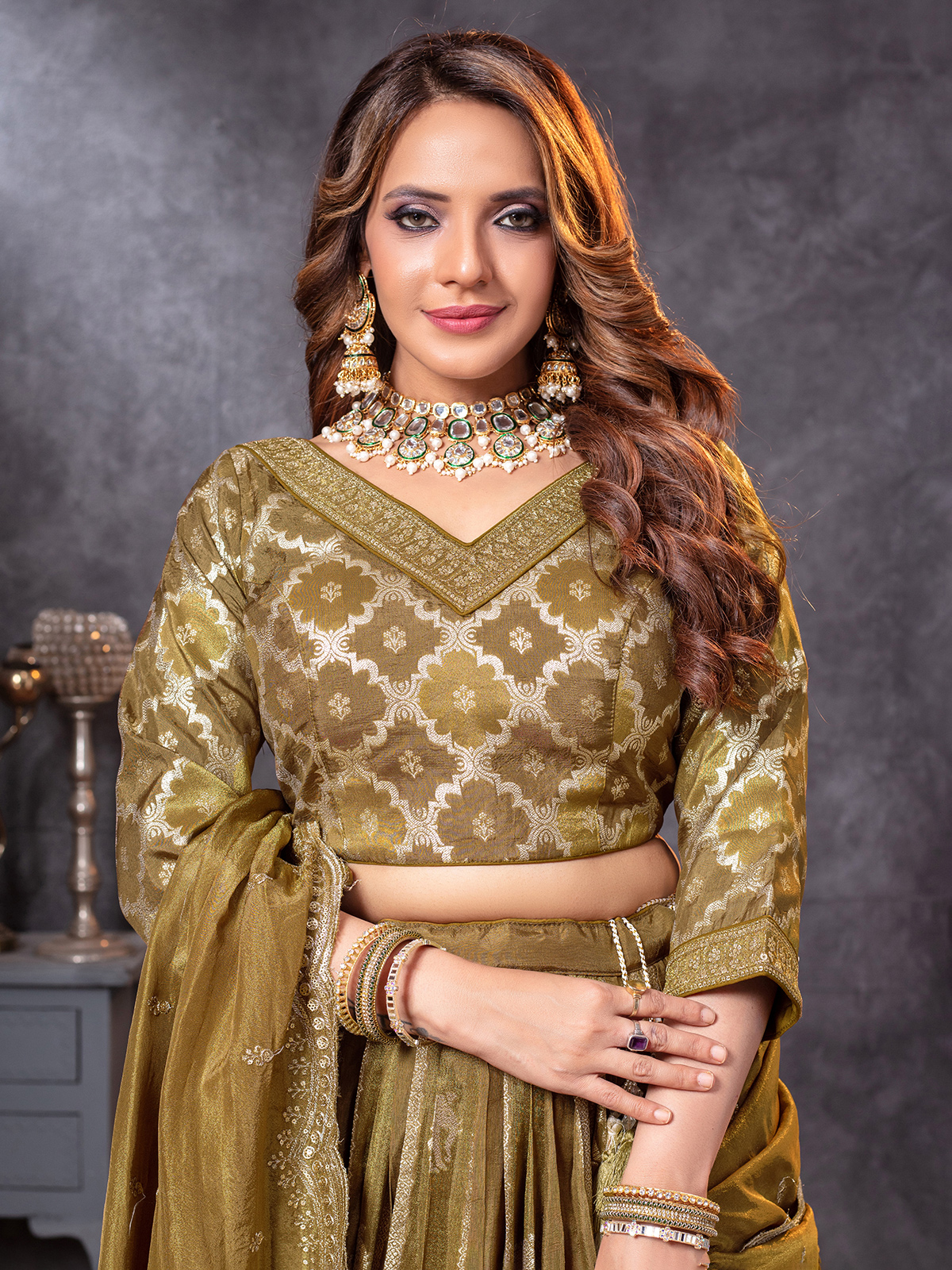 Mehendi olive tissue silk lehenga choli shimmering with resham, sequins, and zari work. Styled with a V neckline, quarter sleeves, and paired with a dupatta, it is perfect for weddings, bridal celebrations, and mehendi ceremonies.