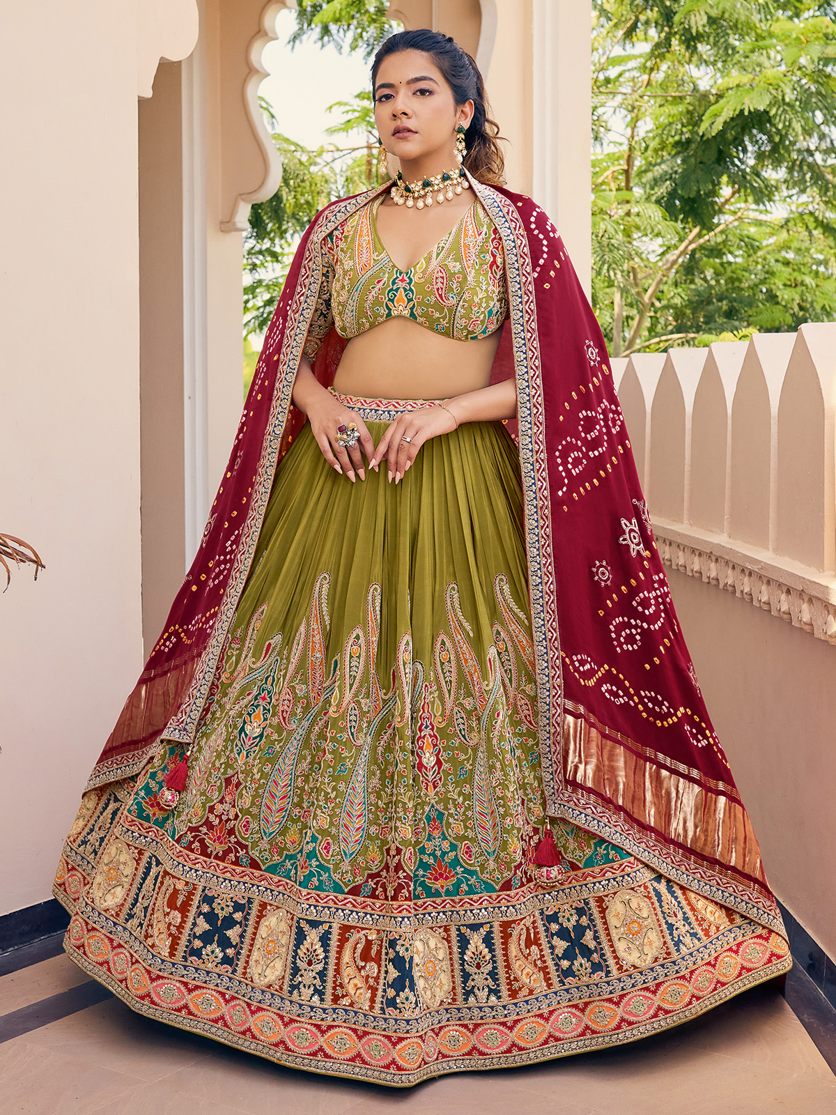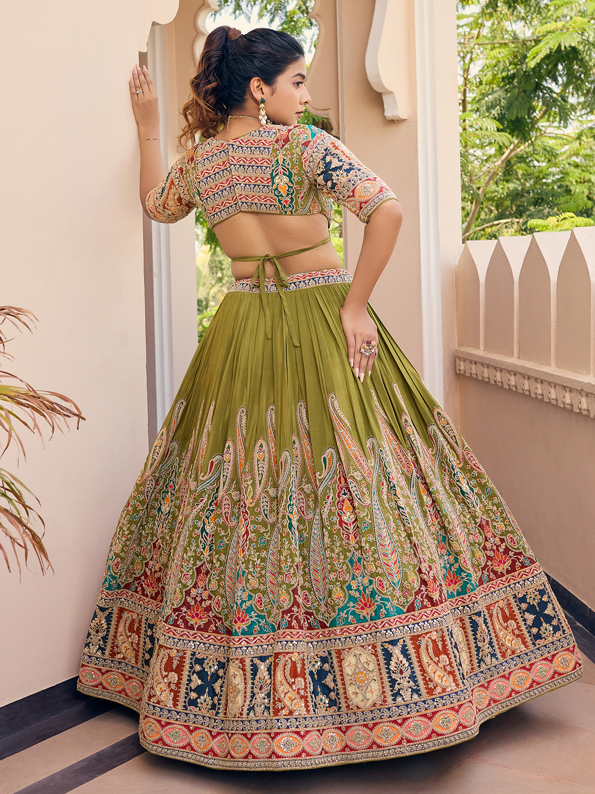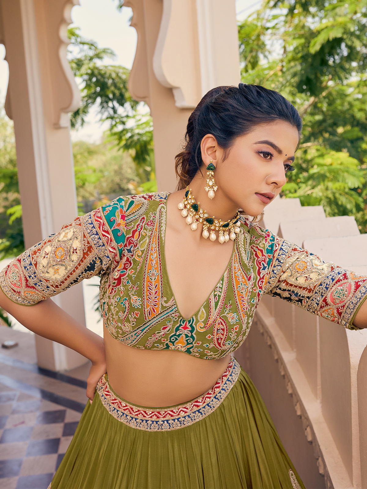 Make a statement in this mehndi green silk printed lehenga choli, enhanced with zari, zardosi, and sequins work. The V neck and elbow sleeves choli come with a dupatta.
