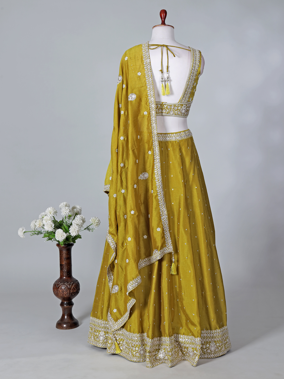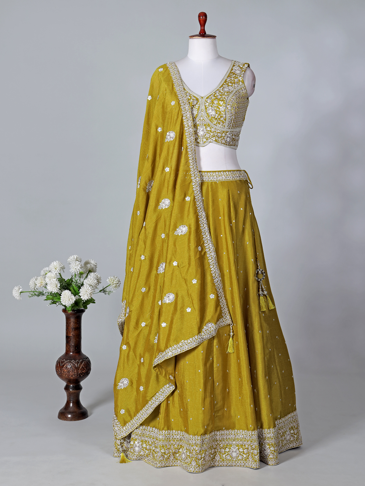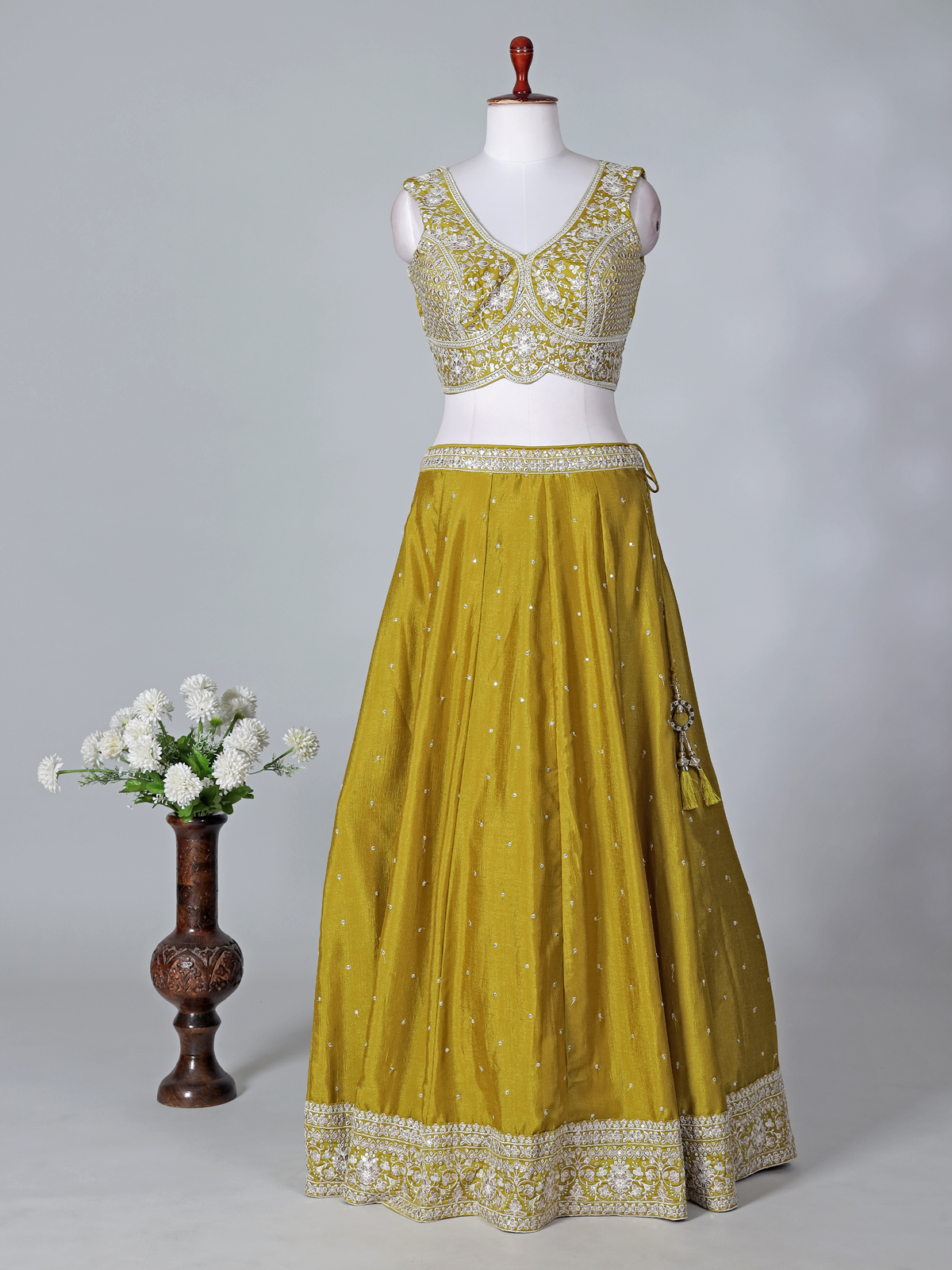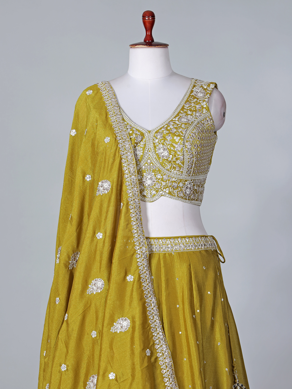 Fresh and celebratory, this mehndi green silk lehenga choli is highlighted with sequins, thread, and intricate embroidery work. The sleeveless V-neck choli adds a modern touch, while the flowing lehenga and dupatta create a graceful ensemble, perfect for mehndi functions, weddings, sangeet events, and receptions.