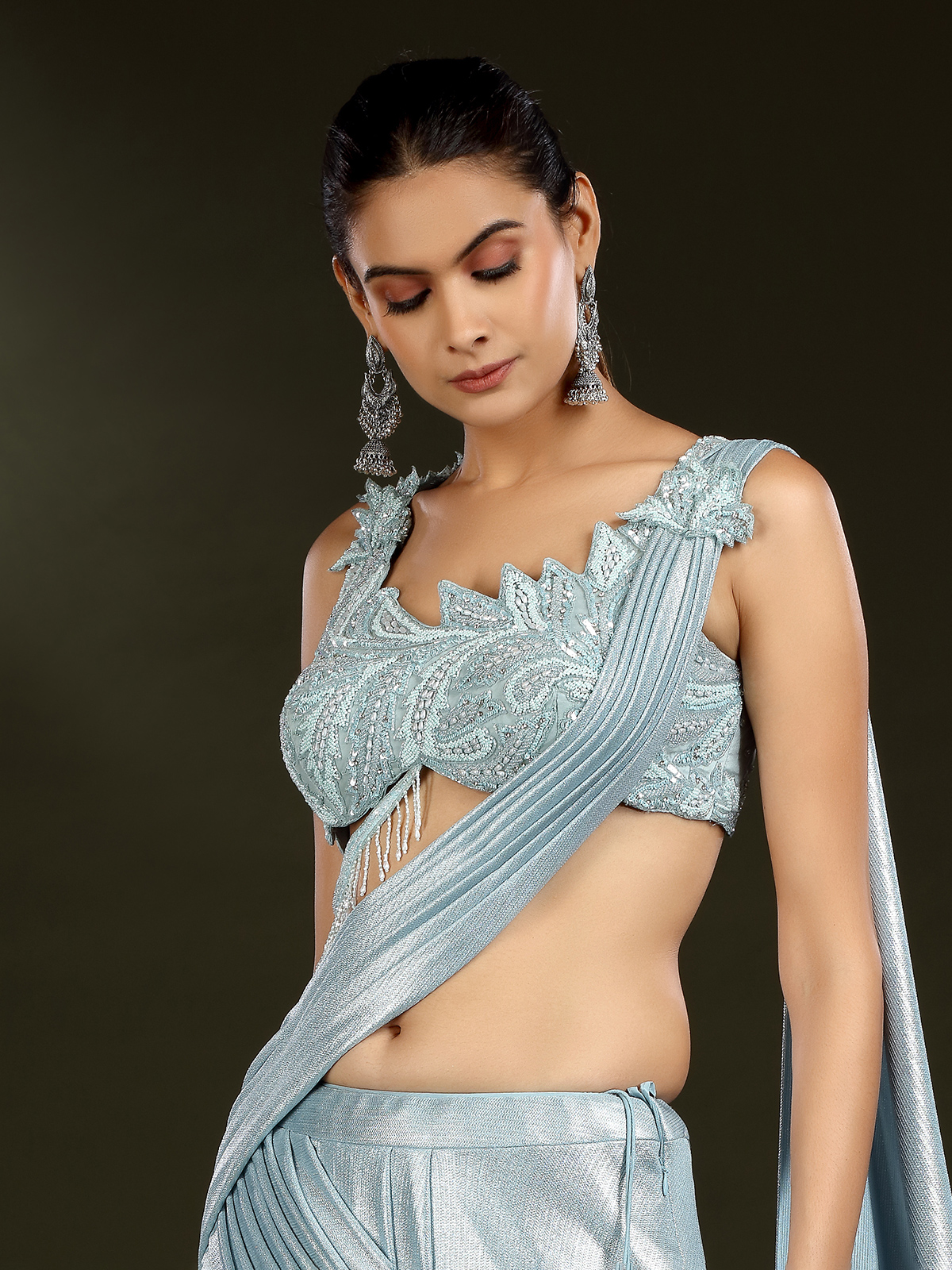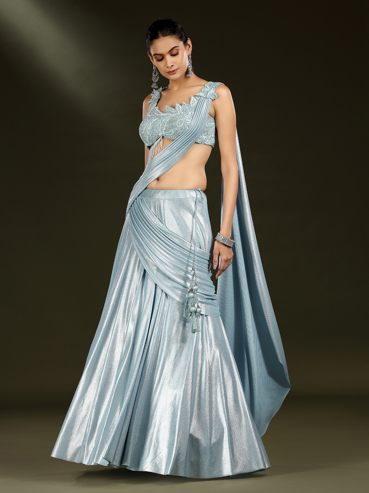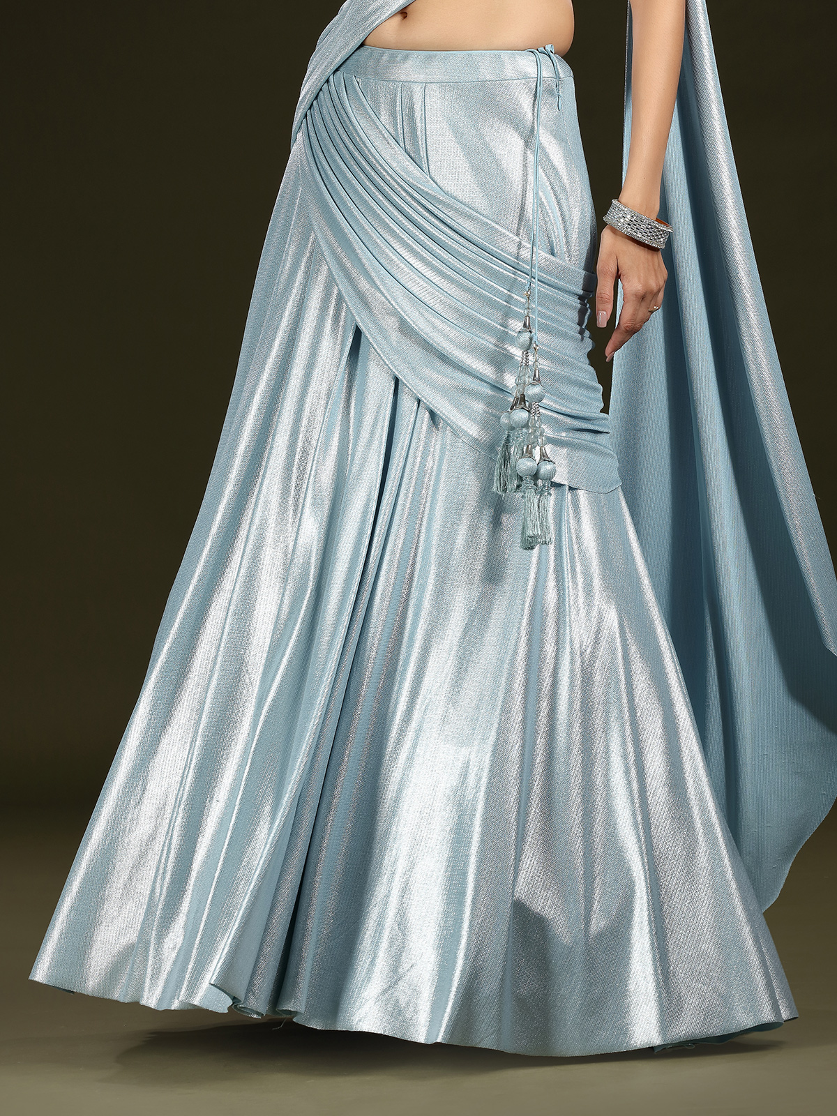 Crafted in mint blue metallic tissue, this lehenga choli glows with sequins, beads, cutdana, and diamond accents. The sleeveless silhouette pairs effortlessly with the attached dupatta. Perfect for weddings, receptions, or festive parties, it radiates youthful vibrance, offering timeless luxury in a fresh, luminous hue.