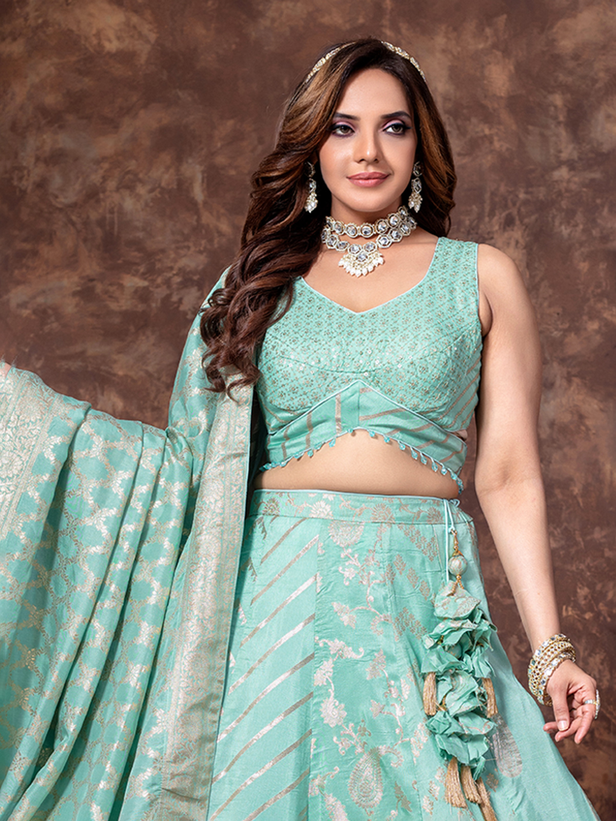 Mint Blue Tissue Silk Lehenga Choli For Wedding Occasions