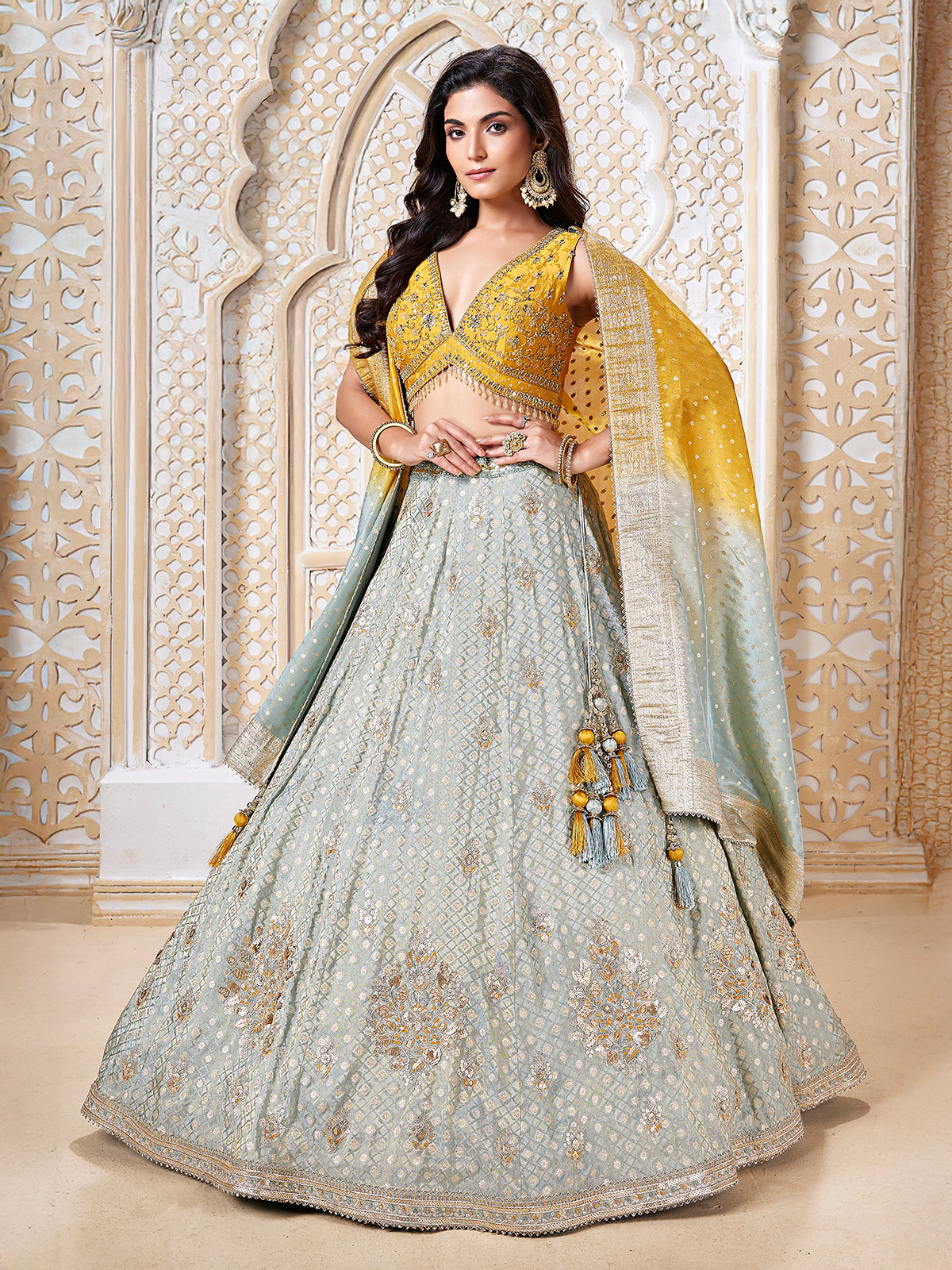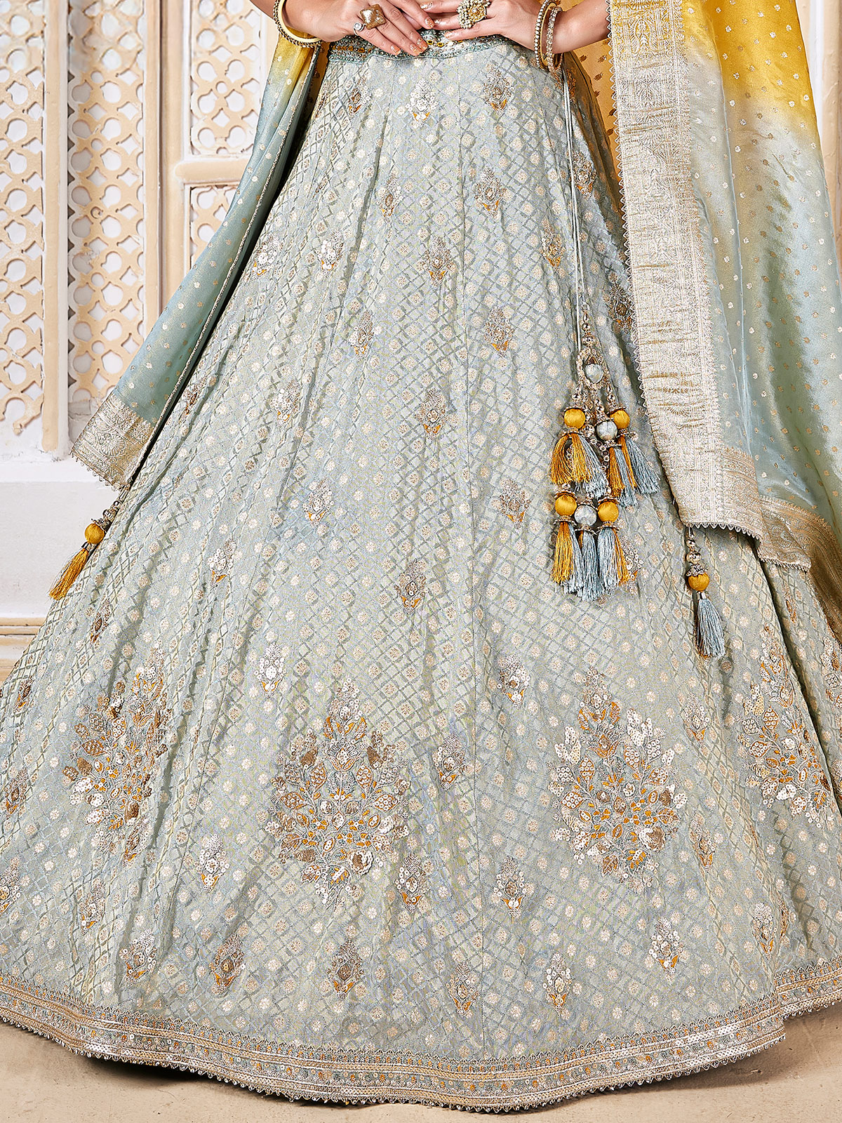 Crafted in refreshing mint blue silk, this lehenga choli showcases embroidery, sequins, aabla, cutdana, zari, and diamond embellishments. Styled with a V neckline and sleeveless silhouette, it comes with a dupatta, making it ideal for weddings and sangeet celebrations.
