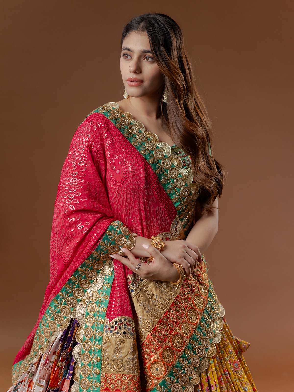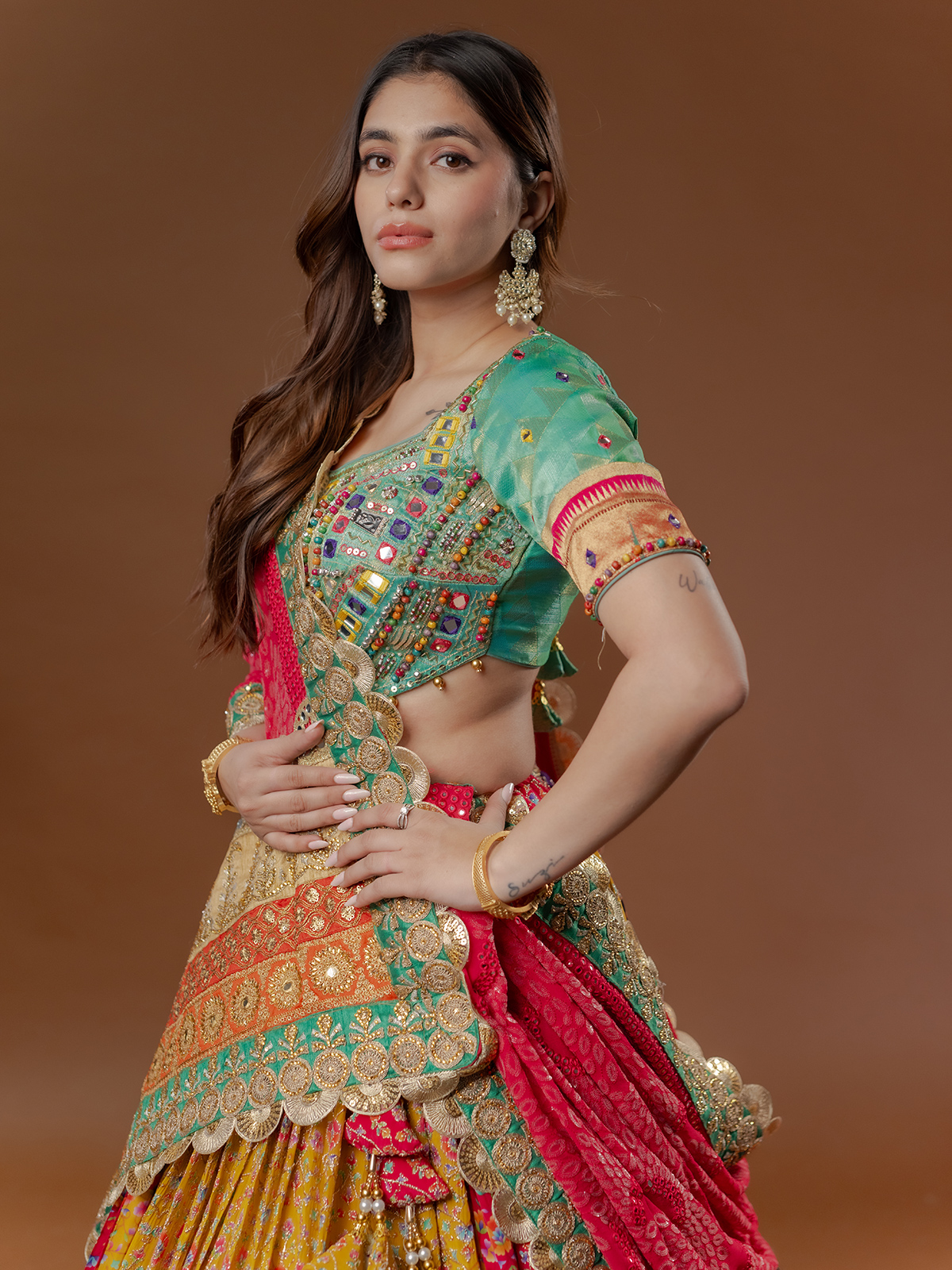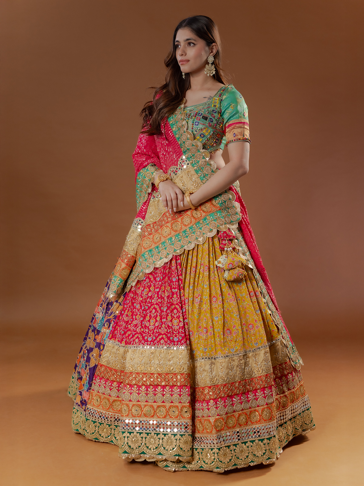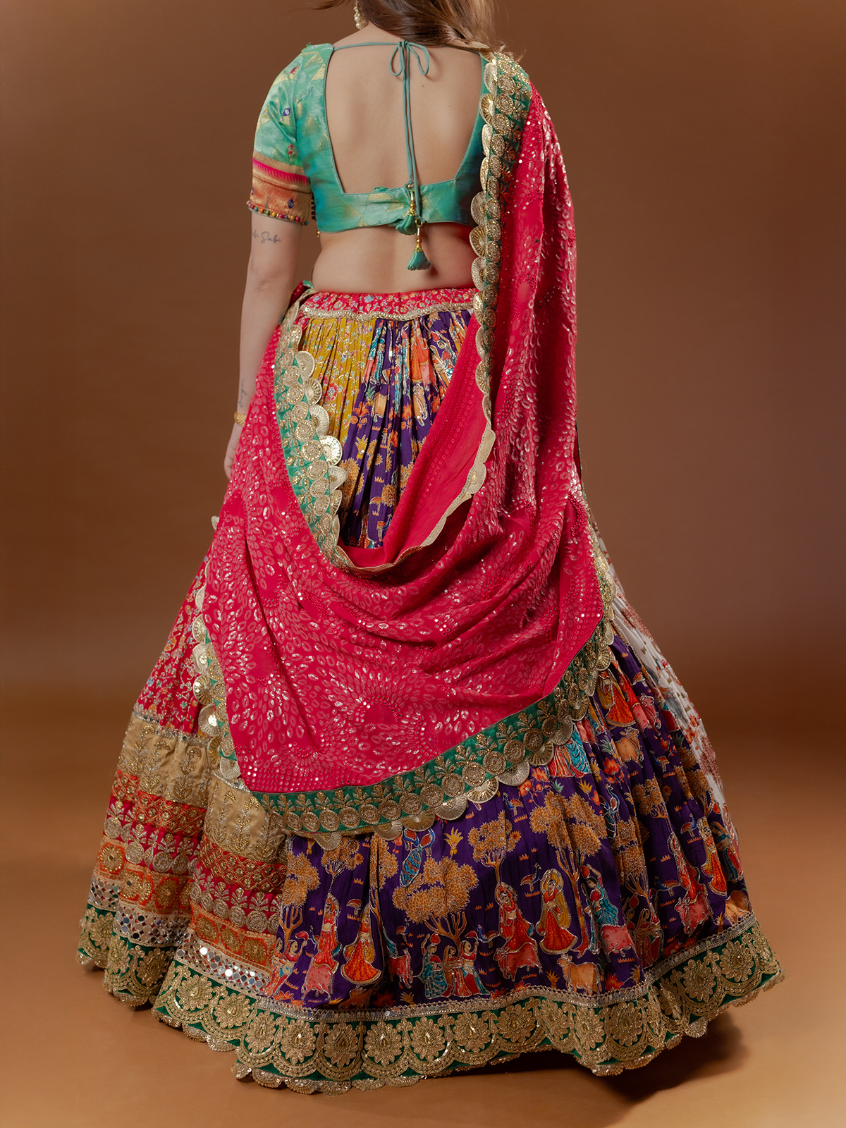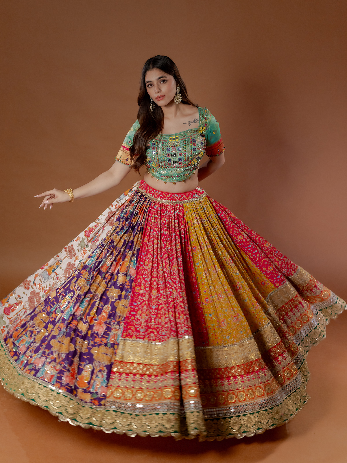 A riot of multi colours dances across pure silk, enriched with mirror, sequins, embroidery and appliqué accents. Digital prints flow into handworked lumpi and kiran lace borders, creating striking depth. The half-sleeve silhouette moves gracefully, while the coordinated dupatta adds festive rhythm, making it a radiant choice for sangeet and navratri celebrations.