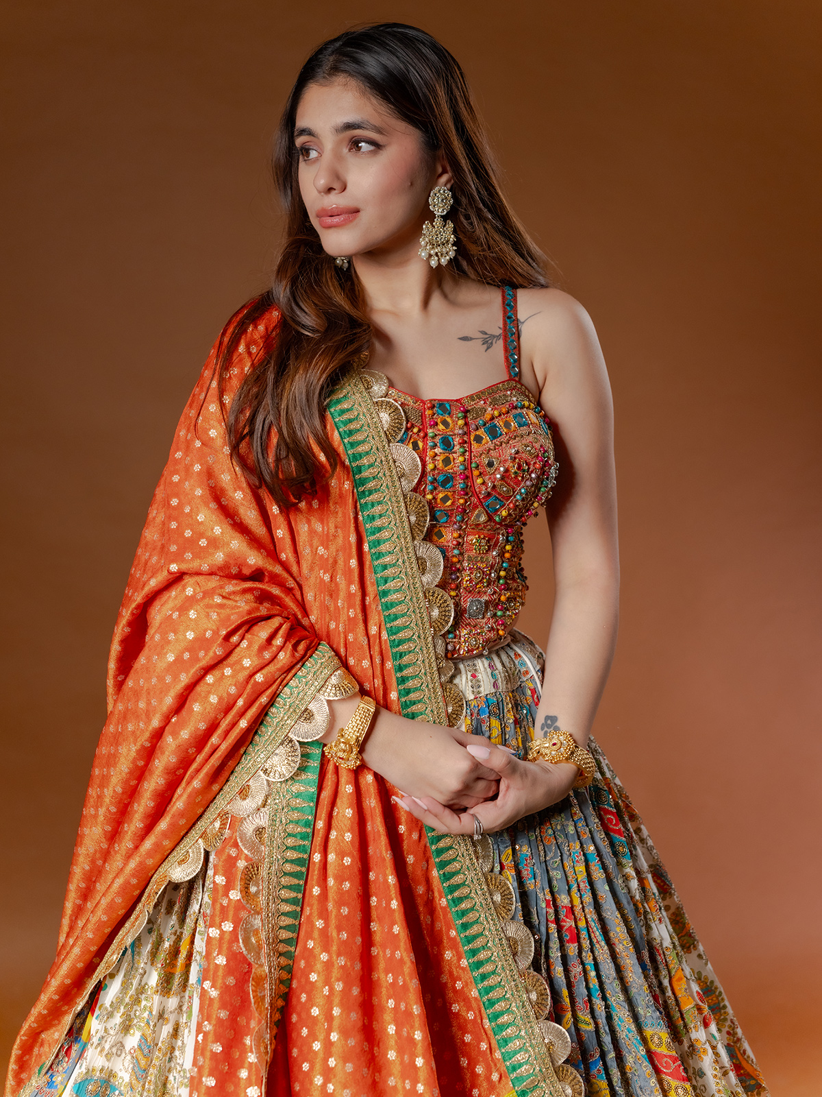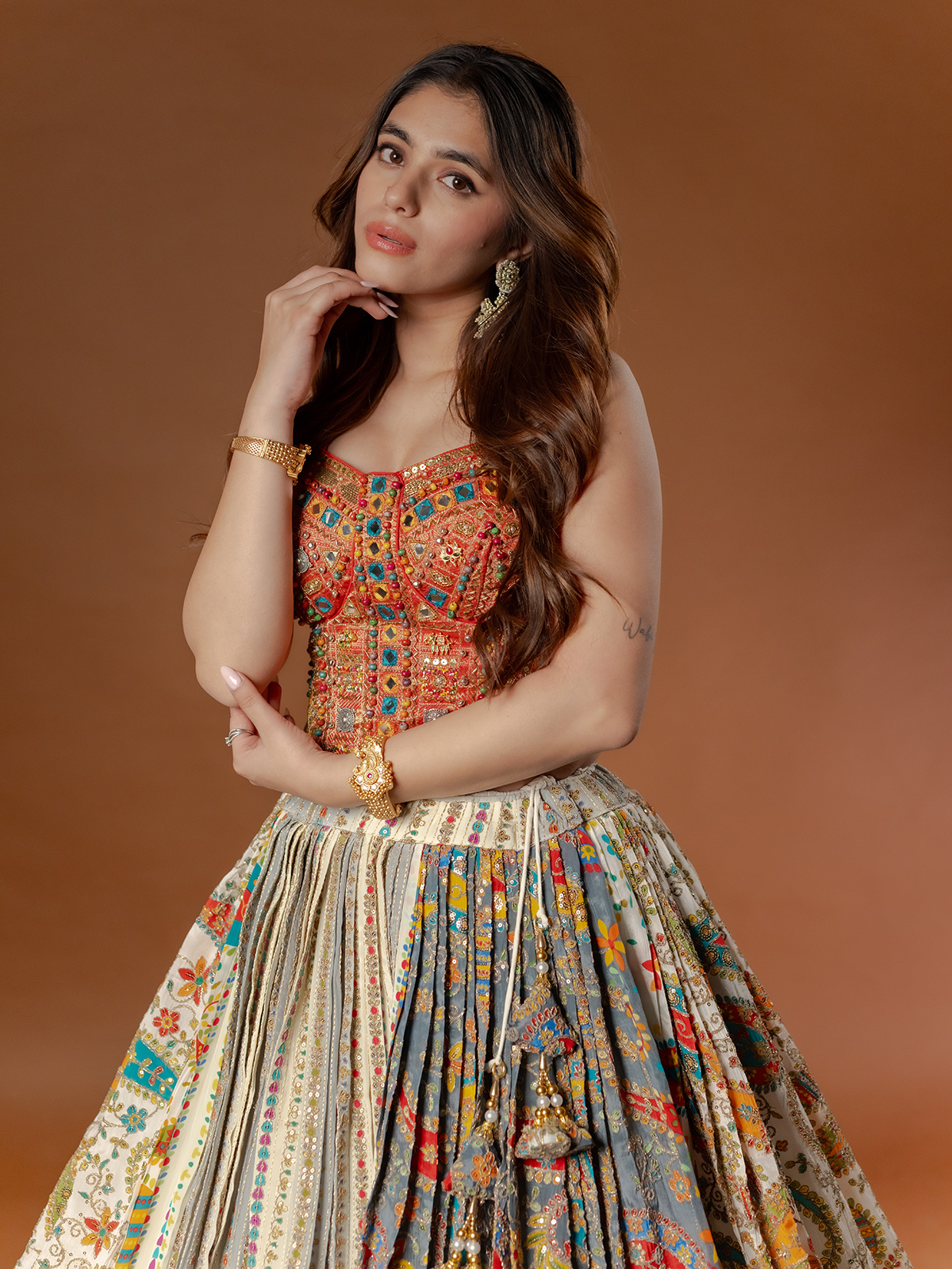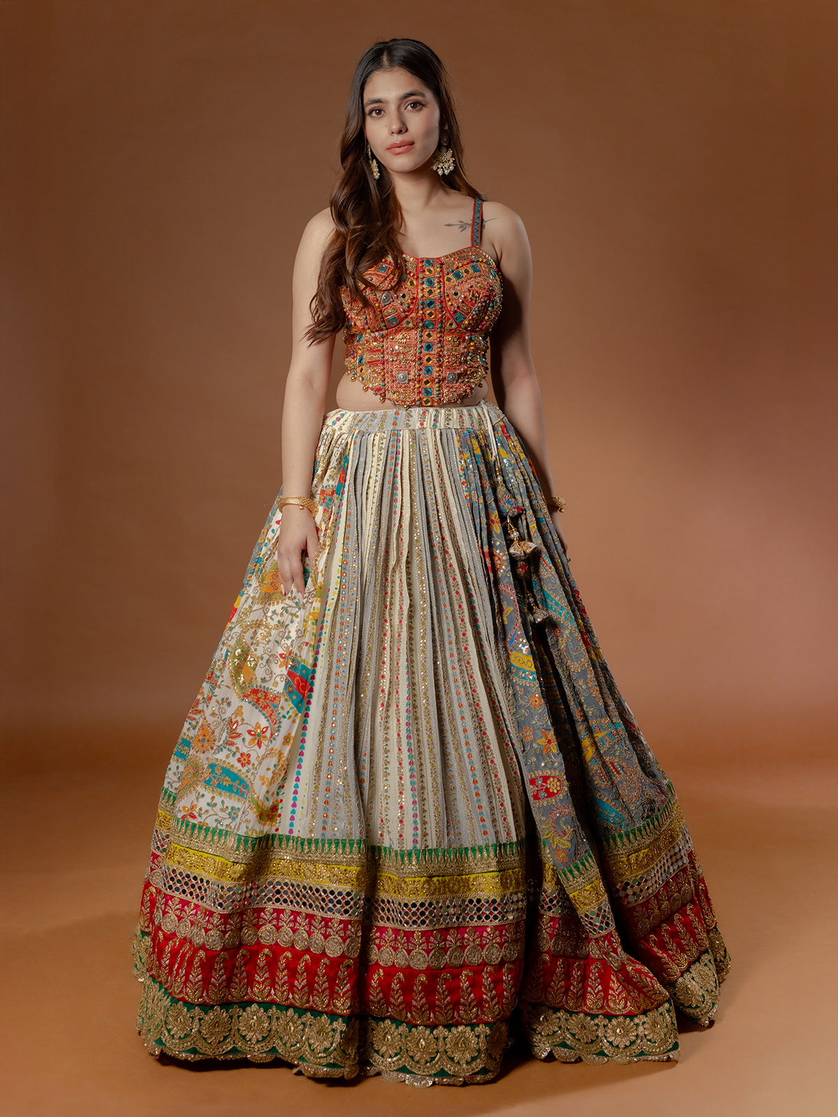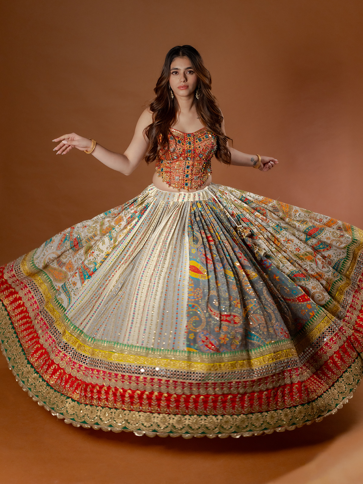 This multi colour sleeveless silk chaniya choli is adorned with cutdana, beads, sequins, zari and appliqué detailing. A richly flared lehenga showcases printed and embellished panels framed by ornate borders. The coordinated dupatta flows effortlessly, adding festive charm. Designed for movement and sparkle, it is perfect for sangeet nights and navratri festivities.