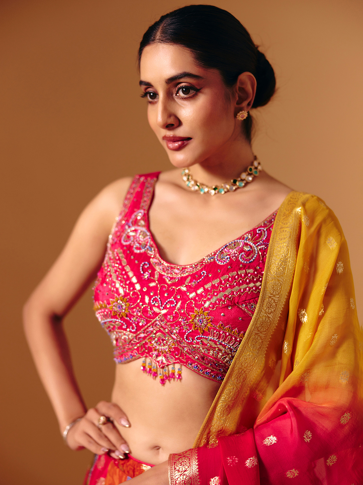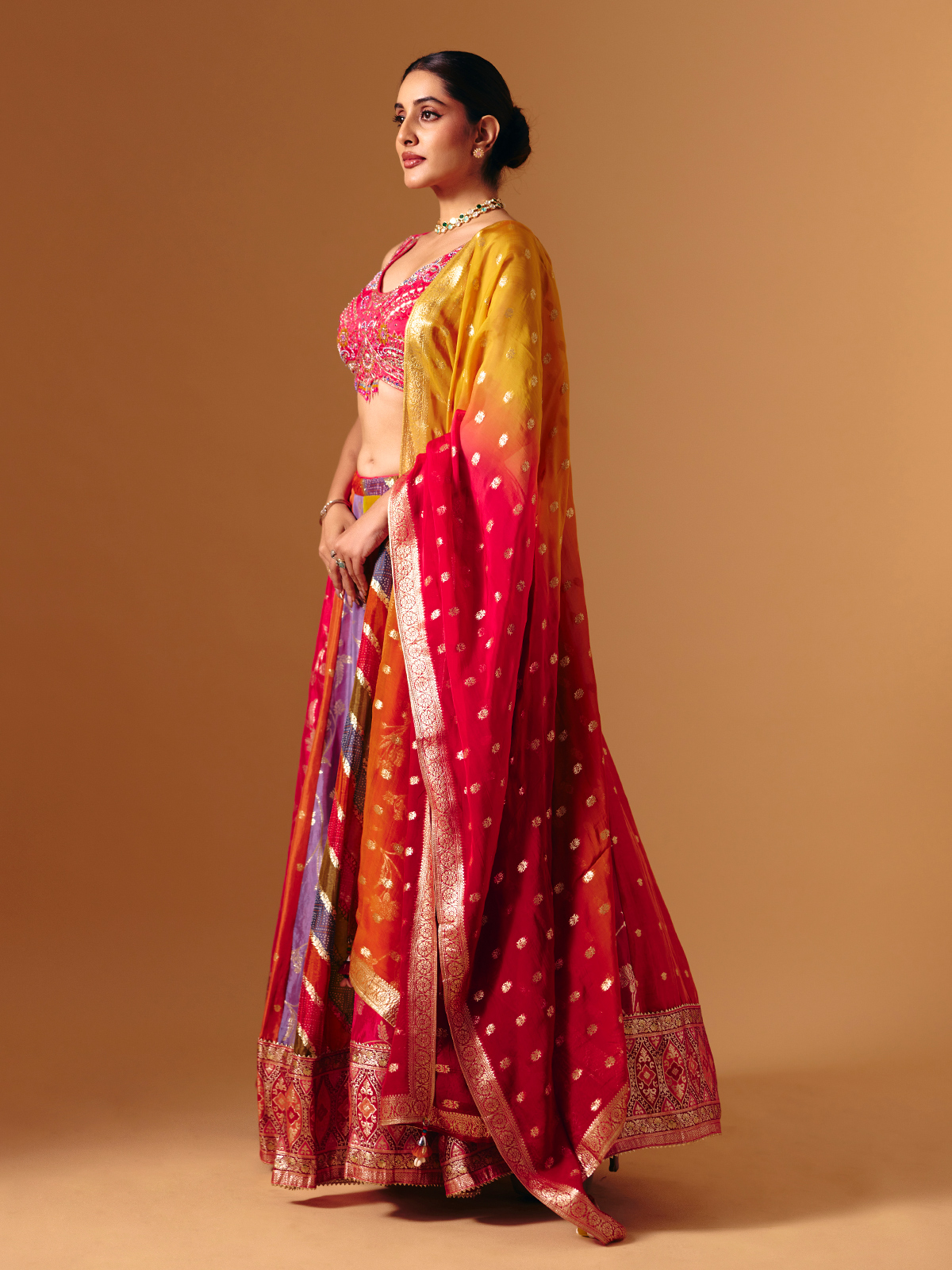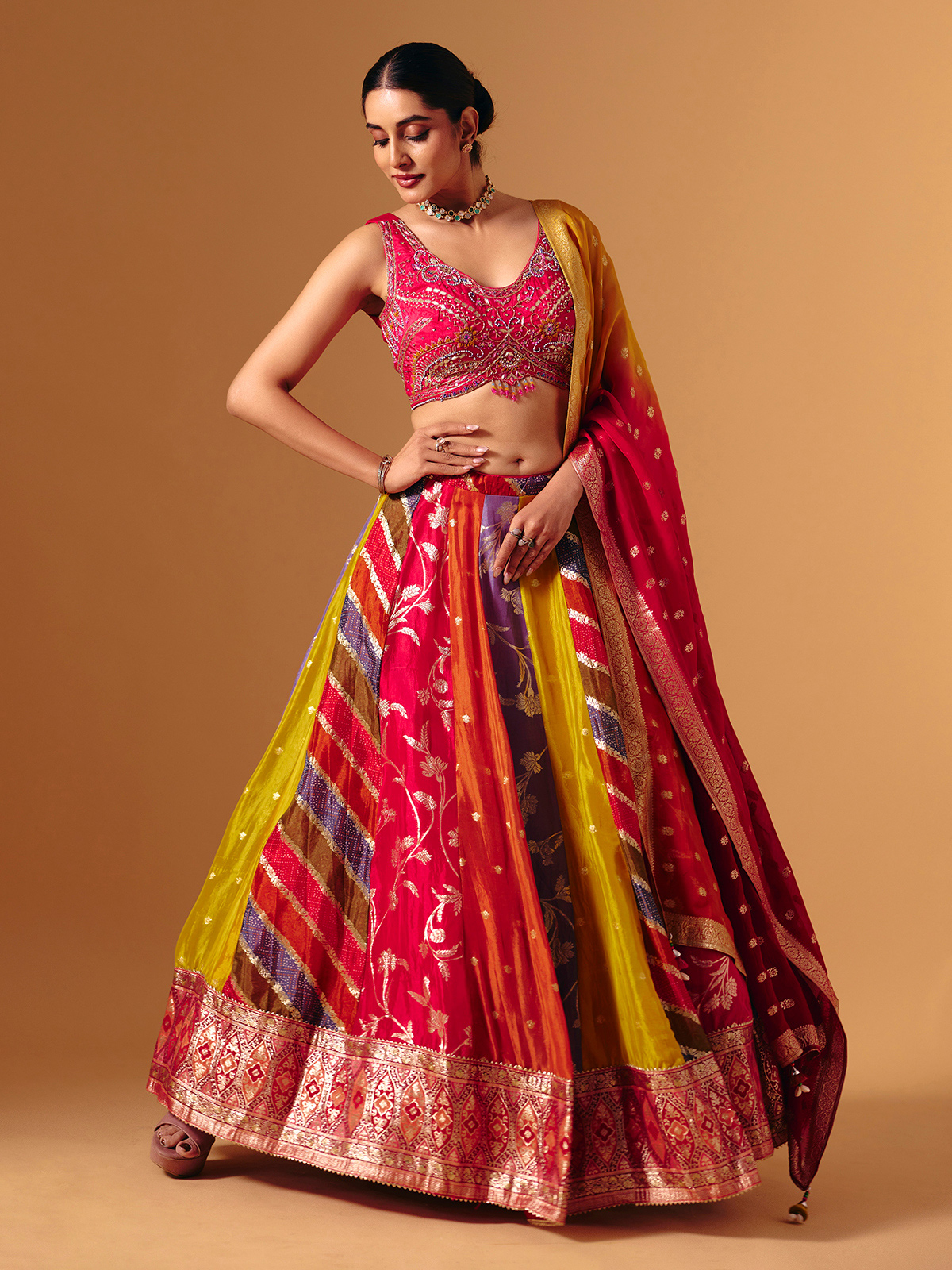 Woven in rich Banarasi silk, this multicolor lehenga choli is enhanced with intricate cutdana, sequins, beads, zardosi, thread and zari detailing. Designed with a U-shaped neckline and sleeveless choli, it is paired with a matching dupatta, ideal for weddings, receptions and lively sangeet celebrations.