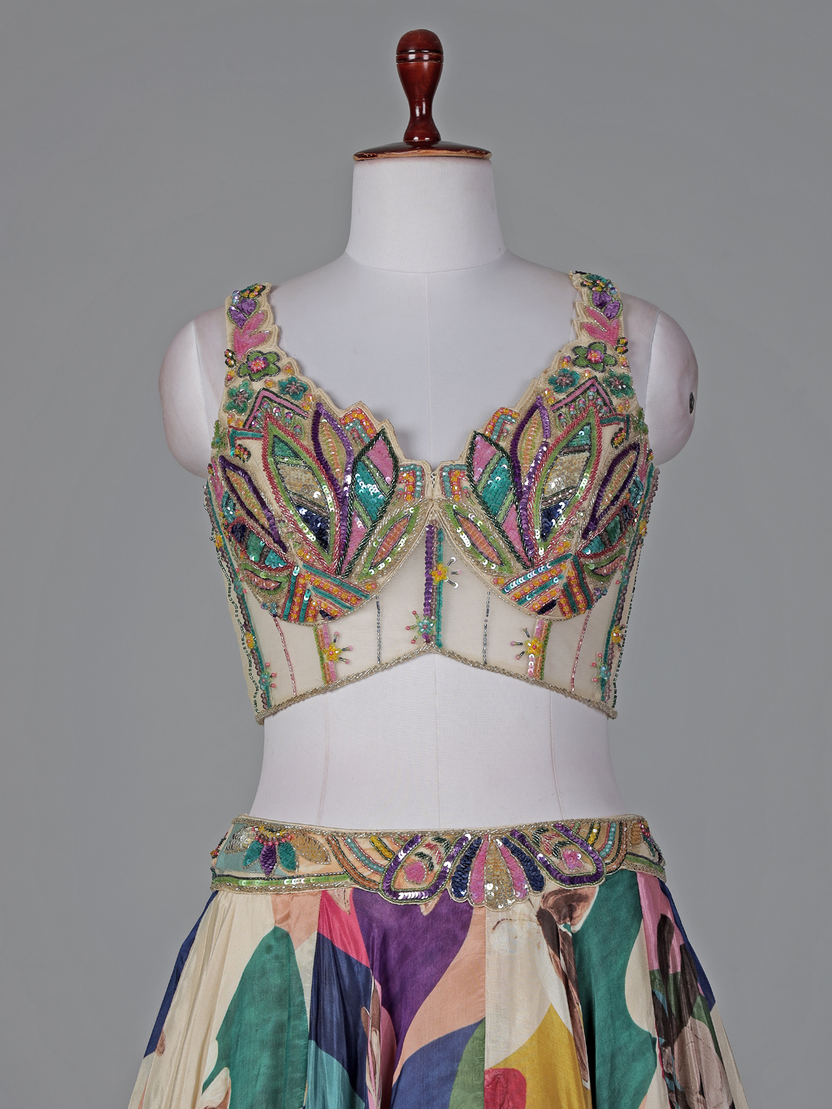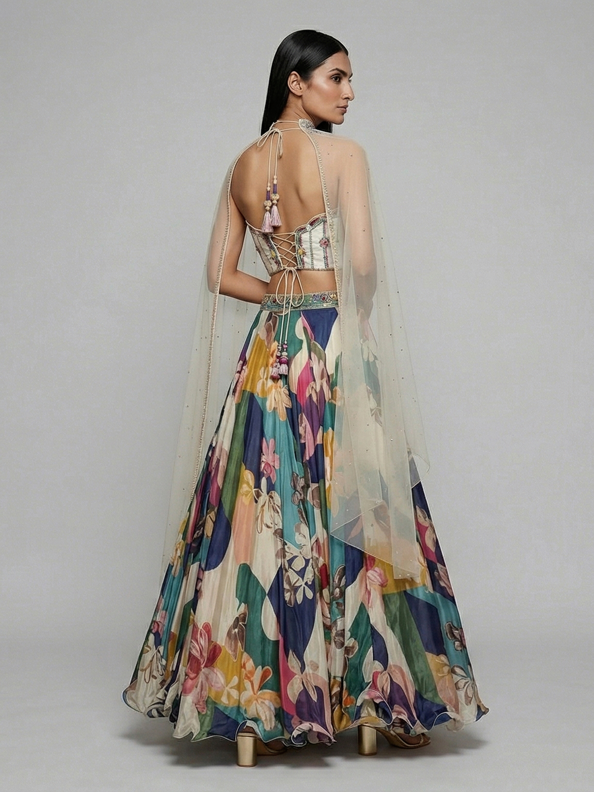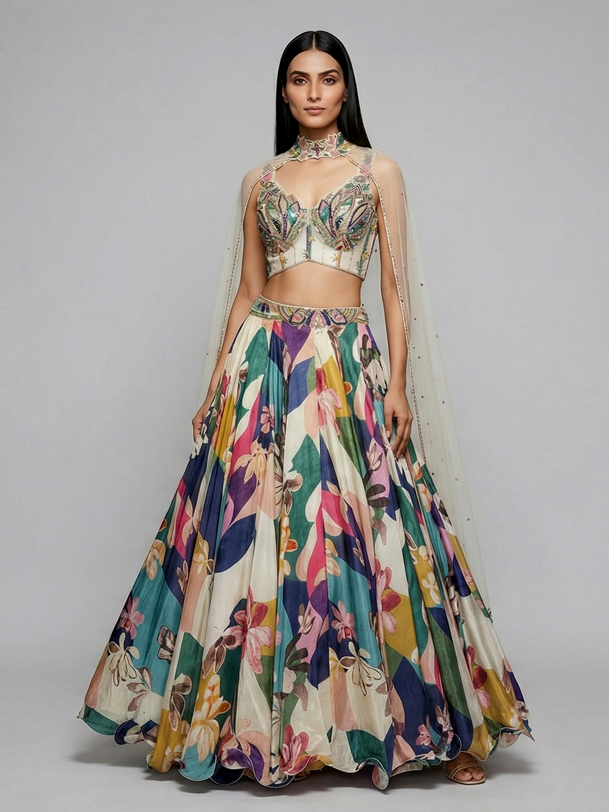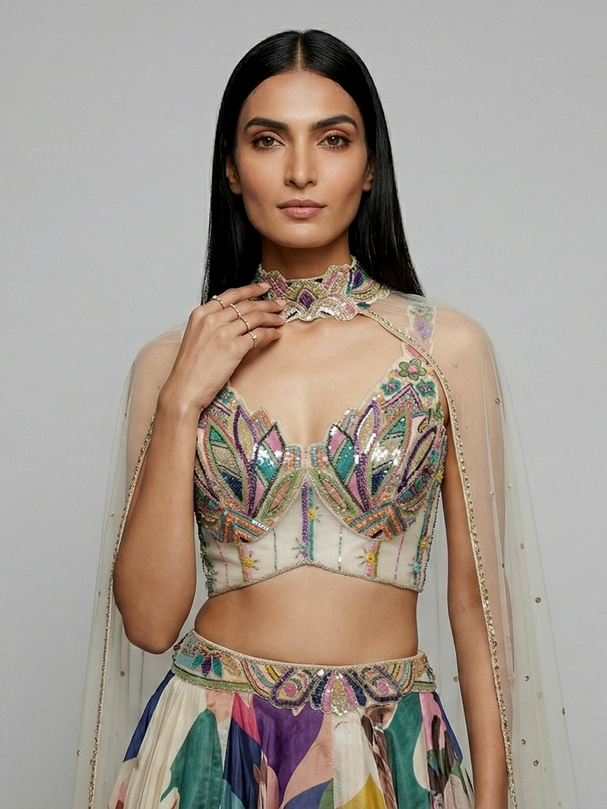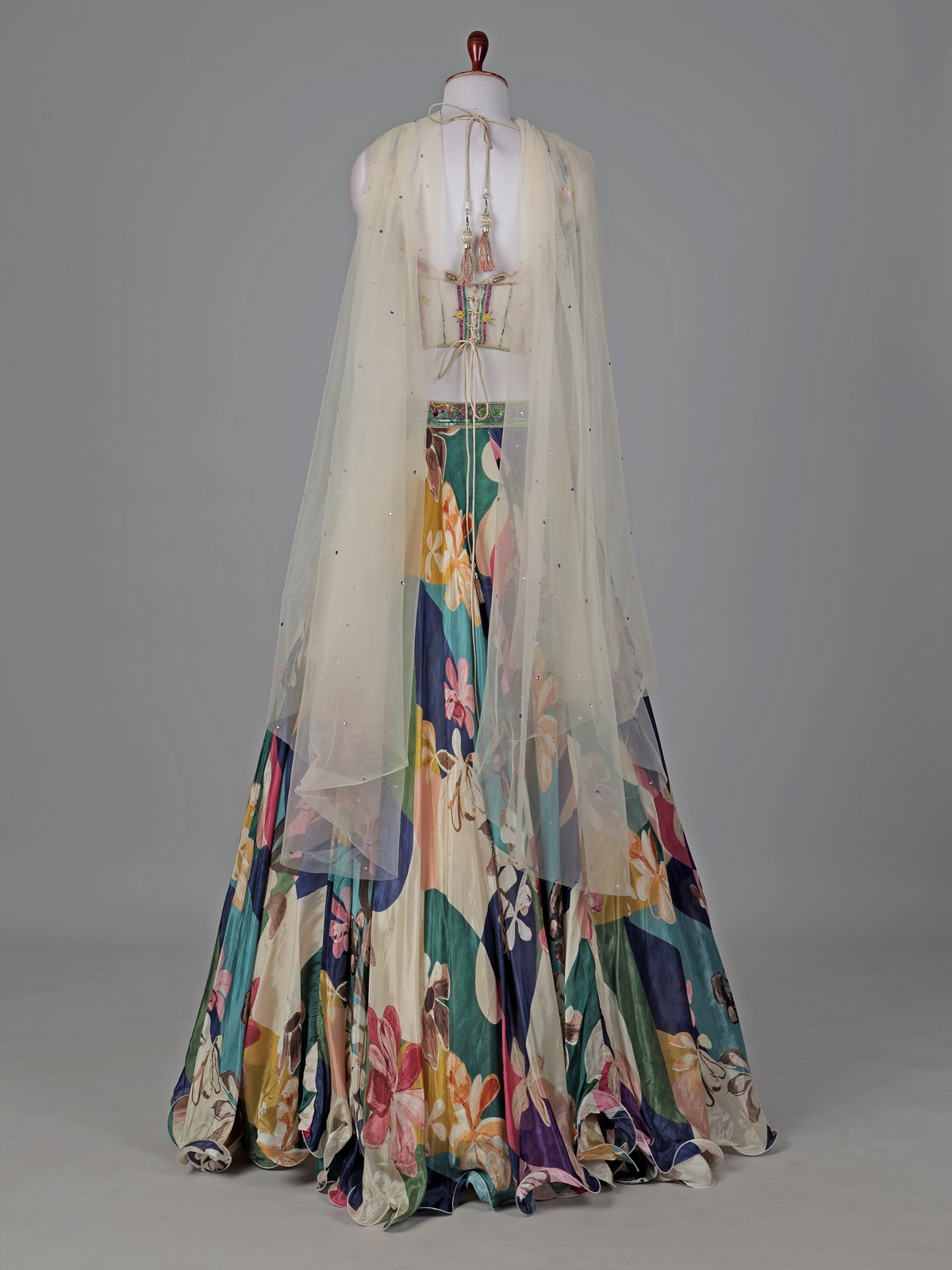 Vibrant multicolor bring life to this crepe silk lehenga choli. Enhanced with mirror, cutdana, sequins, beads and pearl detailing. The printed design with a sleeveless sweetheart blouse adds modern flair. Paired with a dupatta, it is perfect for weddings, sangeet and festive parties.