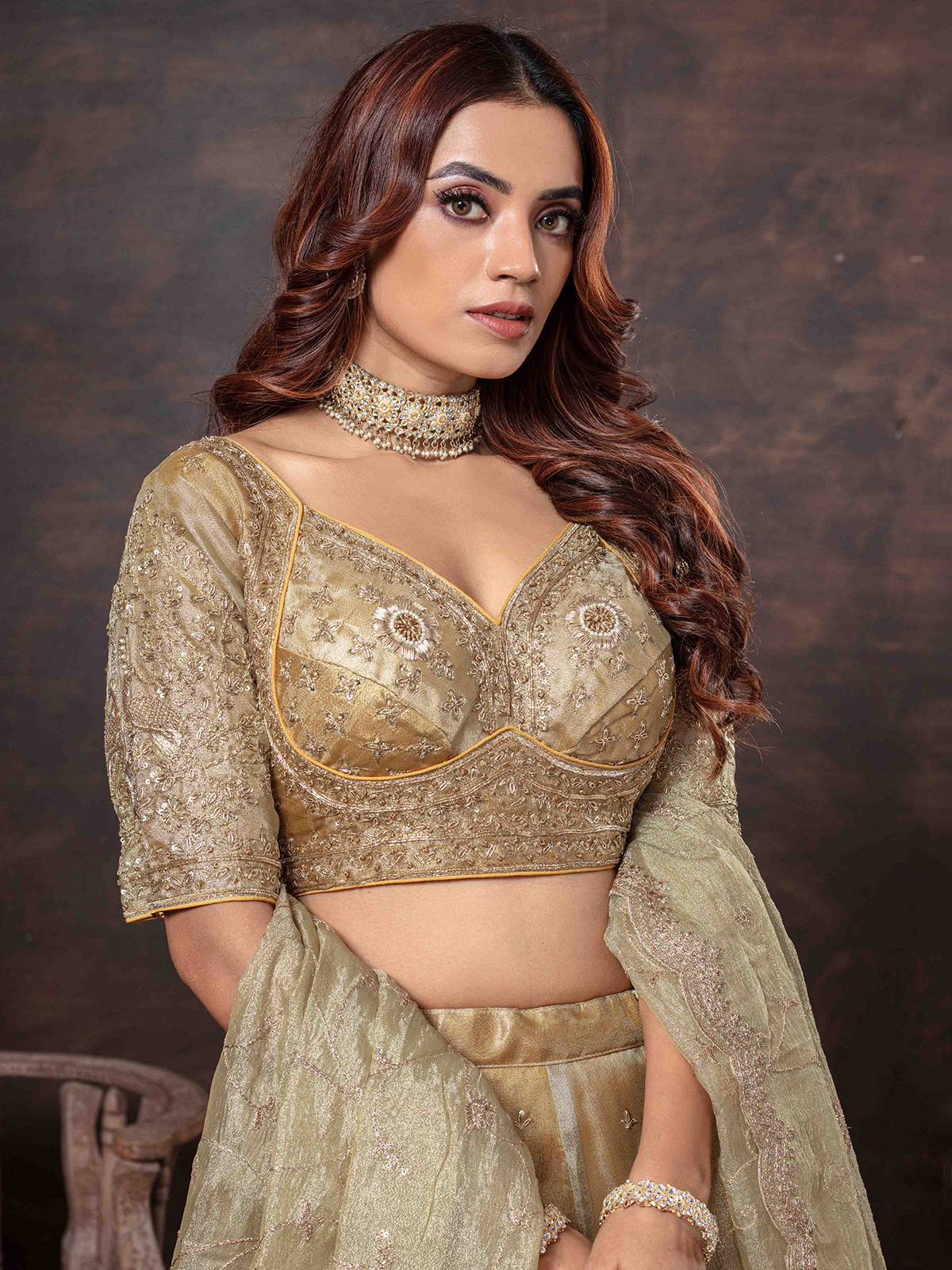 Vibrant multi-color tissue silk lehenga choli shimmering with zardosi, sequins, cutdana, and zari detailing. Designed with a sweetheart neckline and elbow sleeves, paired with a dupatta, it radiates festive splendor for weddings and receptions.